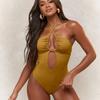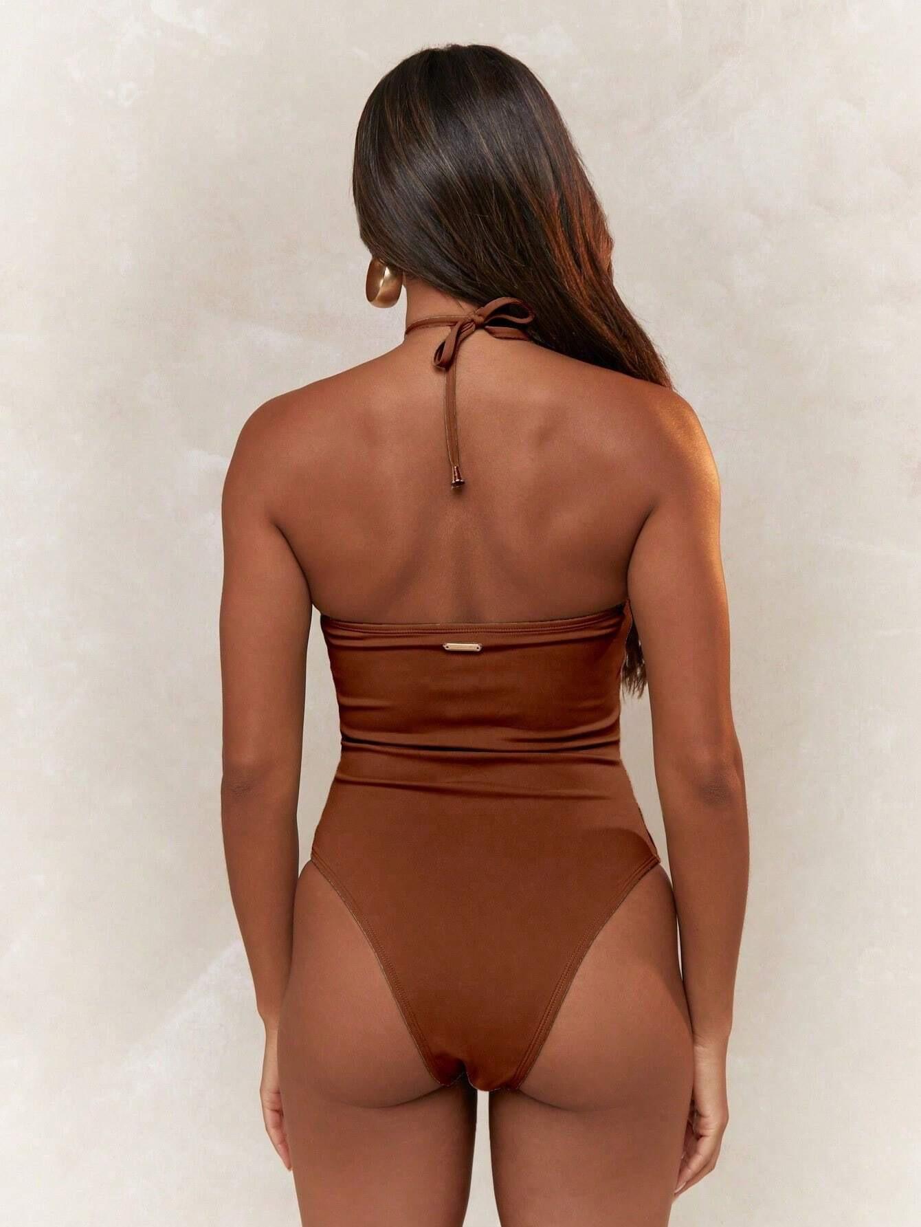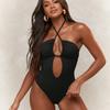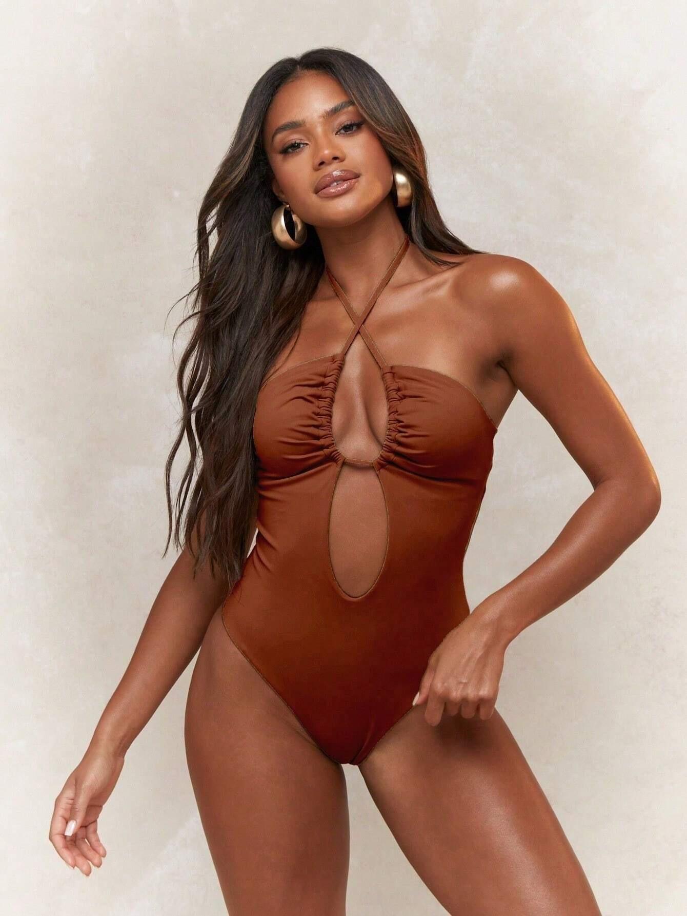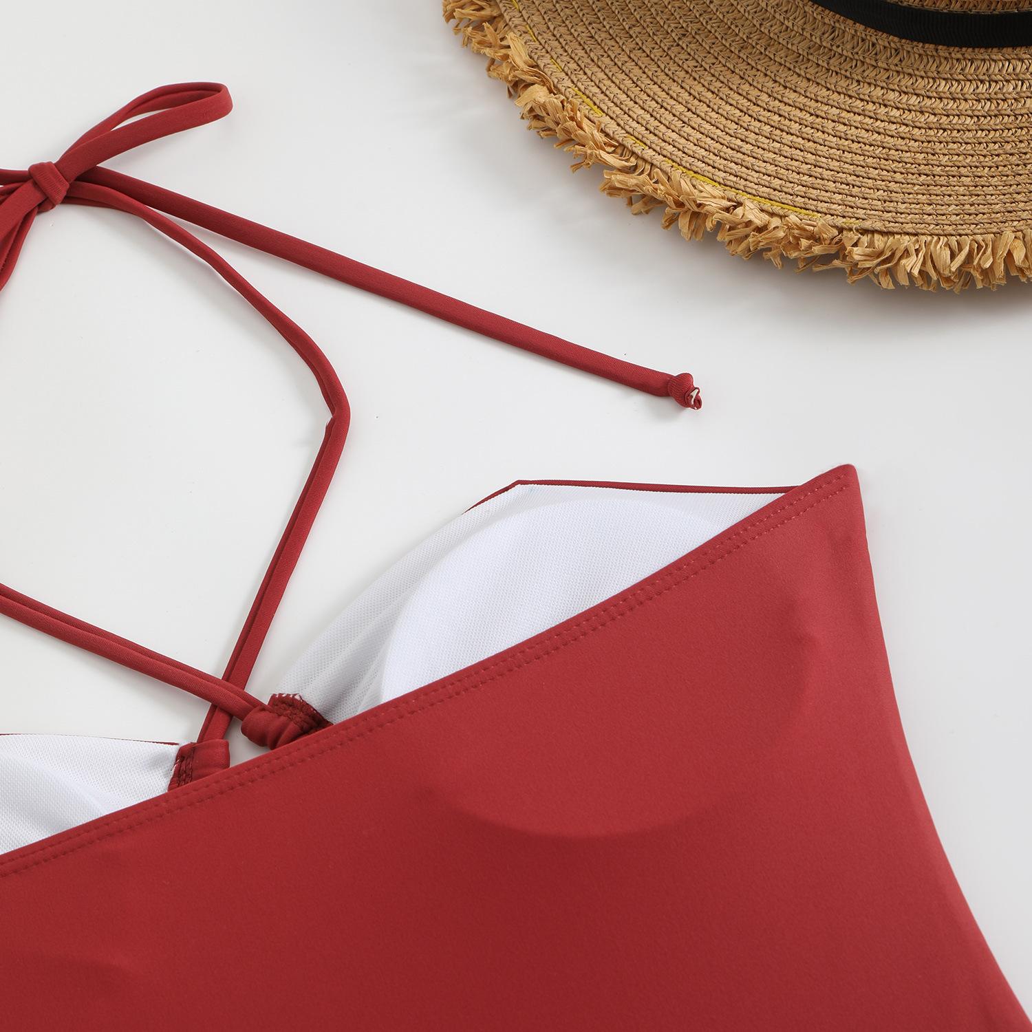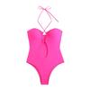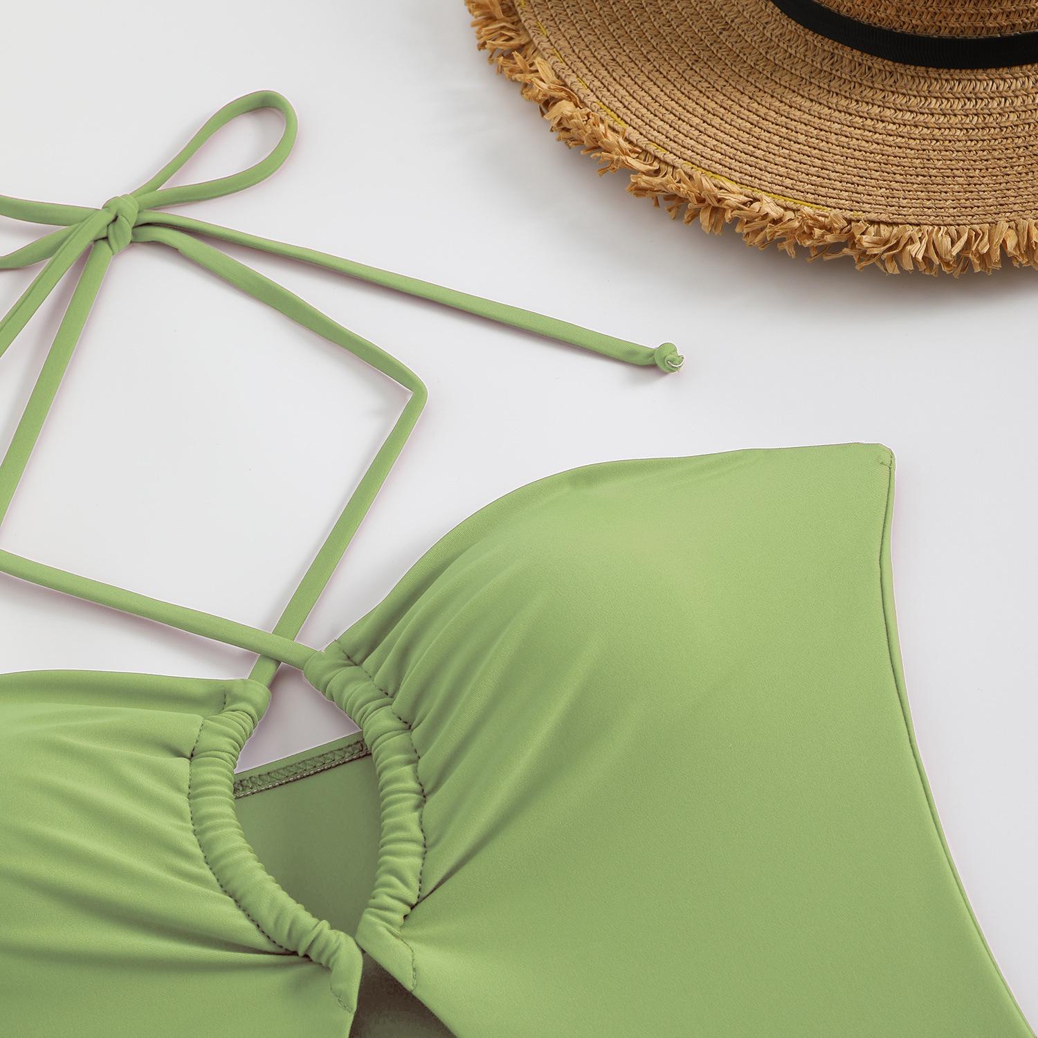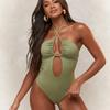 Traje de baño sexy de una pieza para mujer, 2025 Europa y Estados Unidos, comercio exterior transfronterizo, nuevo color sólido fruncido, cuello con cordones hueco, espalda descubierta