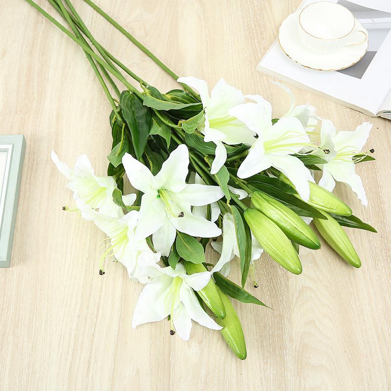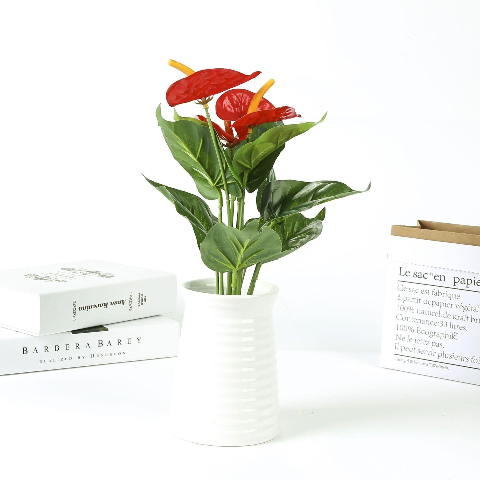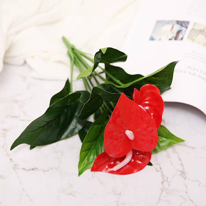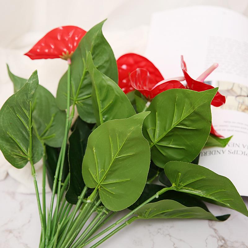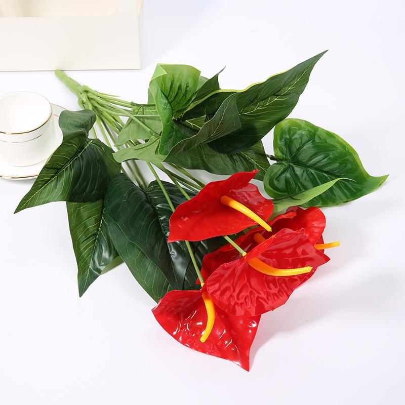 Especificaciones: Un ramo de flores de 32 cm de largo, 9 hojas, 3 anturios.