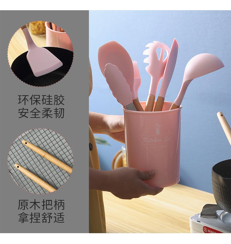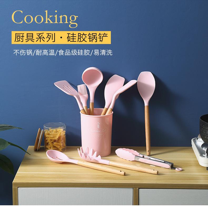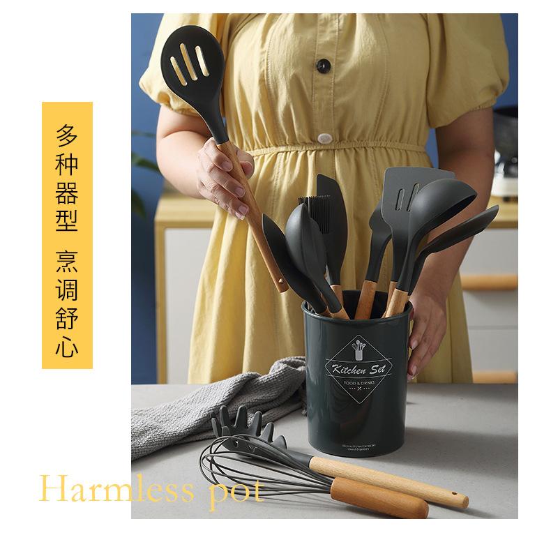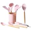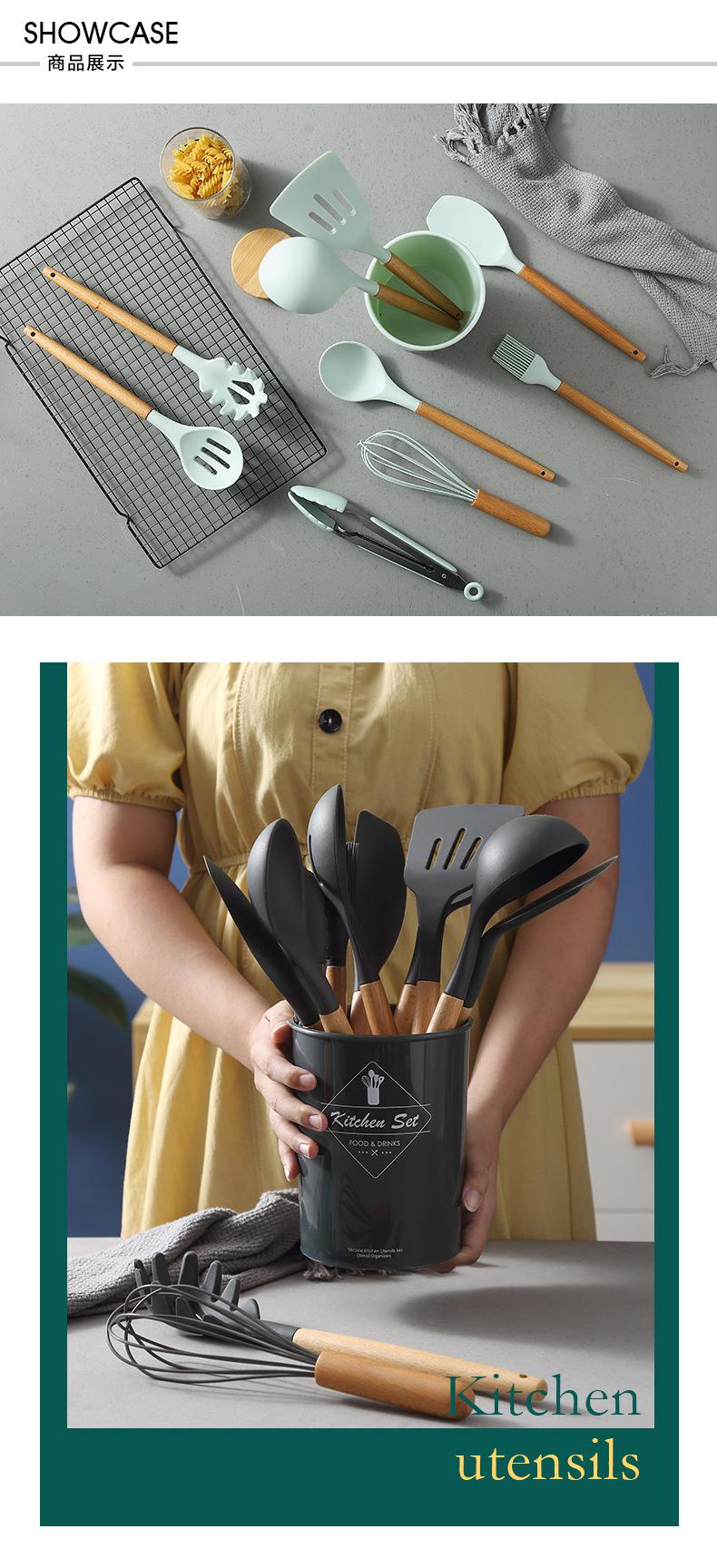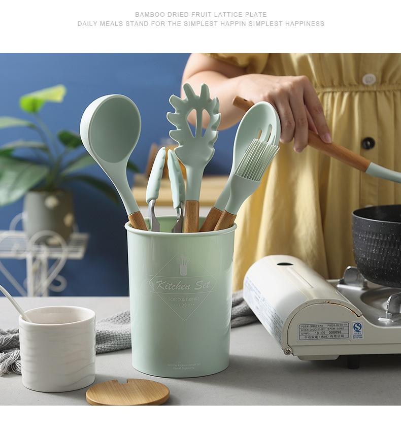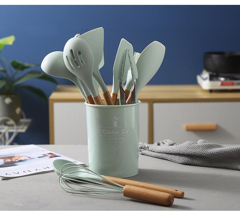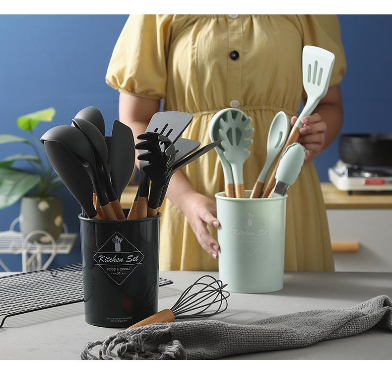 Juego de 11 utensilios de cocina de silicona con mango de madera, fácil de almacenar y cocinar en la cocina.