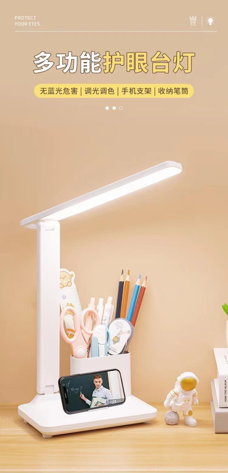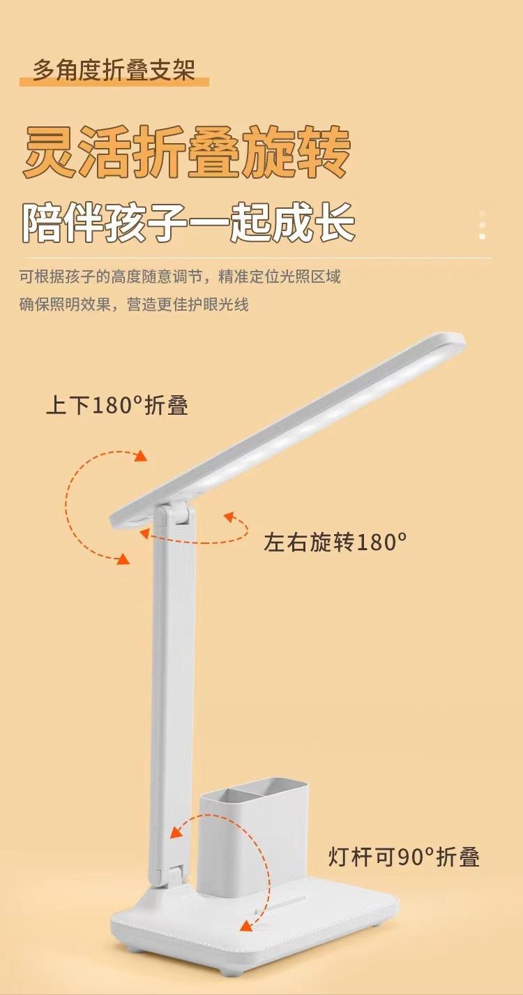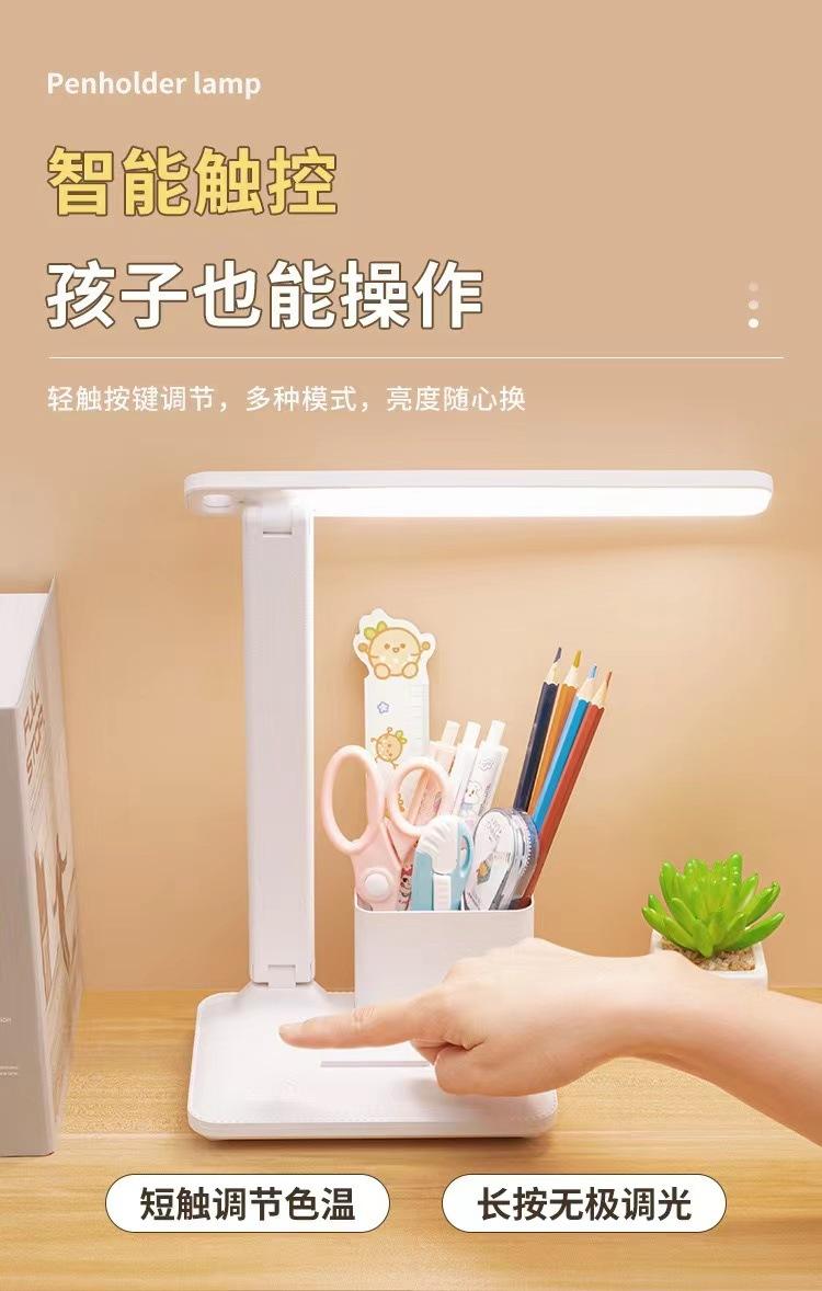 Compra Lámpara de escritorio plegable de doble cabeza con soporte para bolígrafos táctil, protección ocular, atenuación, carga, giratoria, para aprendizaje en dormitorio, enchufable, lectura, estudiante al por mayor en Joom.pro