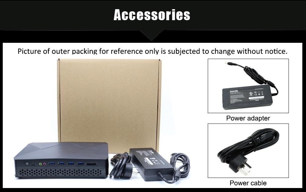 1 x mini pc, 1 power adapter, 1 power cord, 1 x screw bags