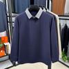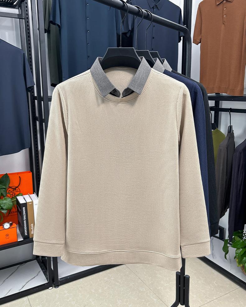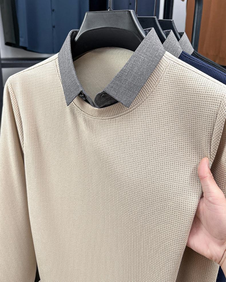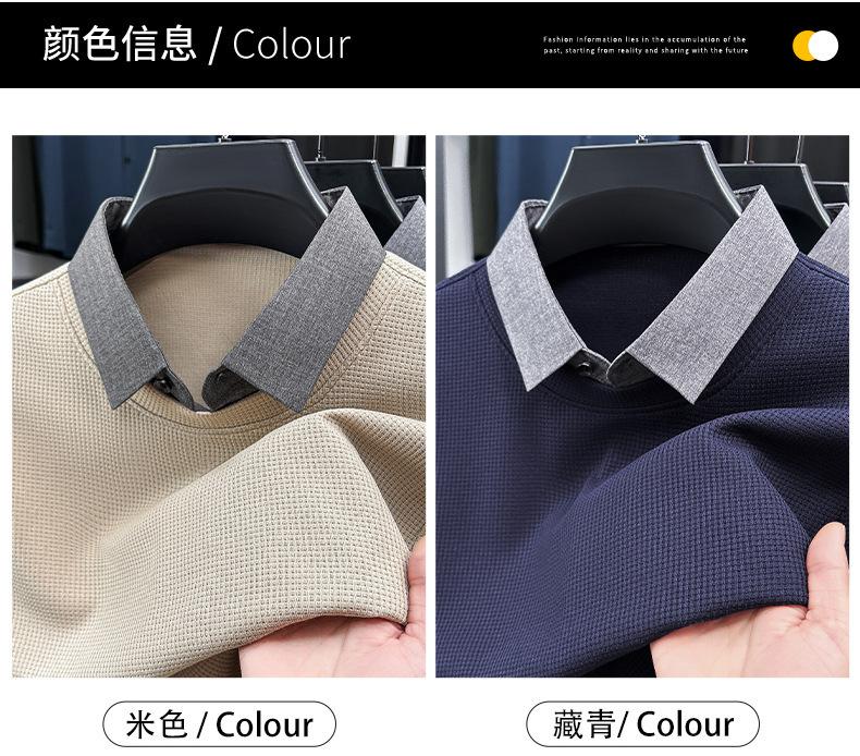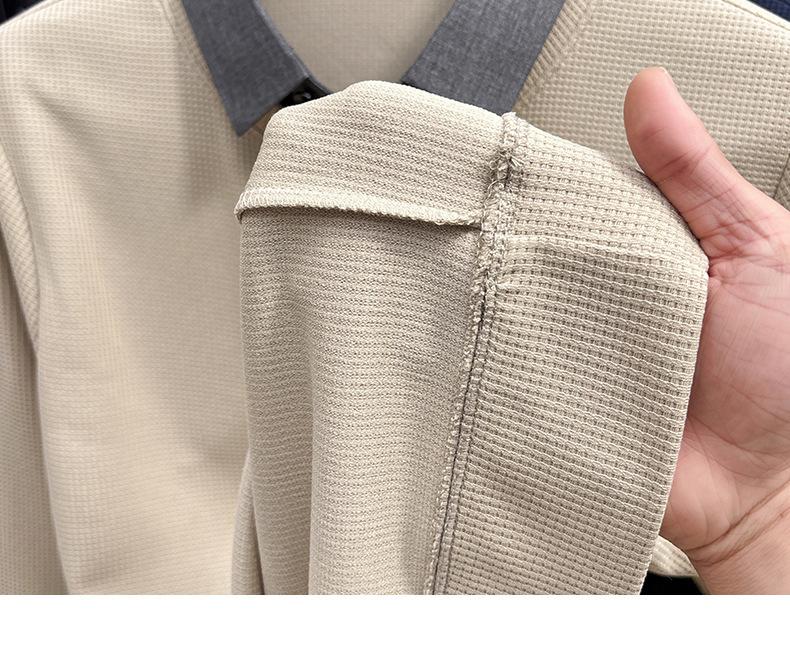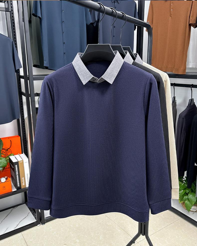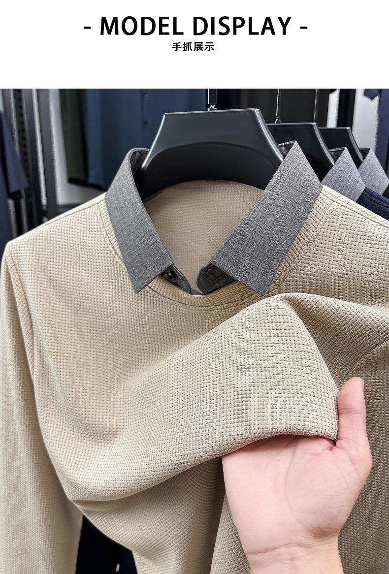 2025 Nuevo Primavera y Otoño para Hombre Falso Dos Piezas Color Sólido Tejido de Punto Negocios Casual Cuello de Camisa Manga Larga Sudadera Camiseta