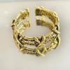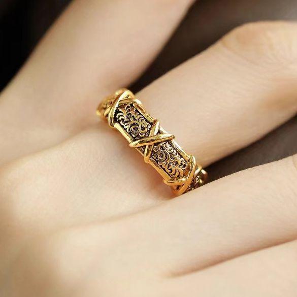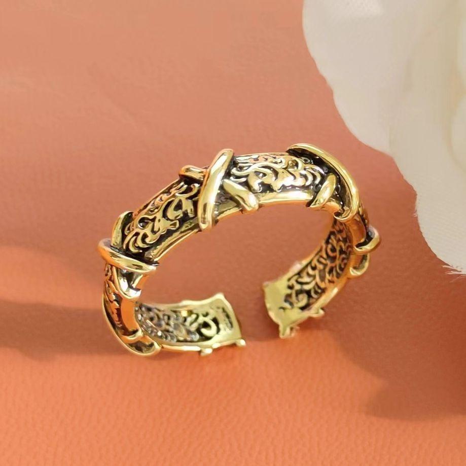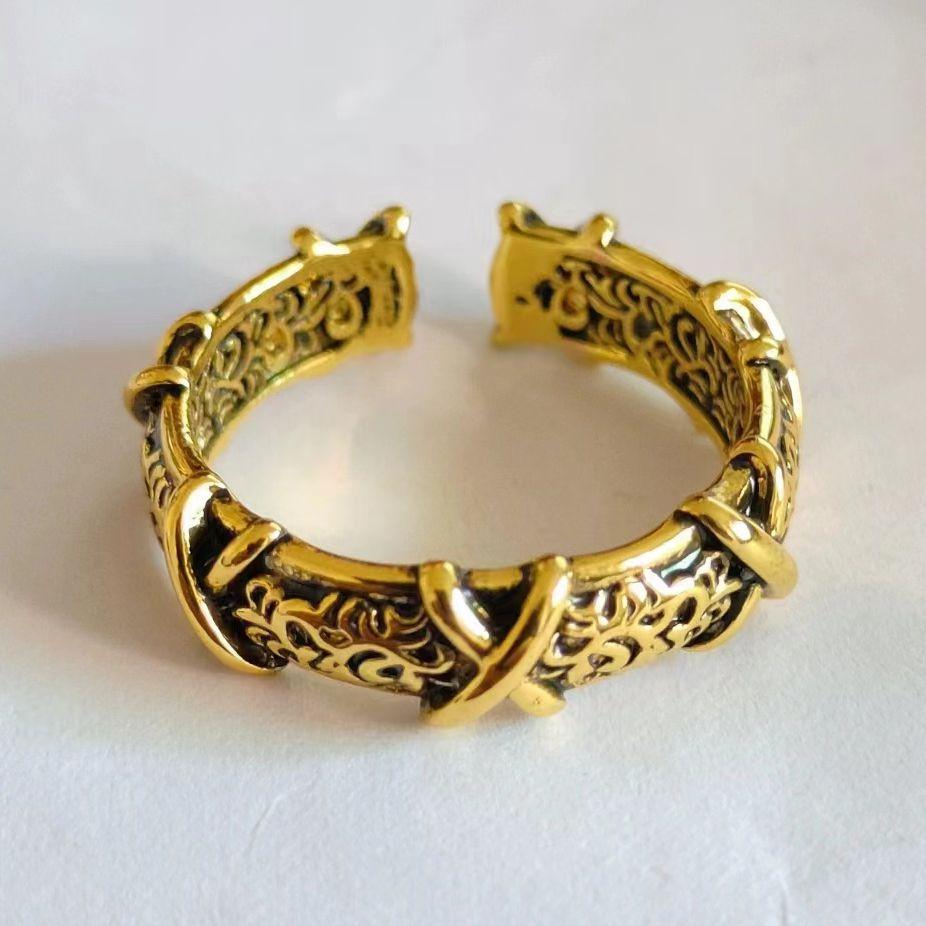 Anillo vintage dorado con diseño de cruz de hierba Tang, anillo abierto ligero y desgastado de moda para mujer, anillo distintivo que combina con todo.