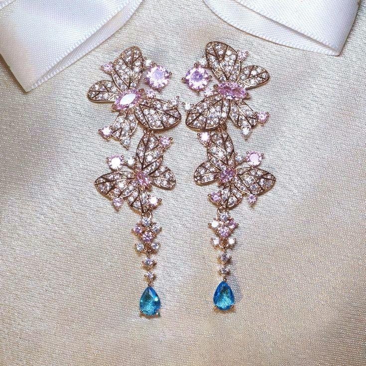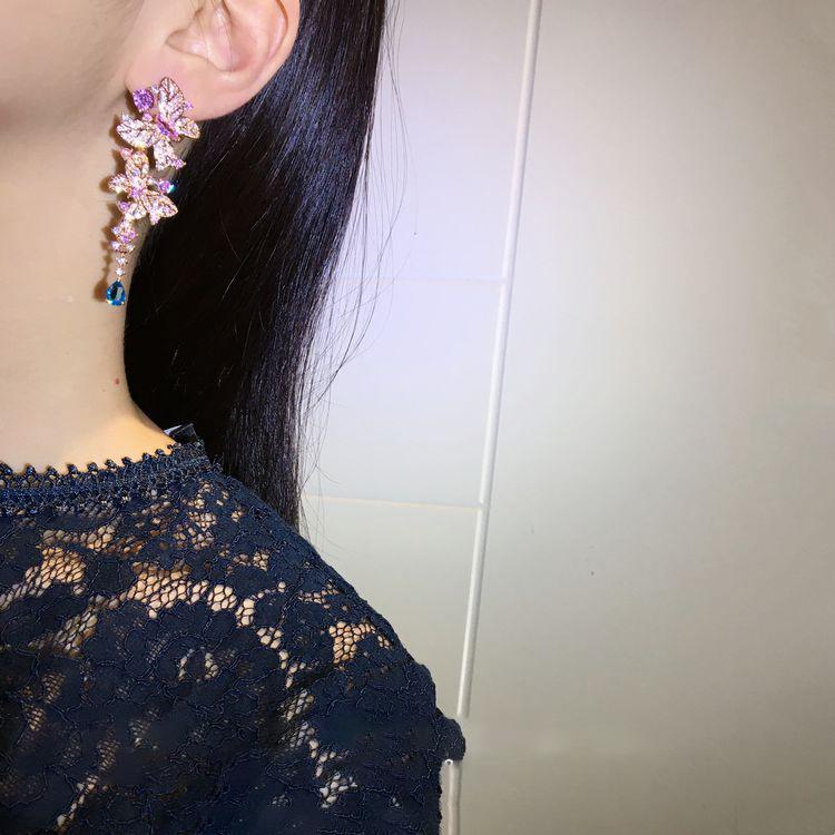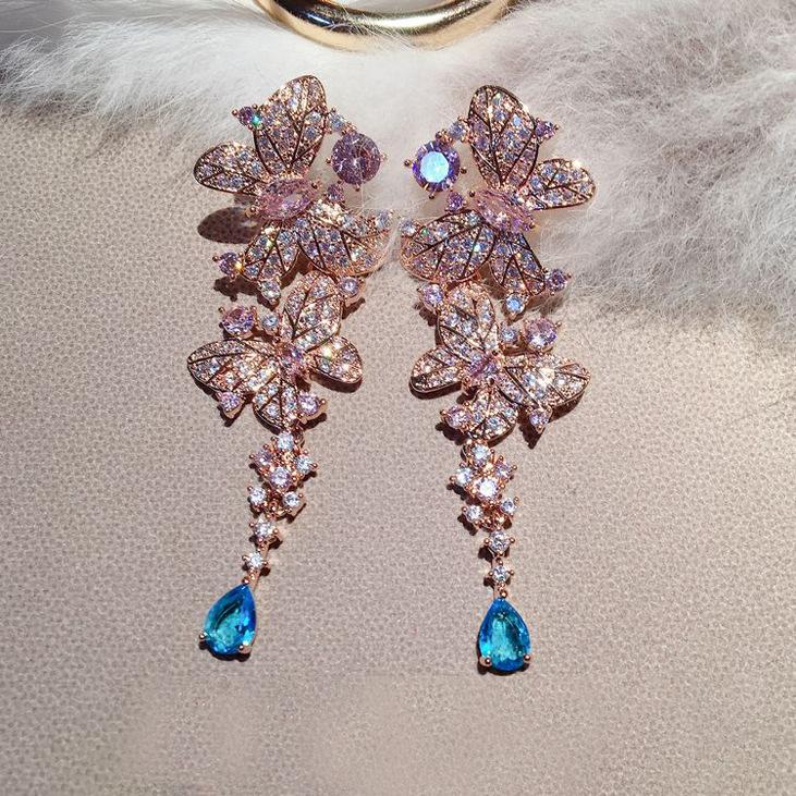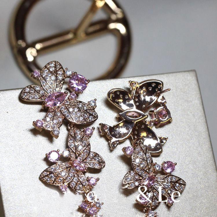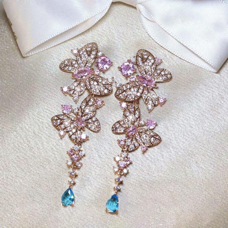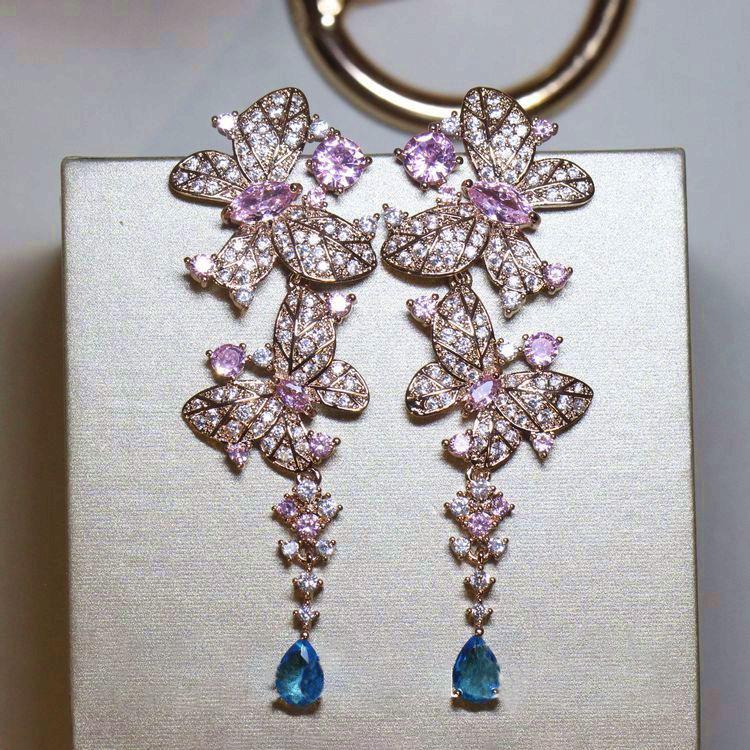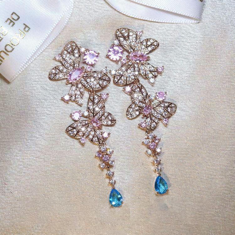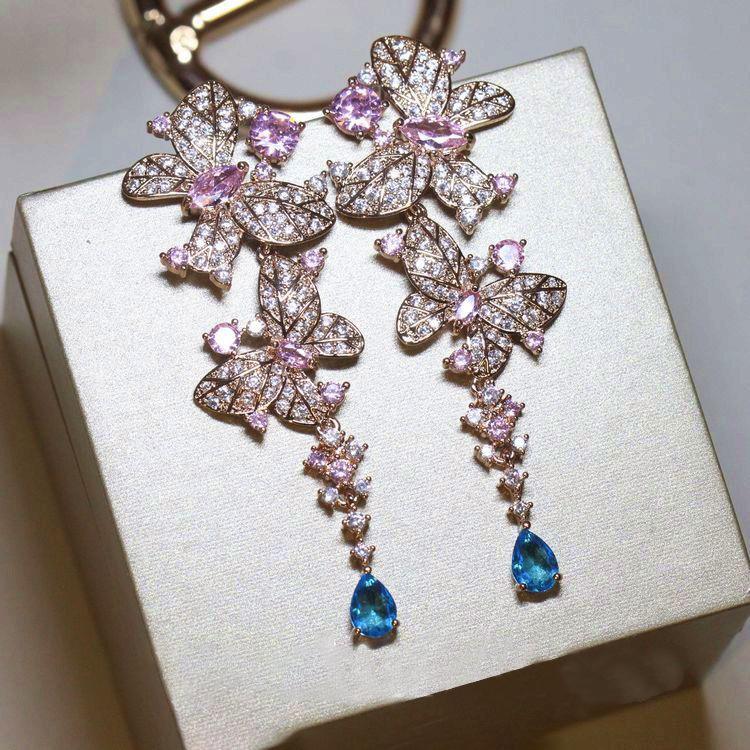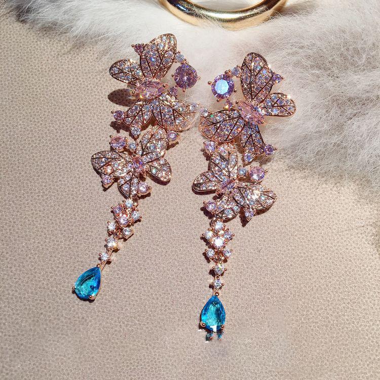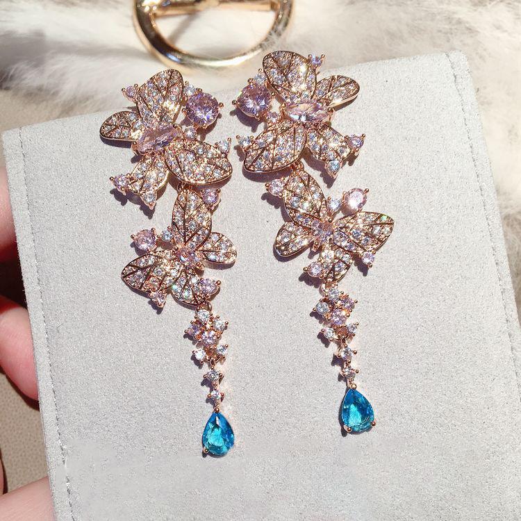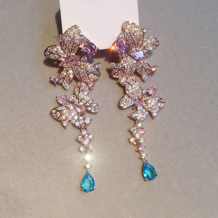 Pendientes de borla con forma de mariposa y gotas de agua de diamante con alfiler de plata, elegantes, estilo retro francés, ligeros, de lujo, personalizados, de alta gama para mujer.