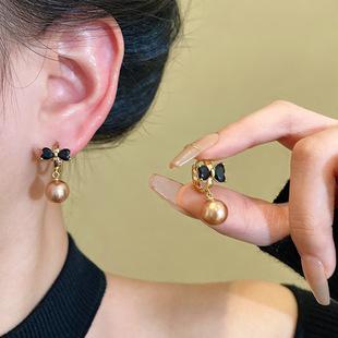 Pendientes de lazo con temperamento francés para mujer, nicho de alta gama, pendientes de perlas color champán, pendientes de personalidad a la moda