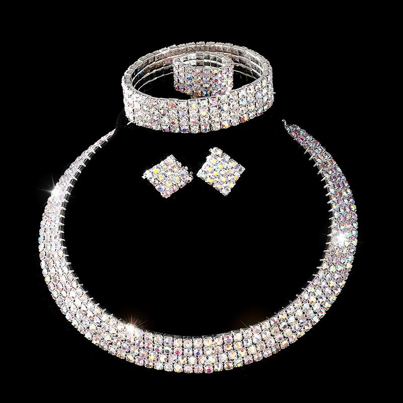 [Nombre del bebé] Conjunto de collar, pendientes, anillo y pulsera de cuatro piezas de moda transfronteriza europea y americana con cuello de tres filas de diamantes y traje de novia femenino