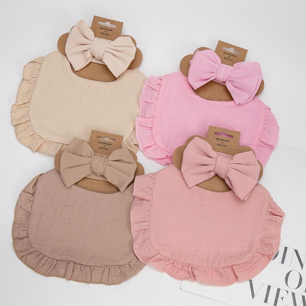 Nuevo conjunto de babero para niños con volantes de color sólido europeo y americano, diadema de lazo elástico para bebé, conjunto de dos piezas de baberoGran precio:¥10.2