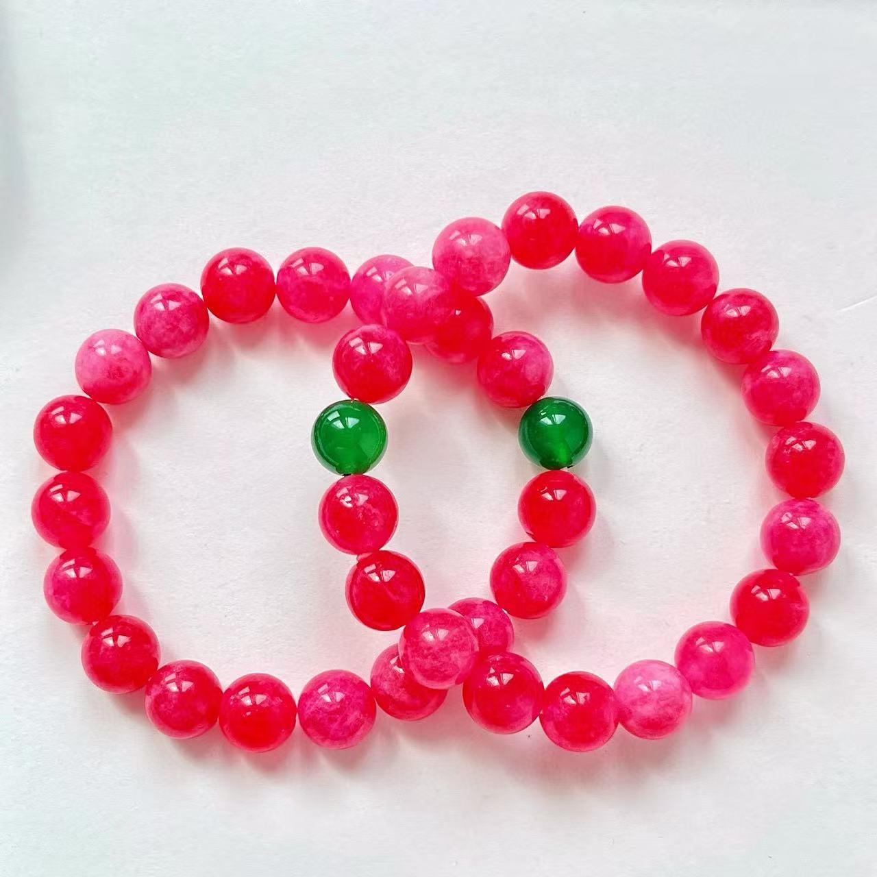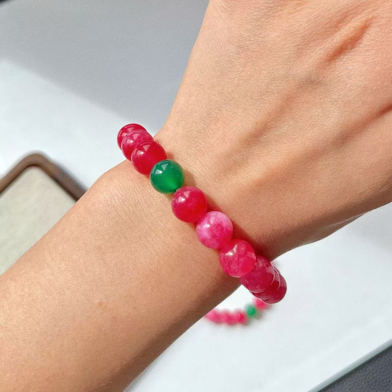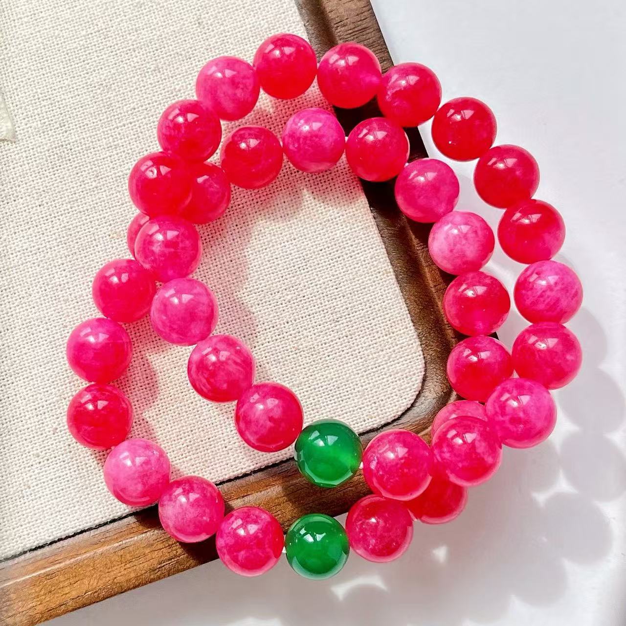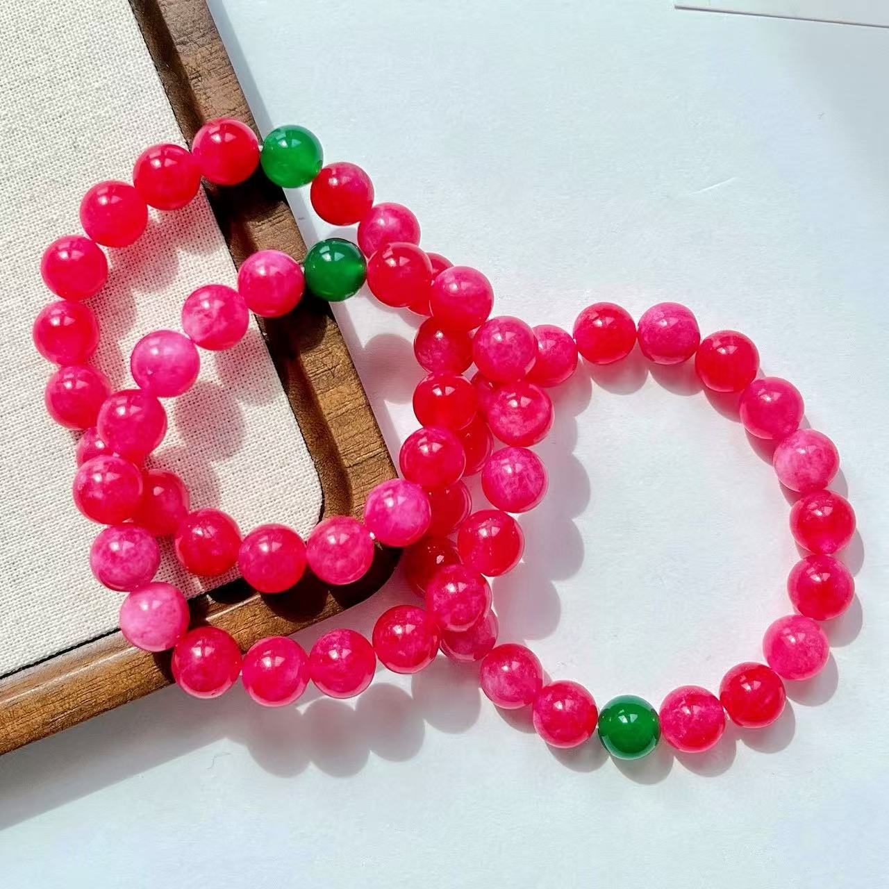Pulsera de diseño retro Guofeng con cuarcita color rubí y calcedonia verde natural en contraste.