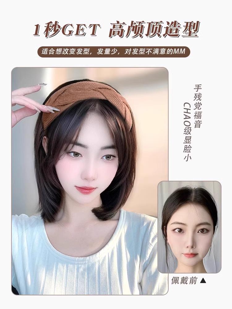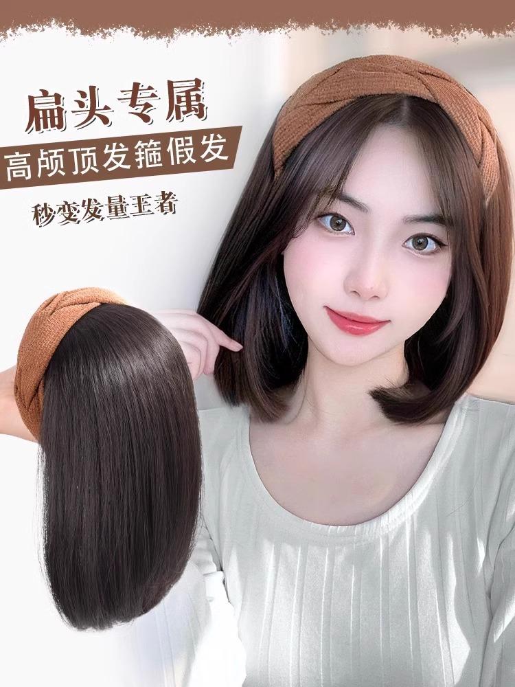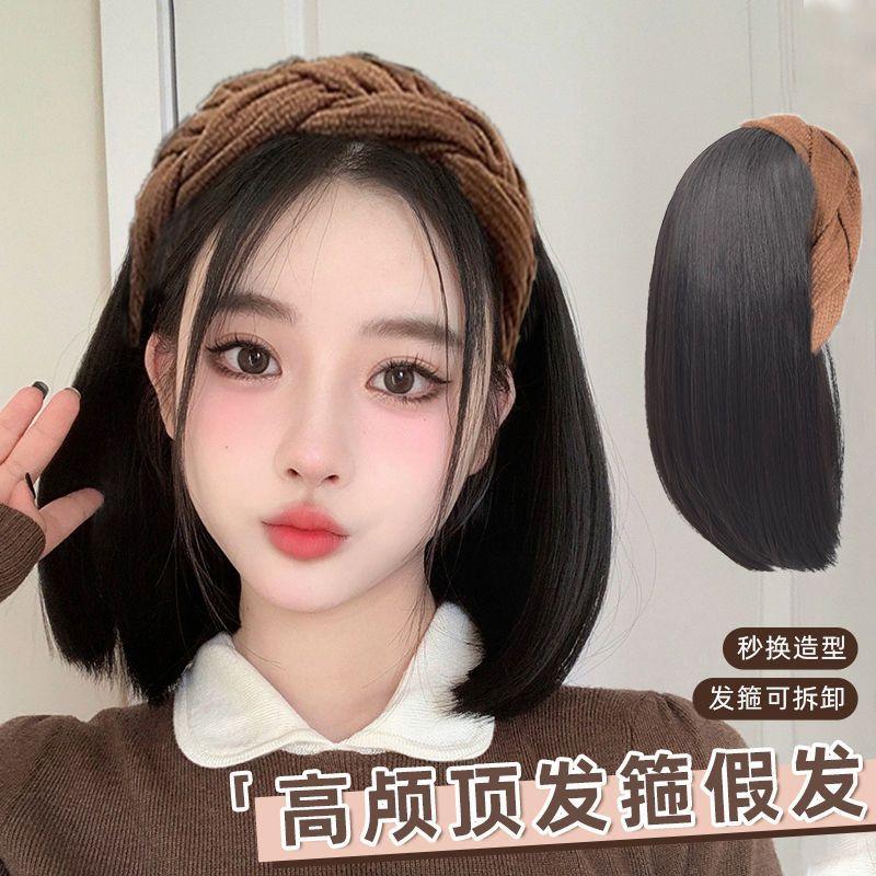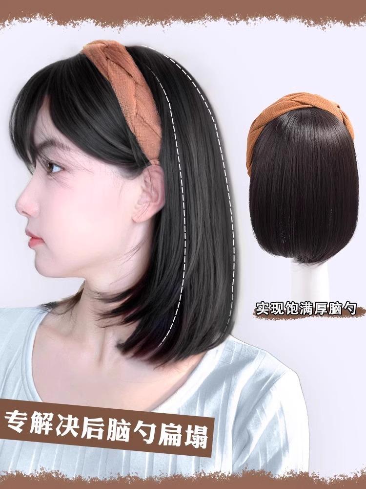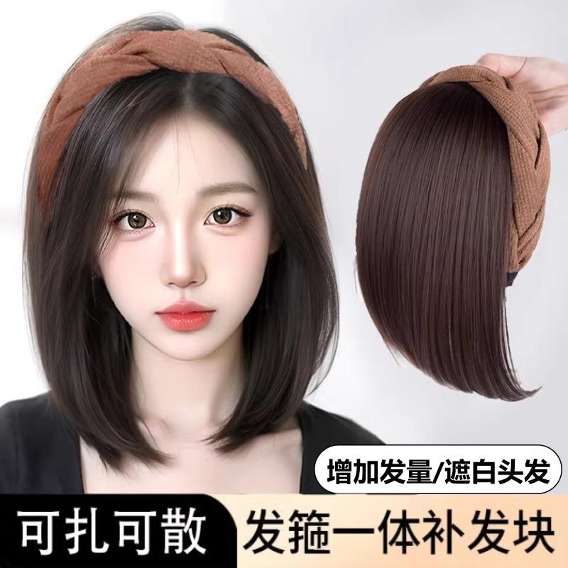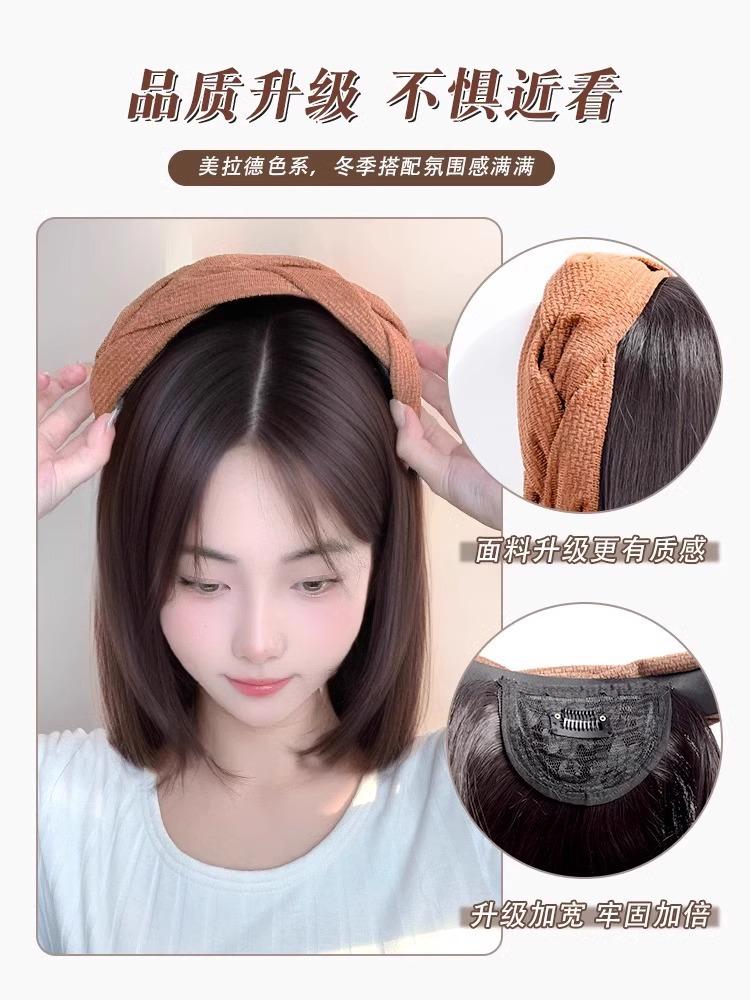 Peluca de aro para cabello de mujer, de una pieza, de simulación de moda, color marrón, con bloque de reparación de aro para cabello corto, peluca de media cabeza