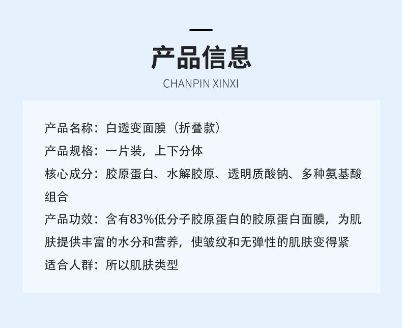 Mascarilla facial, mascarilla para ojos, mascarilla para labios, mascarilla para frente, mascarilla para cuello, mascarilla para pliegues nasolabiales, mascarilla para pecho, mascarilla para zona íntima, etc.