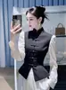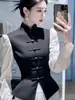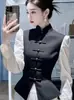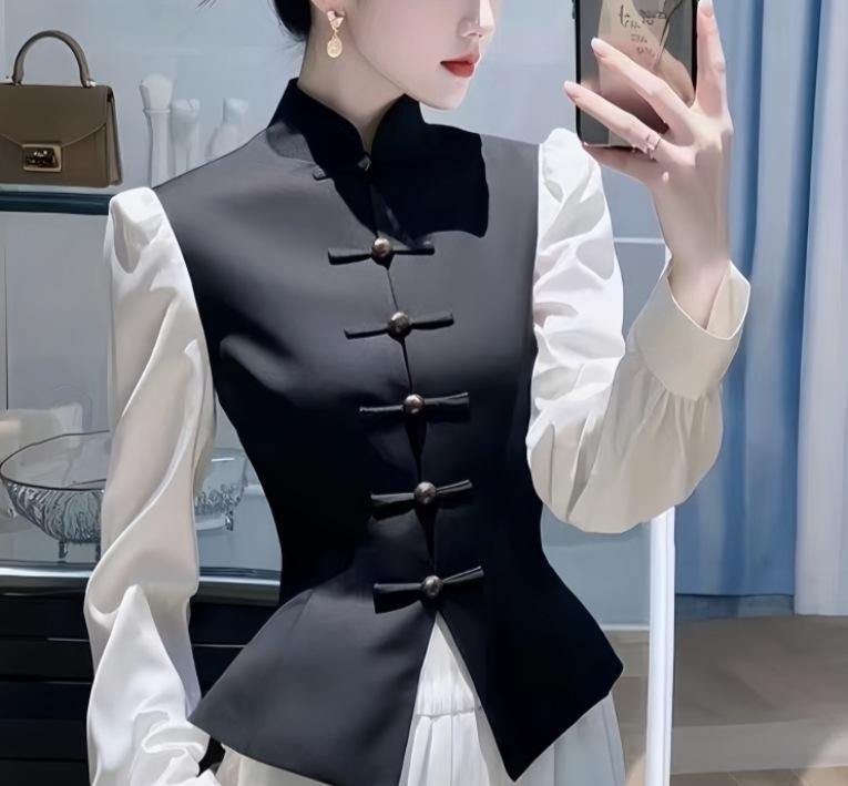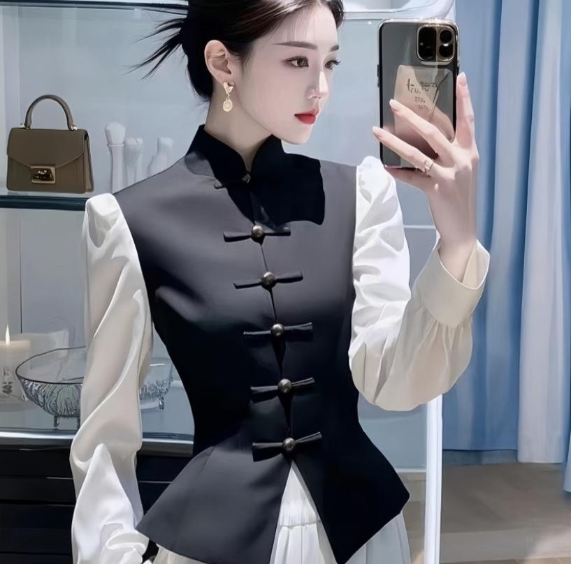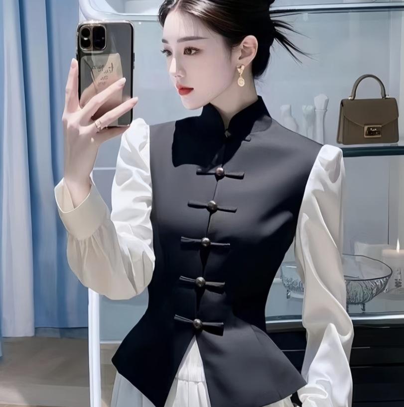 2025 Nuevo Primavera Elegante Top de Alta Gama Lujo Ligero Estilo Chino Nuevo Set Cuello Mao Botones Costuras Camisa Falsa de Dos Piezas para Mujer