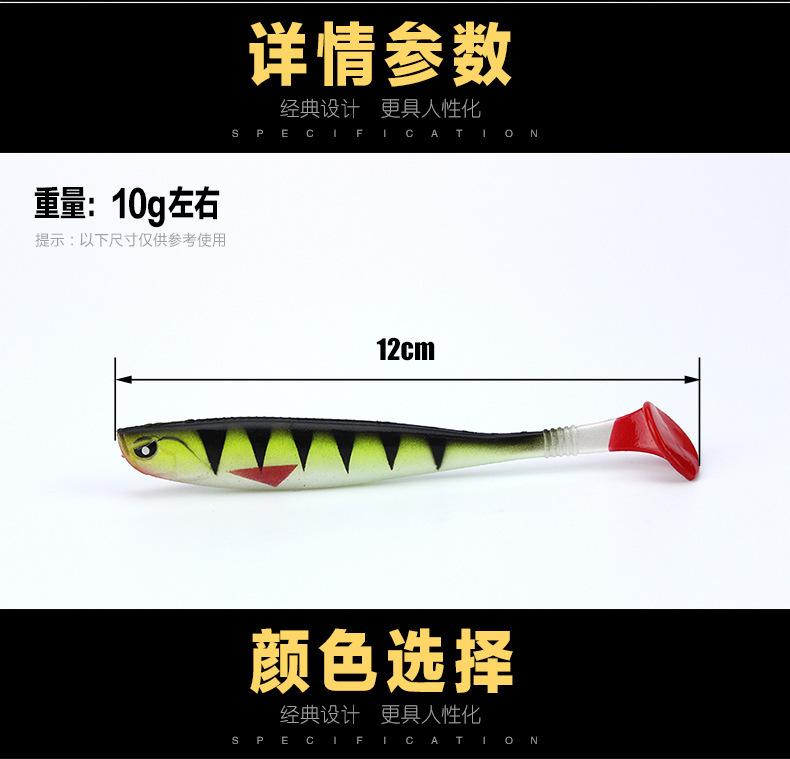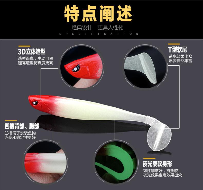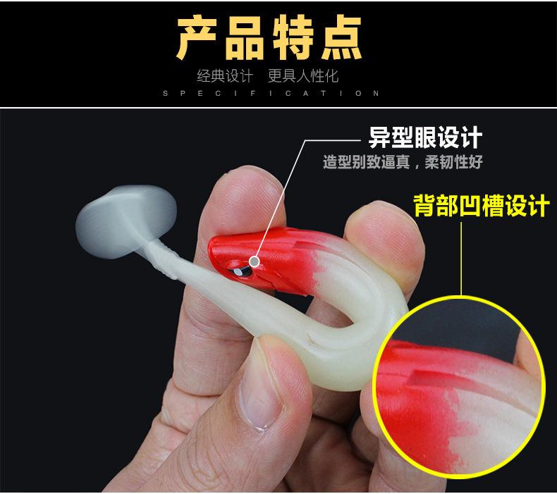 Características: Forma suave, material de PVC seleccionado, buena tenacidad, anti-mordida, posturas de nado ricas. Los estilos luminosos y multicolores se pueden usar para pescar de noche o en diferentes entornos, con un rango de pruebas más amplio. El diseño de ranura en la espalda y el abdomen permite que el anzuelo pase a través de la ranura, lo que no solo mejora enormemente la estabilidad, sino que también hace que el montaje y desmontaje sean más convenientes y rápidos.