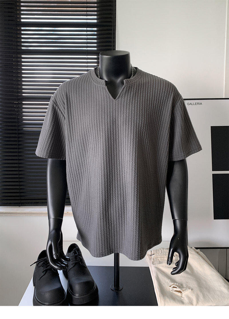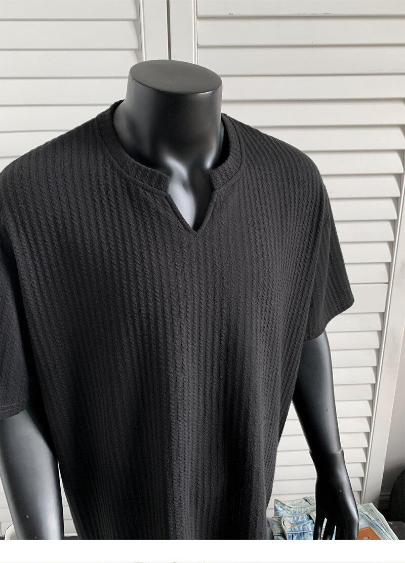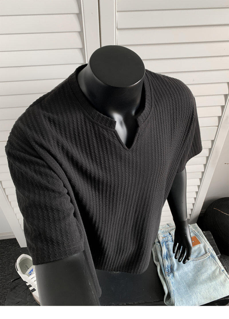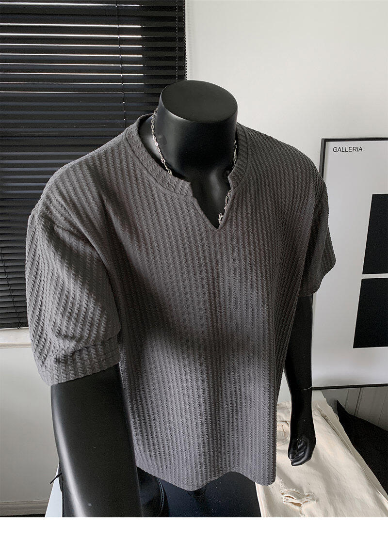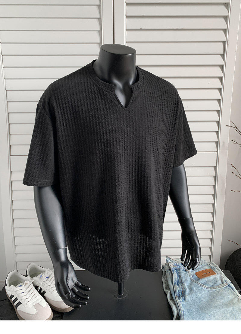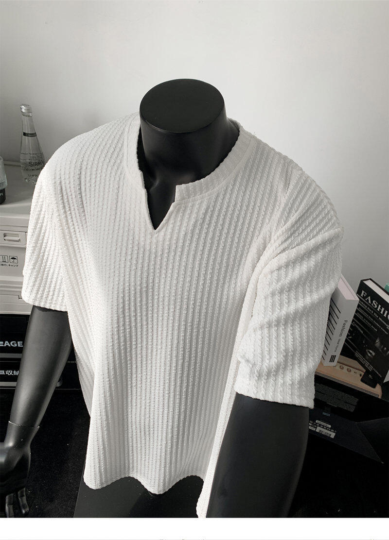 Camiseta de manga corta con cuello en V para hombre, estilo americano, juvenil, de color liso, sencilla, a rayas, holgada e informal, novedad de verano de 2025