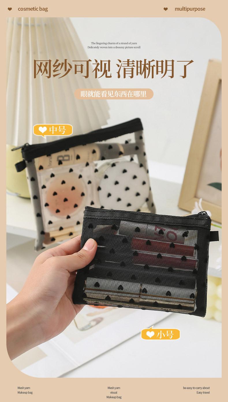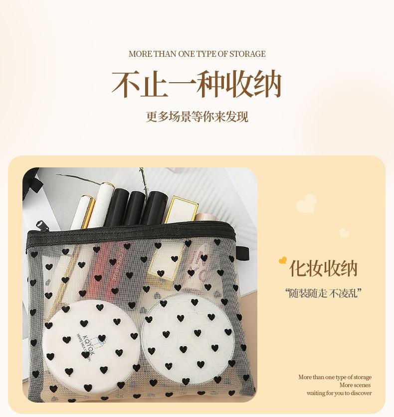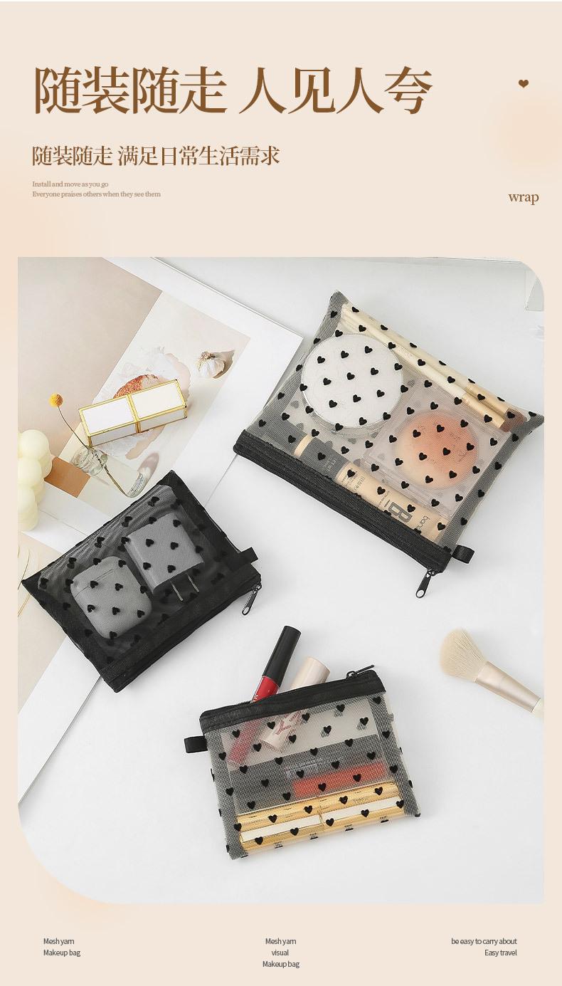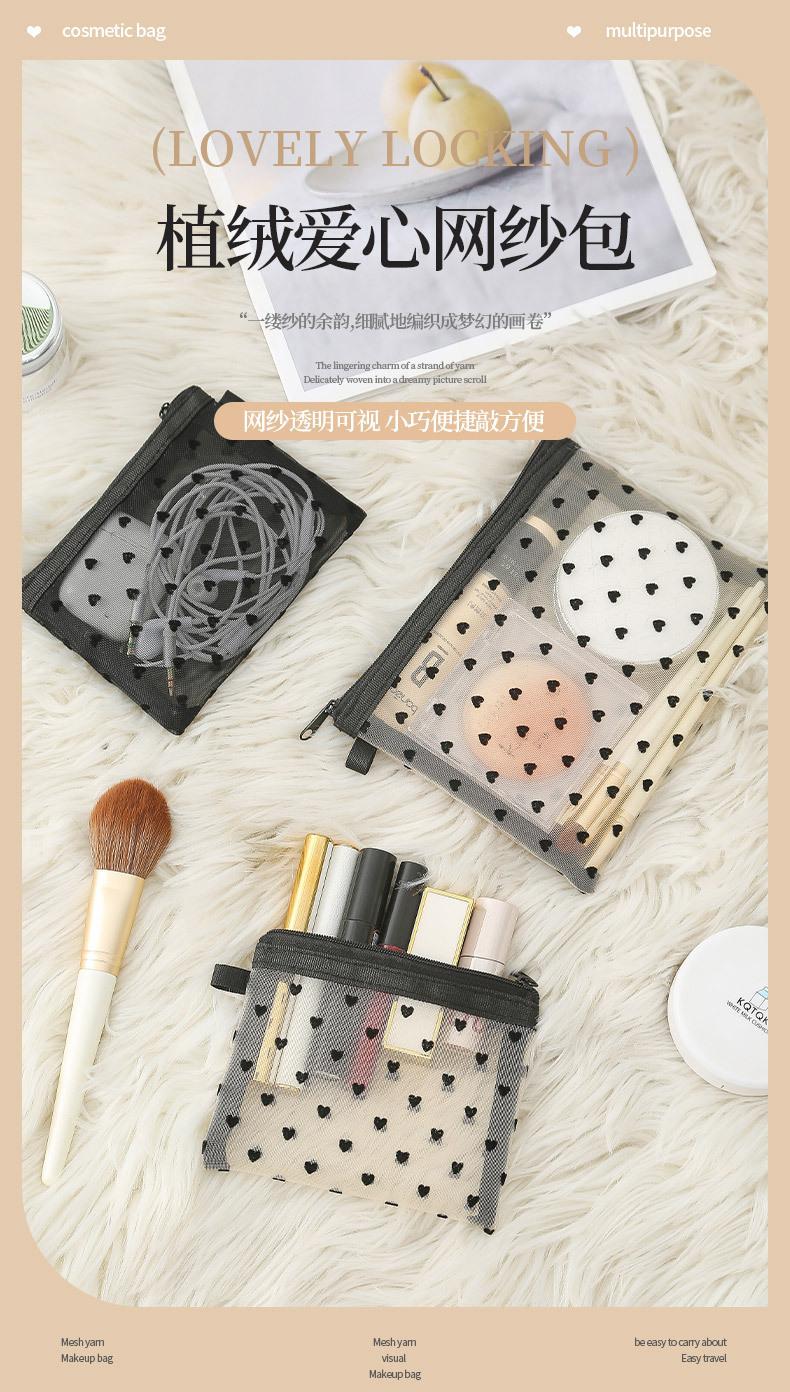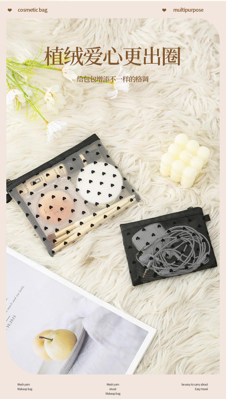 Bolsa de malla para cosméticos, bolsa de viaje portátil para lavado en caliente transfronterizo, bolsa de almacenamiento de malla con flocado, bolsa de almacenamiento de amor al por mayor