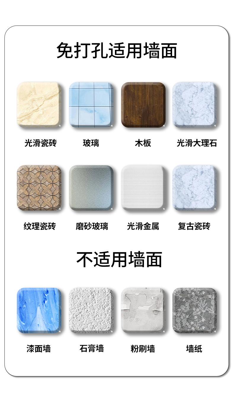 (2) Tenga en cuenta que la superficie de la pared debe ser plana y sólida, como baldosas de vidrio.No disponible enSobre paredes irregulares e inestables como paredes pintadas, empapeladas y paredes de cal.