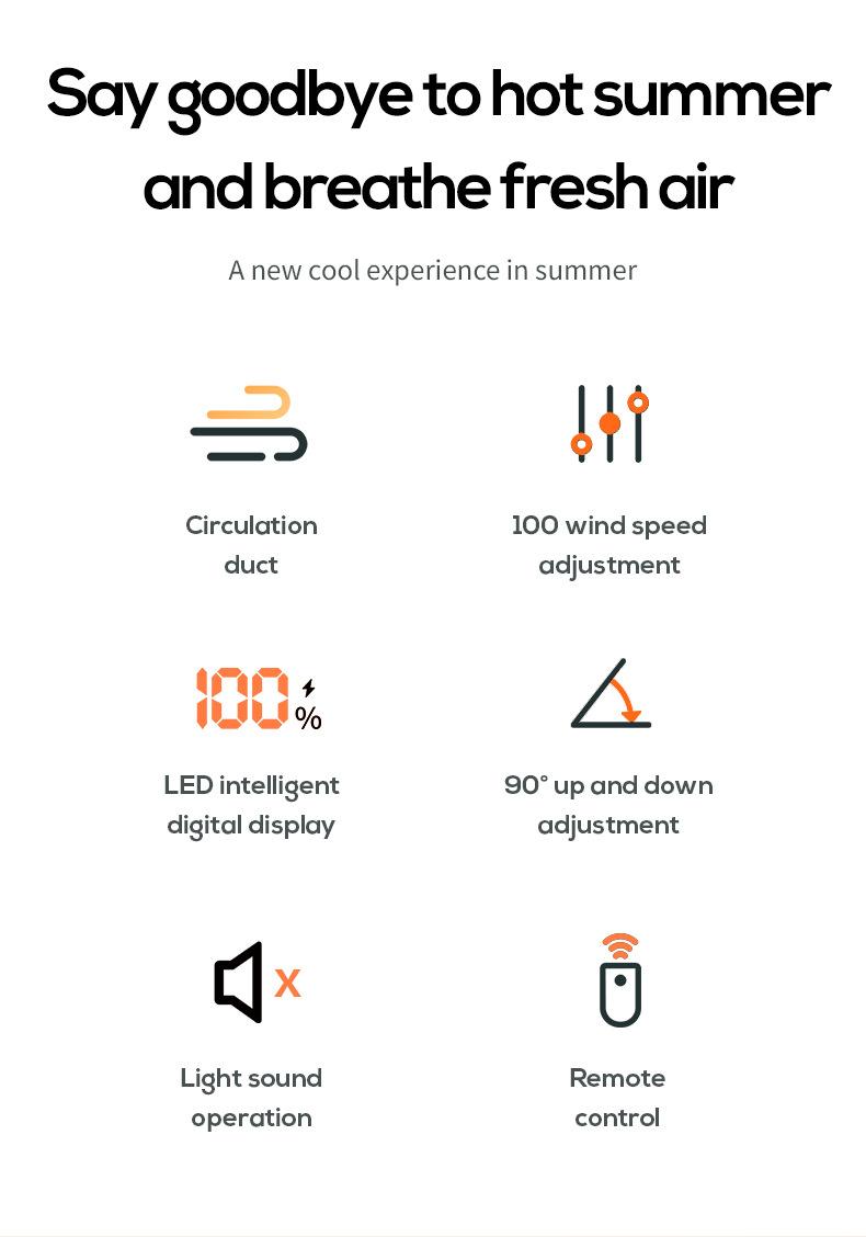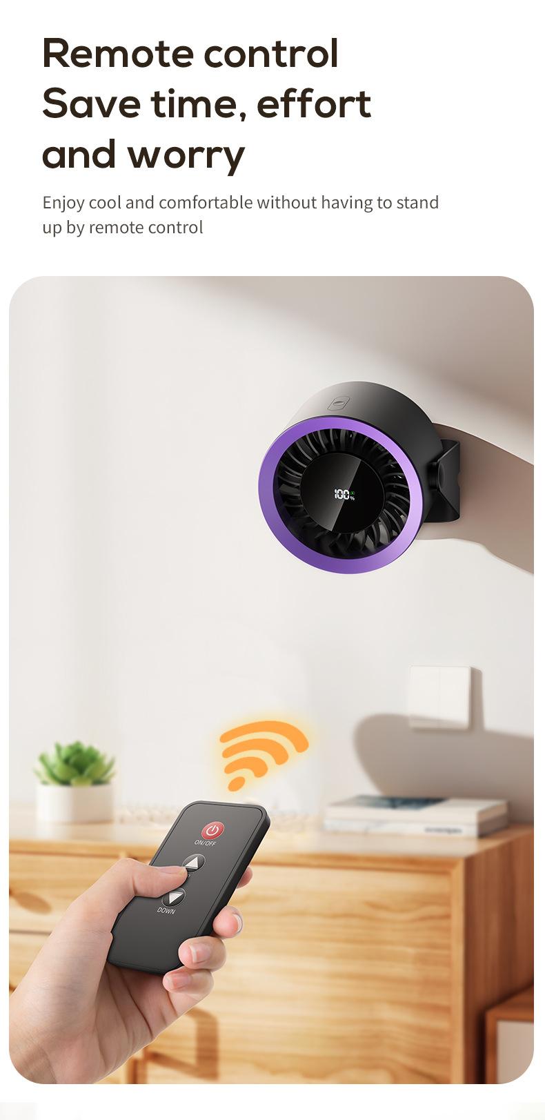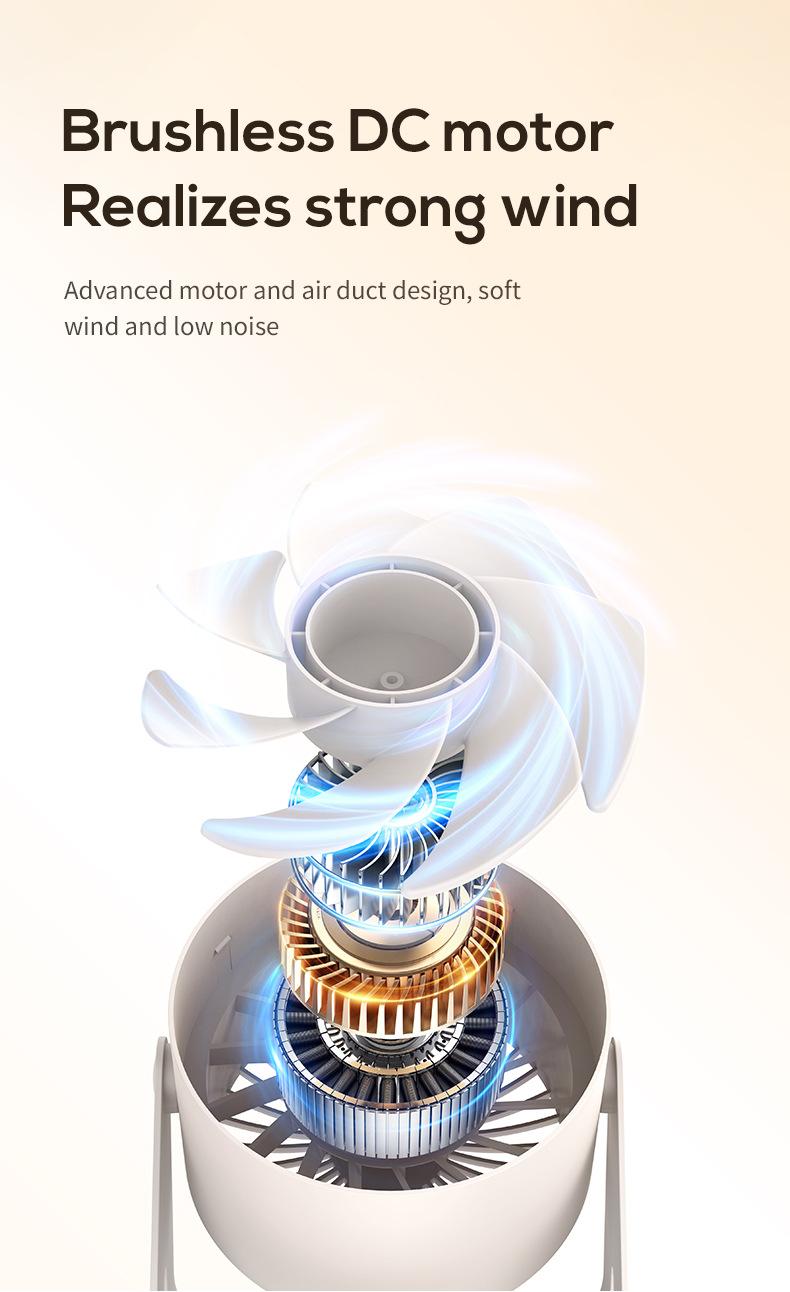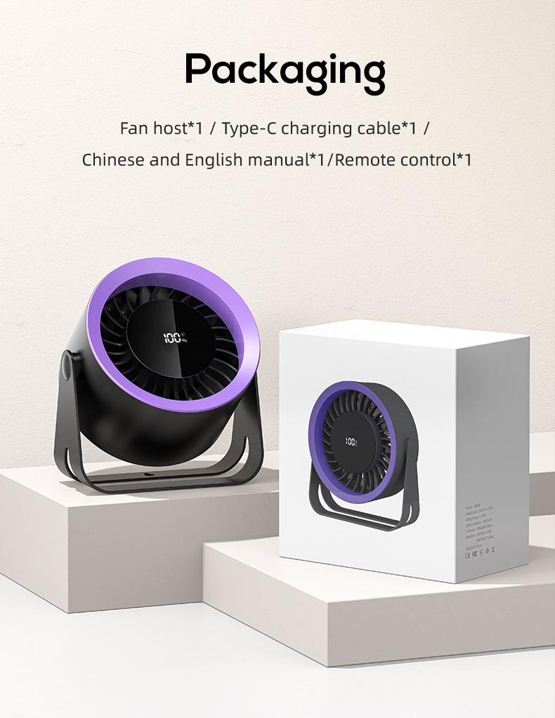 Detalles de los accesorios del producto: host del ventilador *1, cable de carga Tipo-c *1, control remoto *1, manual en chino e inglés *1