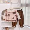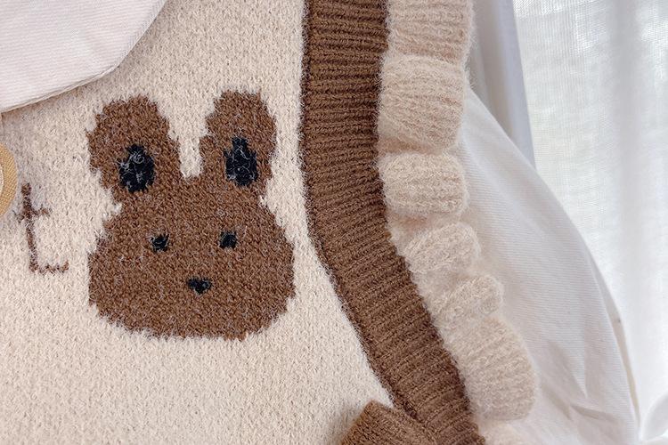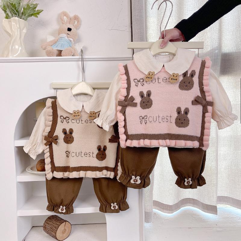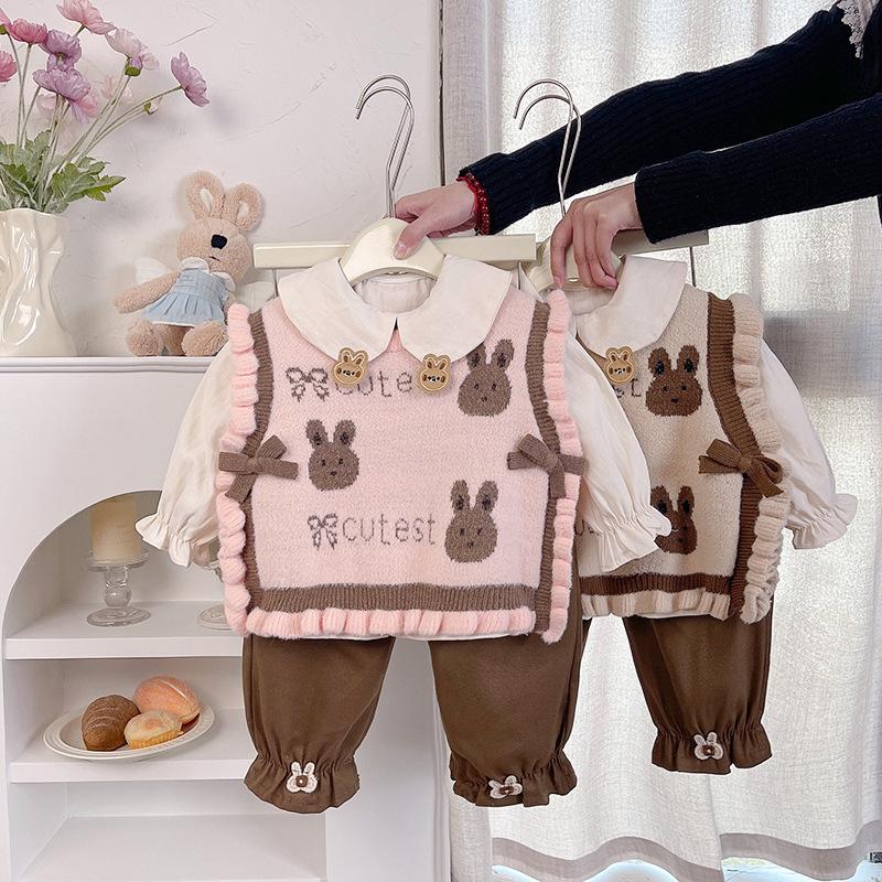Primavera 2025 nuevo chaleco suéter de dibujos animados para niñas de manga larga de tres piezas para bebé niña casual traje de pantalón al por mayor