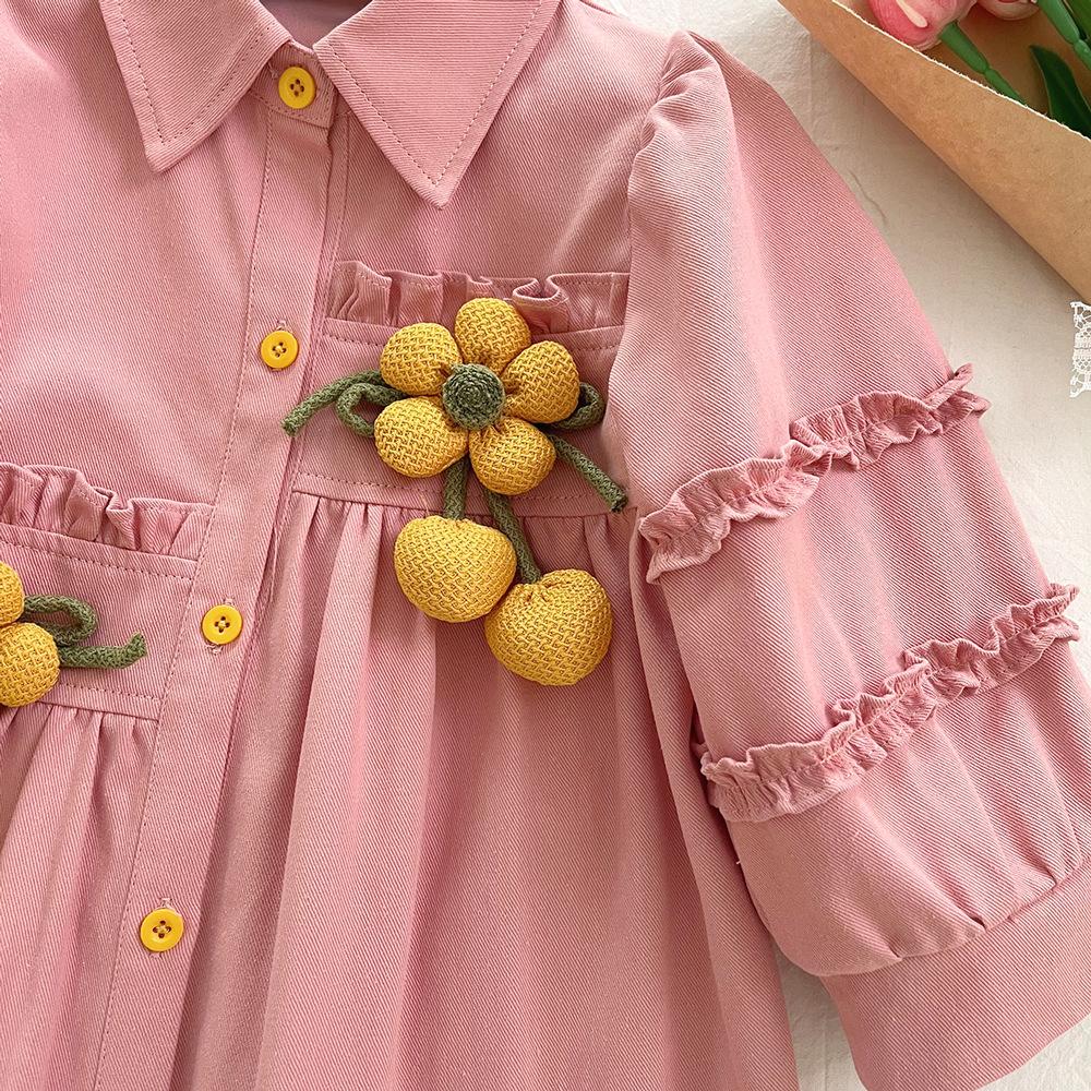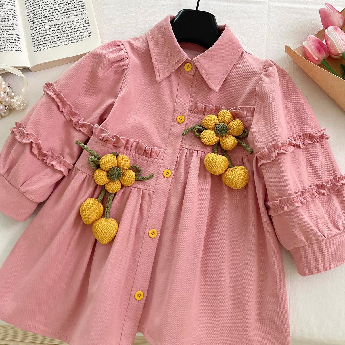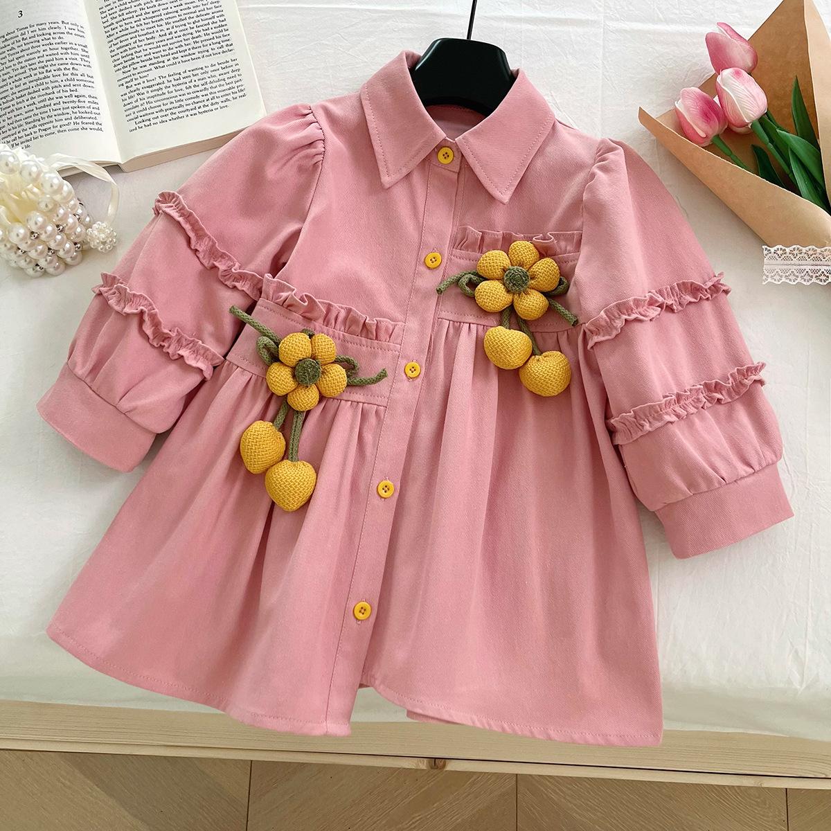 Primavera y otoño 2025 Nuevo vestido camisero de estilo coreano para niña Vestido de manga larga con girasol tridimensional para niña de moda