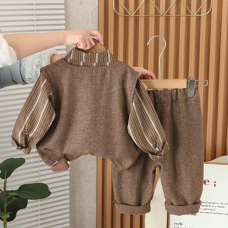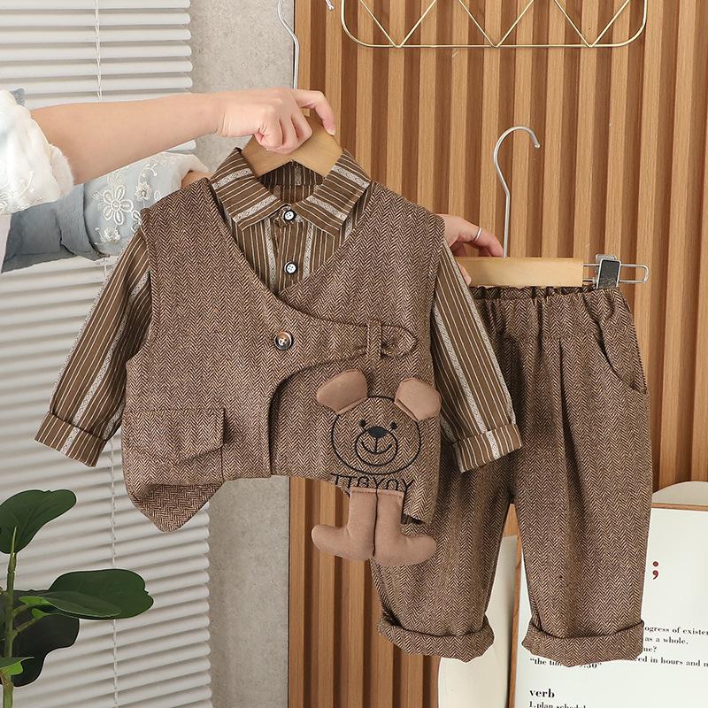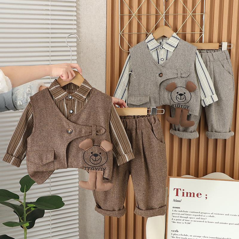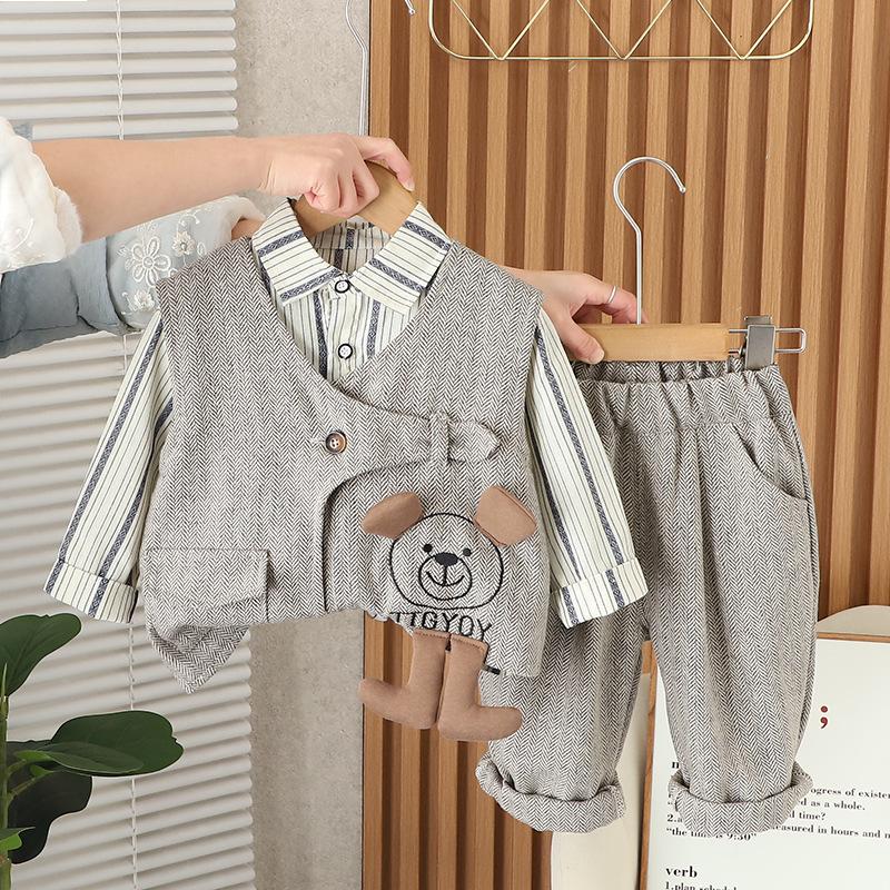 Ropa para niños ropa de bebé primavera y otoño traje 2025 versión coreana de la nueva ropa de bebé para niños de tres piezas camisa chaleco estilo extranjero