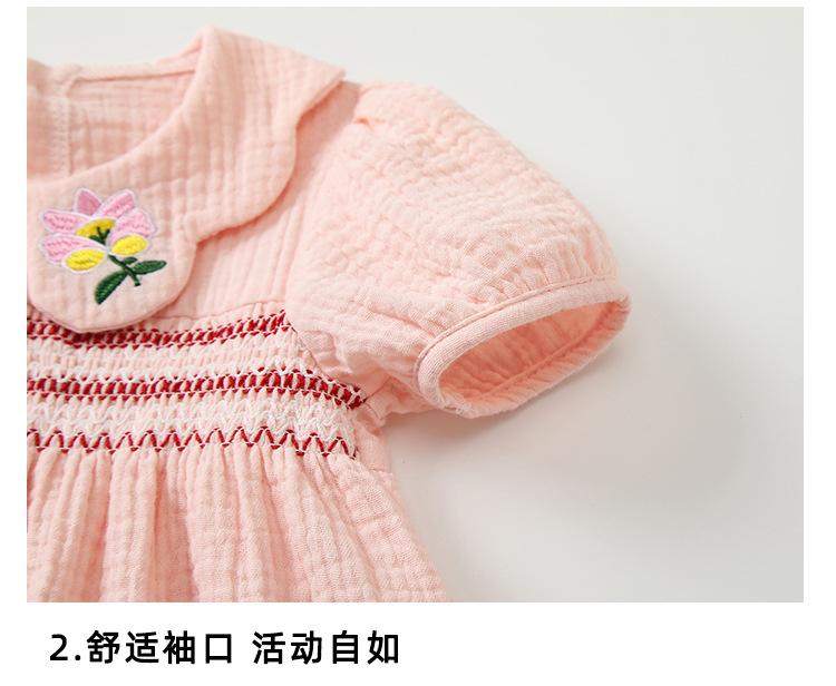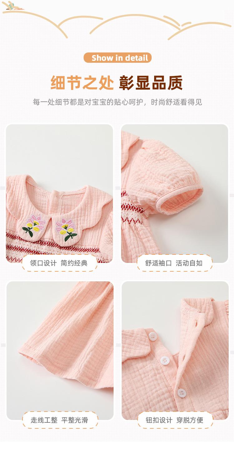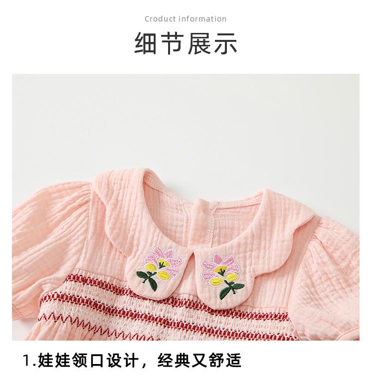 El diseño irregular del escote tiene exquisitos patrones bordados, y el bordado en el pecho es muy consciente del diseño. Los pantalones bombachos realmente pueden mostrar el temperamento lindo del bebé.