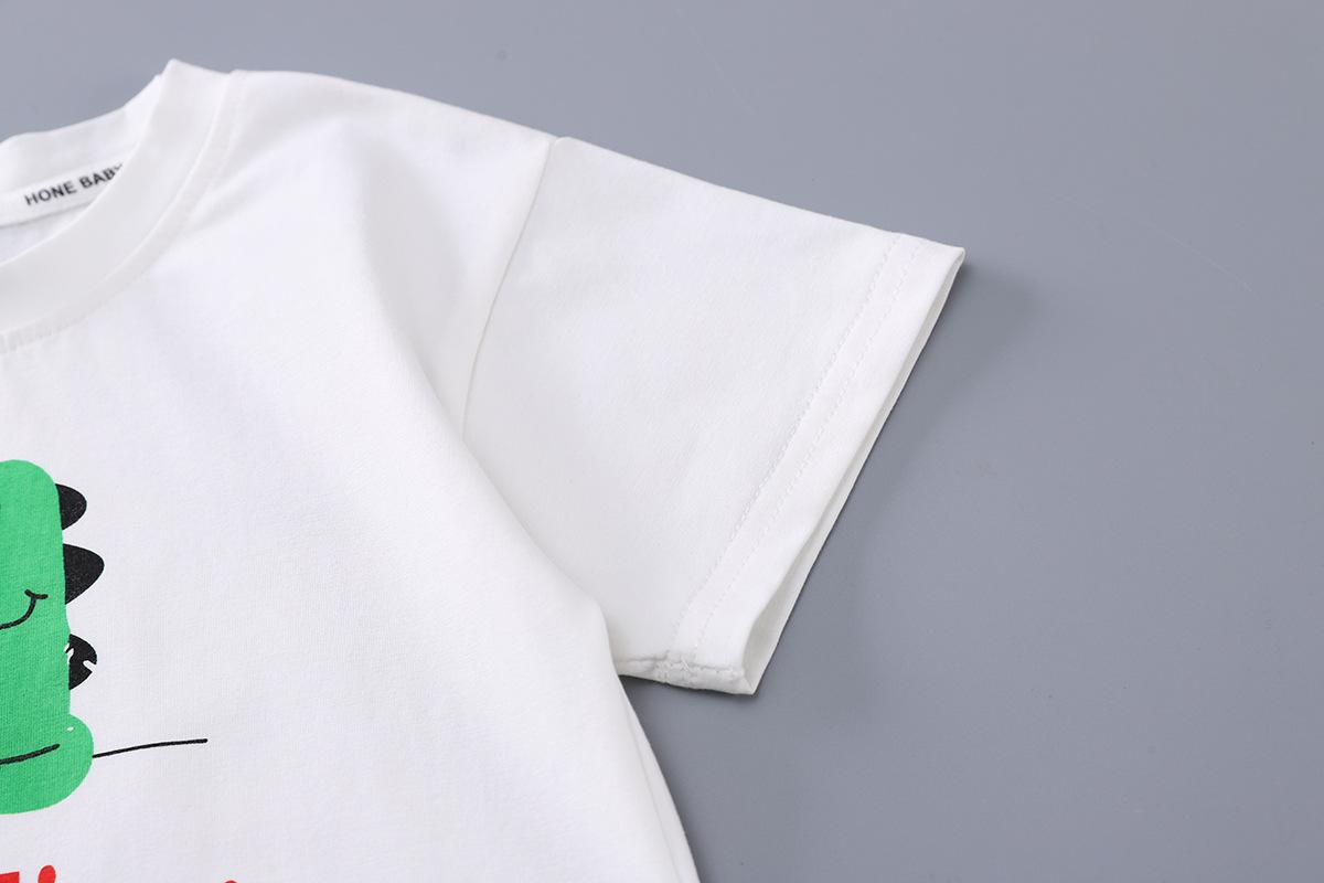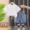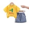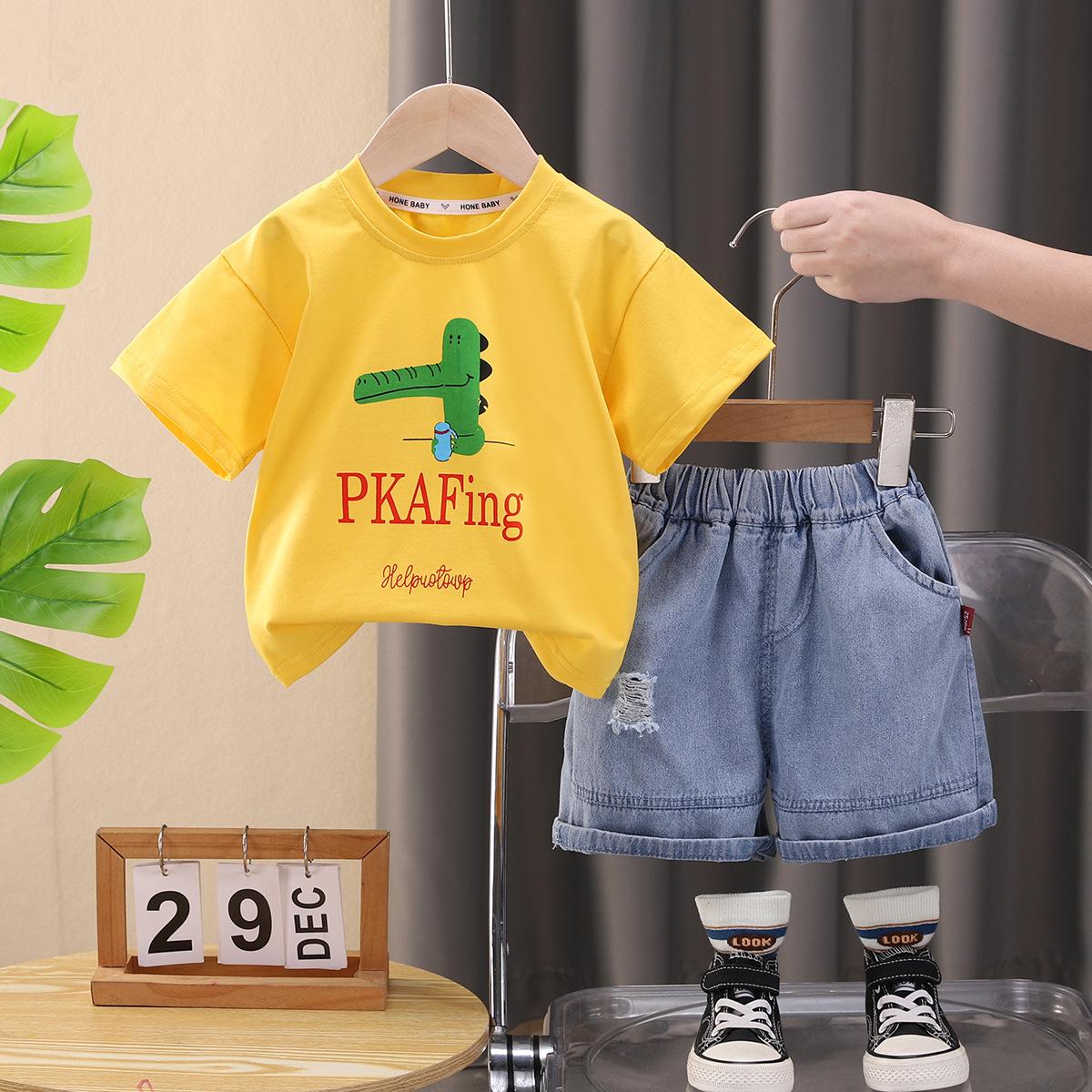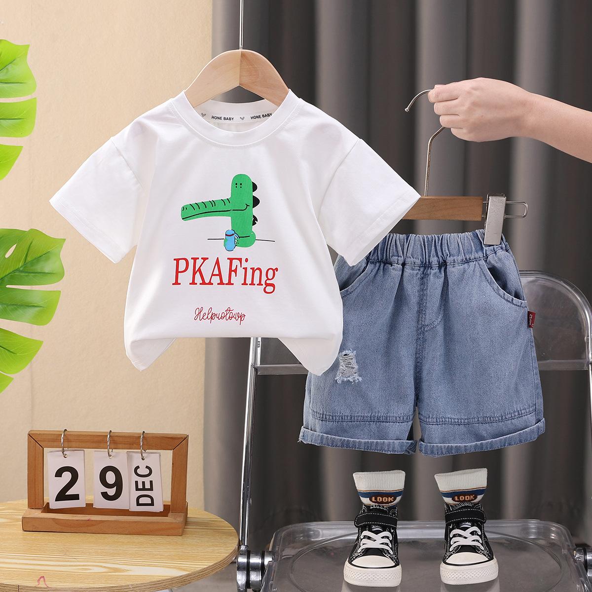 Traje de manga corta de verano 2025 para niños, conjunto de dos piezas con estampado de animales de estilo occidental, cuello redondo y pantalones cortos