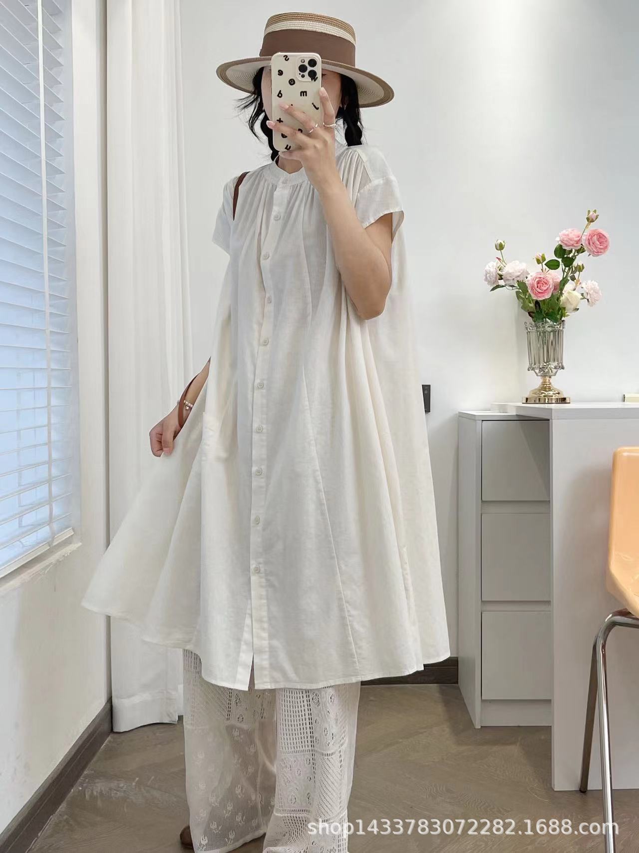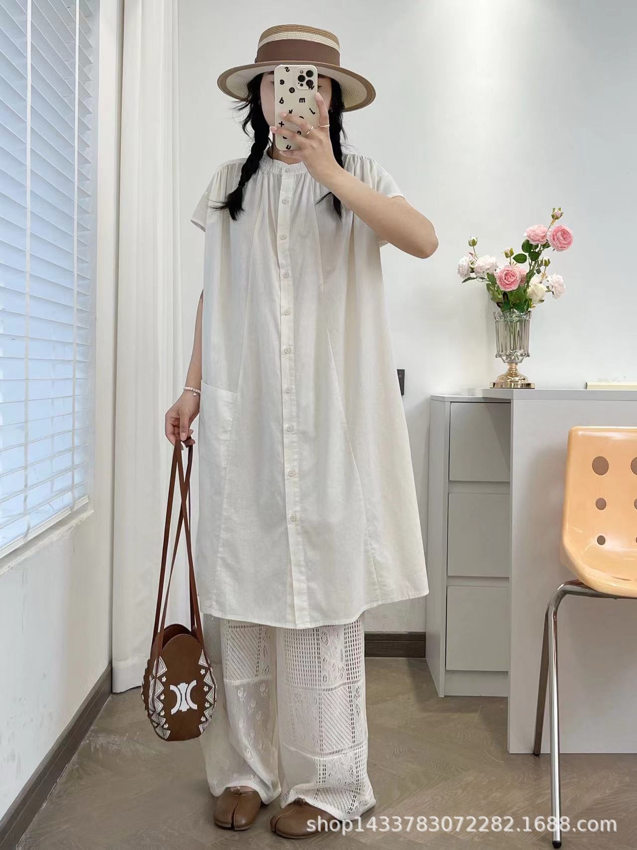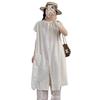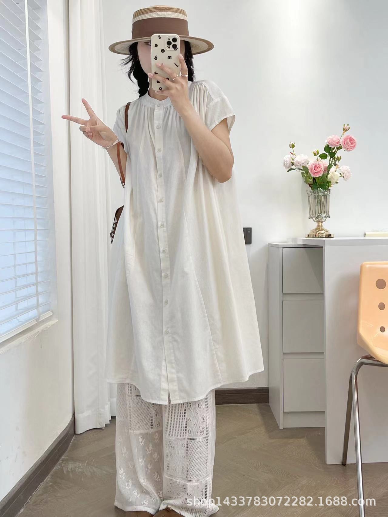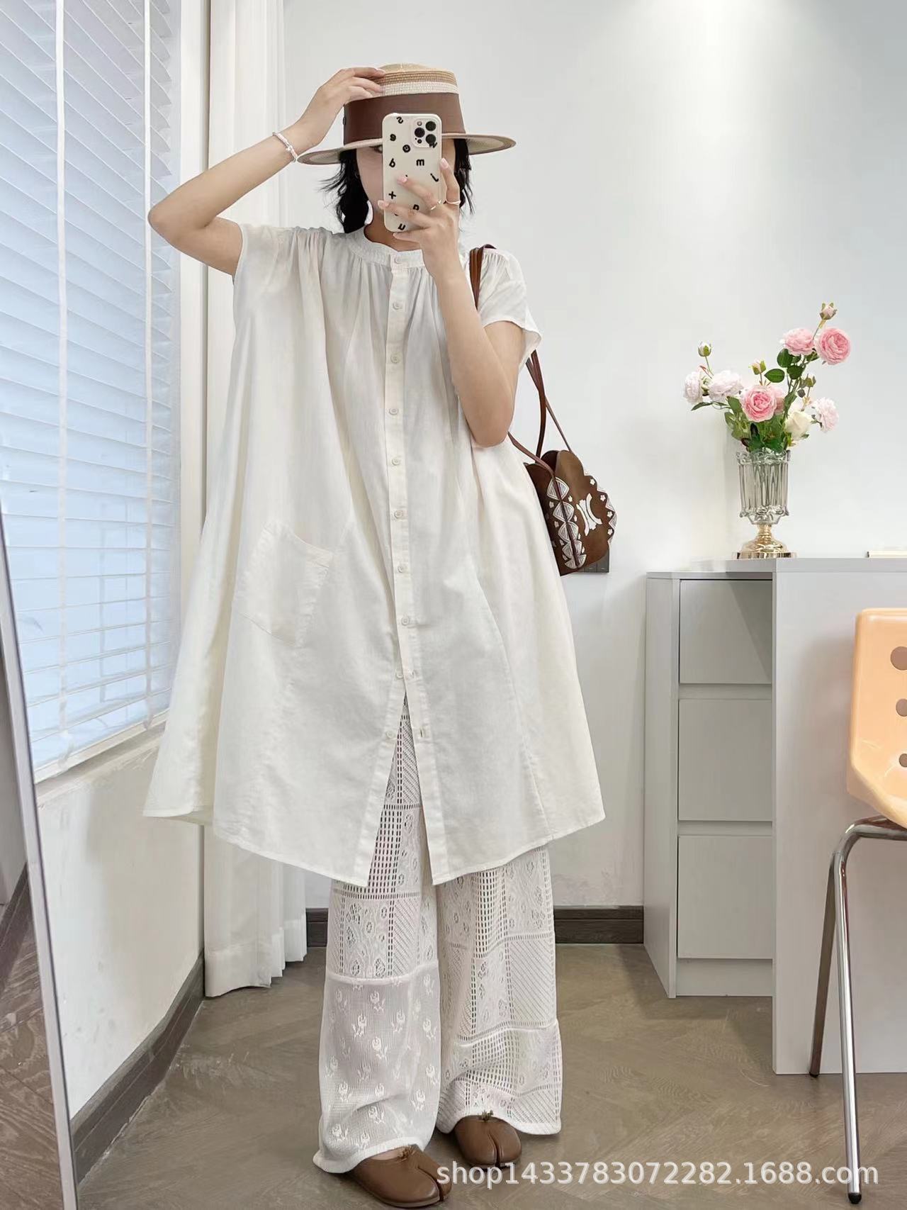 Camisa de Cuello Redondo Estilo Lazy de Un Solo Botón Manga Corta Largo Medio para Mujer Fresca Artística Elegante Suelta Slim Vestido Camisero para Verano