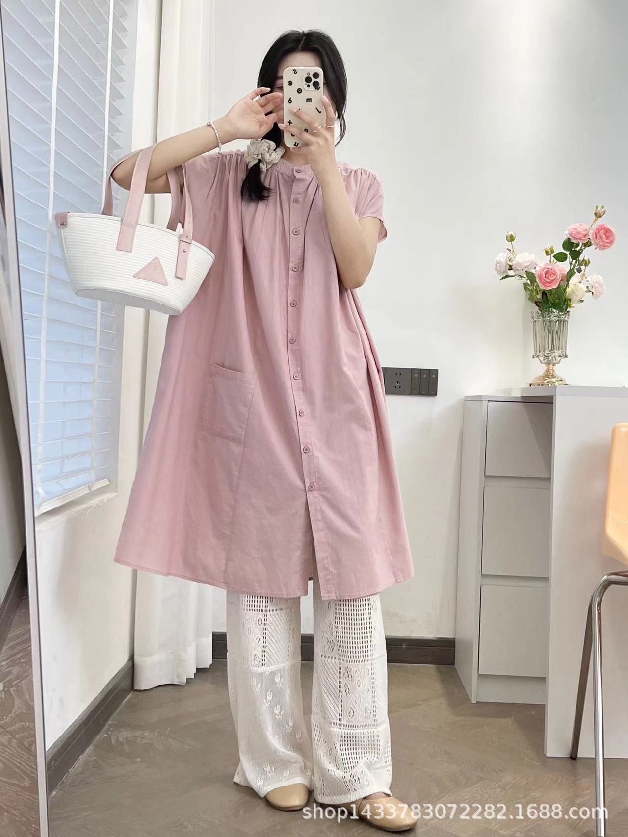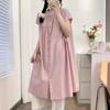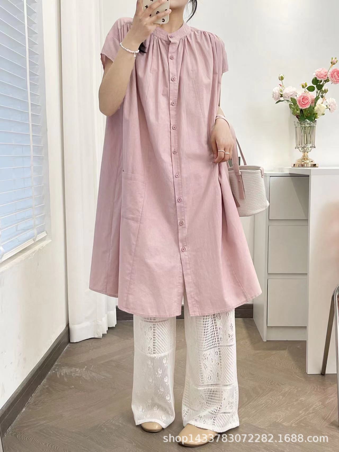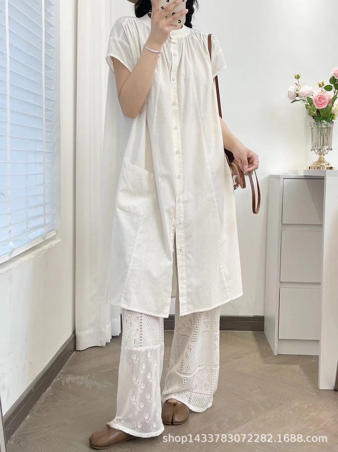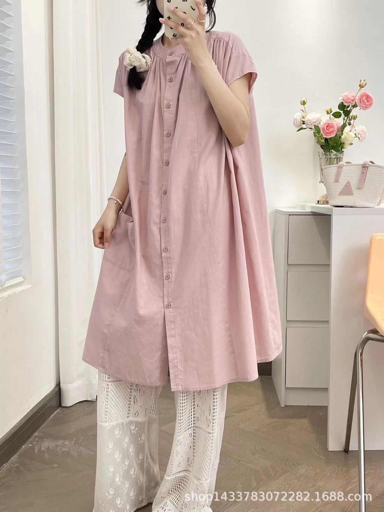 Camisa de Cuello Redondo Estilo Lazy de Un Solo Botón Manga Corta Largo Medio para Mujer Fresca Artística Elegante Suelta Slim Vestido Camisero para Verano