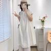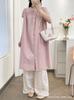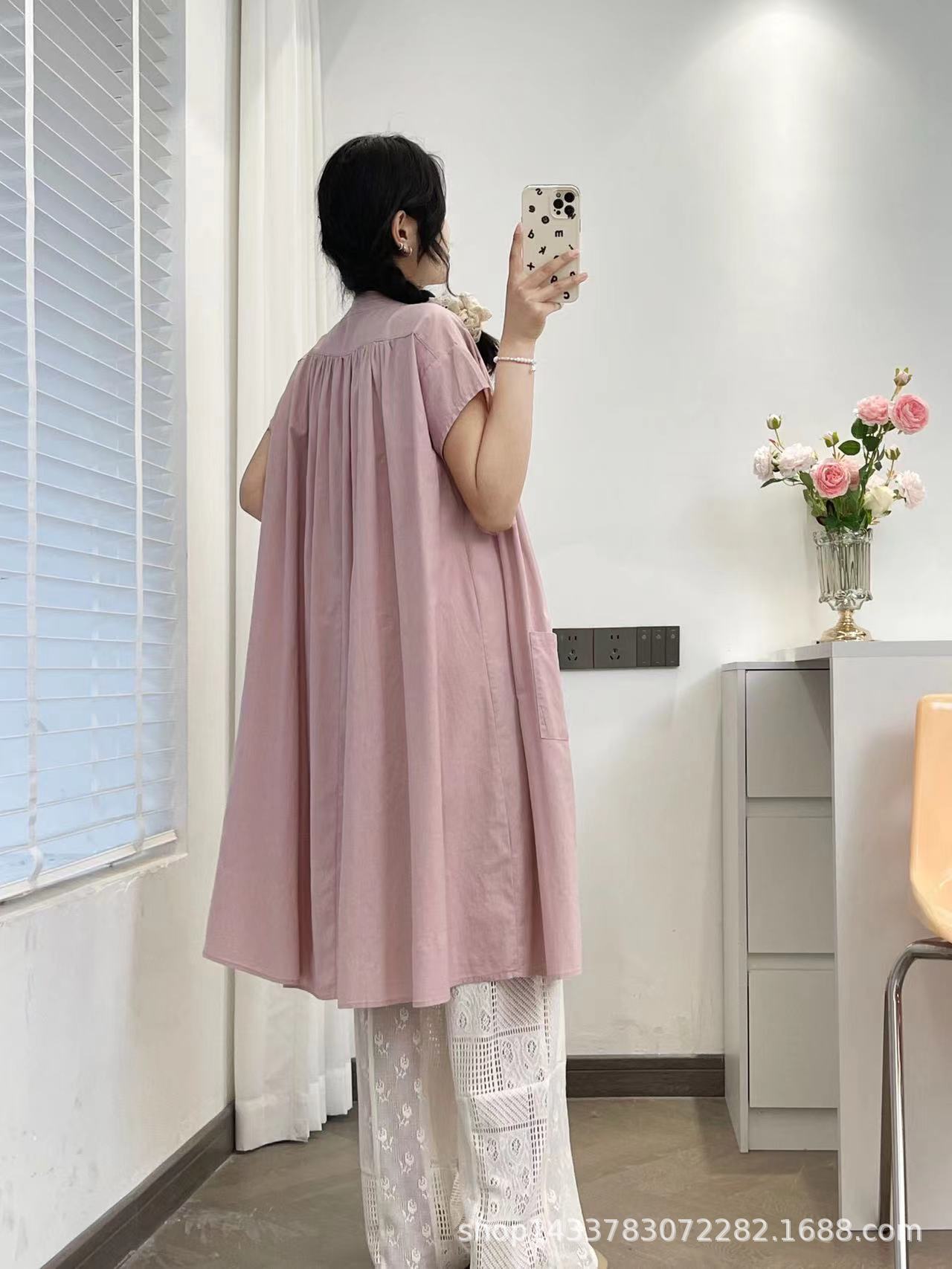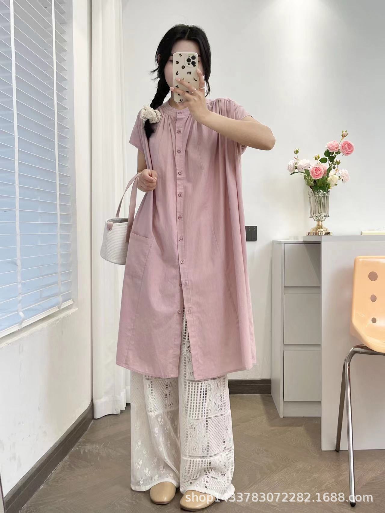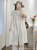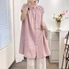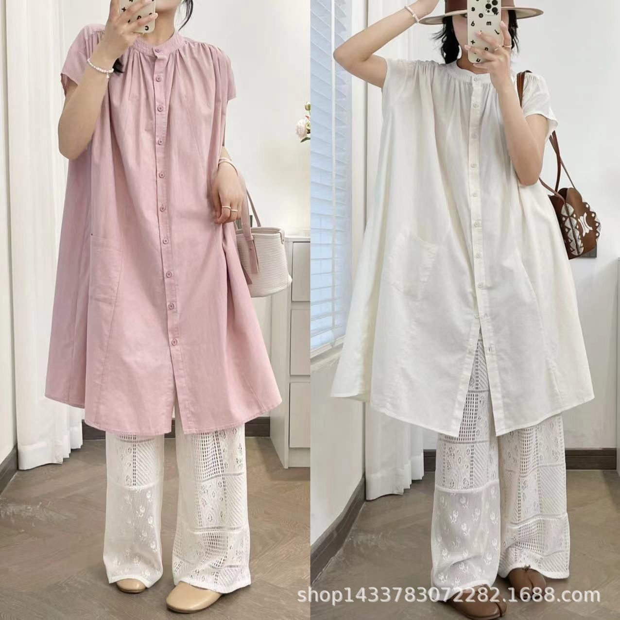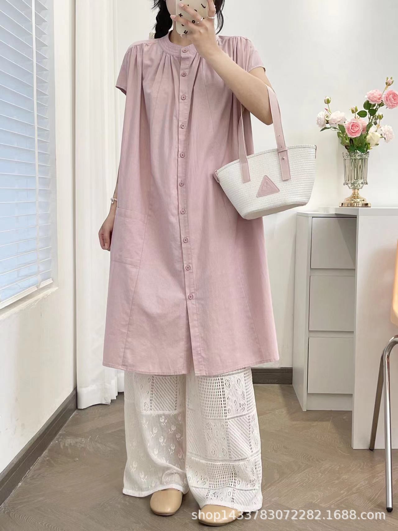 Camisa de Cuello Redondo Estilo Lazy de Un Solo Botón Manga Corta Largo Medio para Mujer Fresca Artística Elegante Suelta Slim Vestido Camisero para Verano