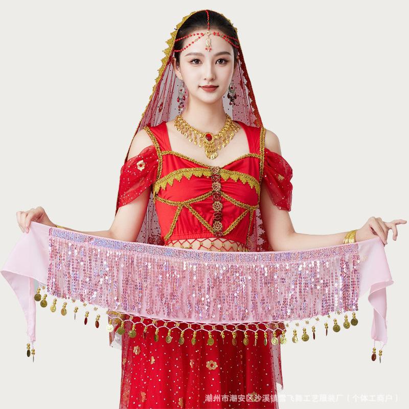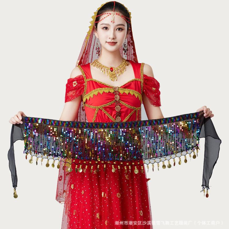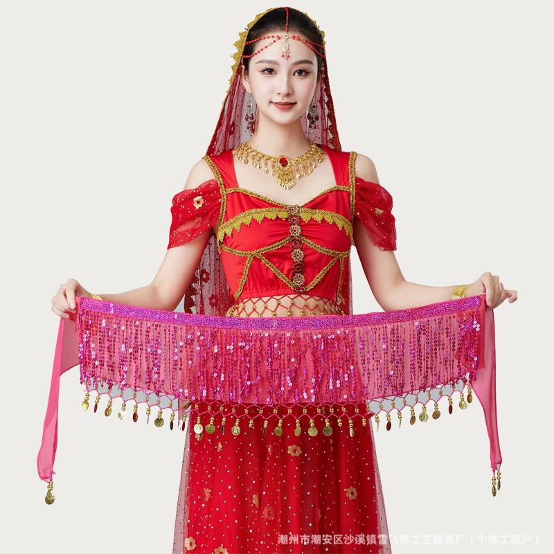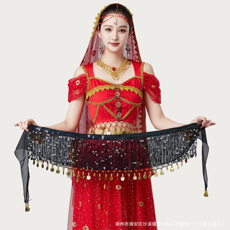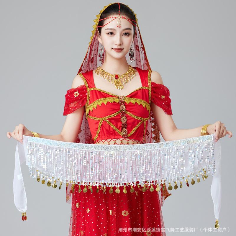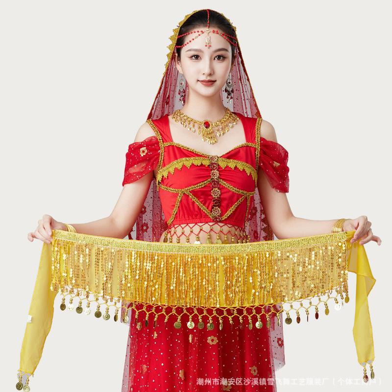 Disfraz de danza del vientre para Halloween, sexy, con lentejuelas, hecho a mano, monedas de oro, borlas, cuentas en las caderas, cadena para la cintura, danza india