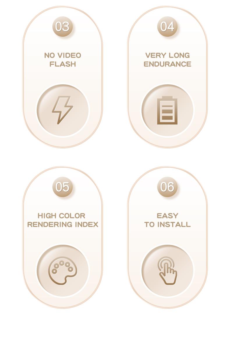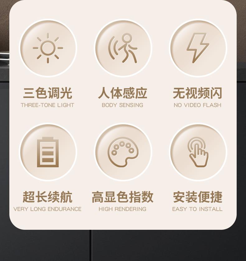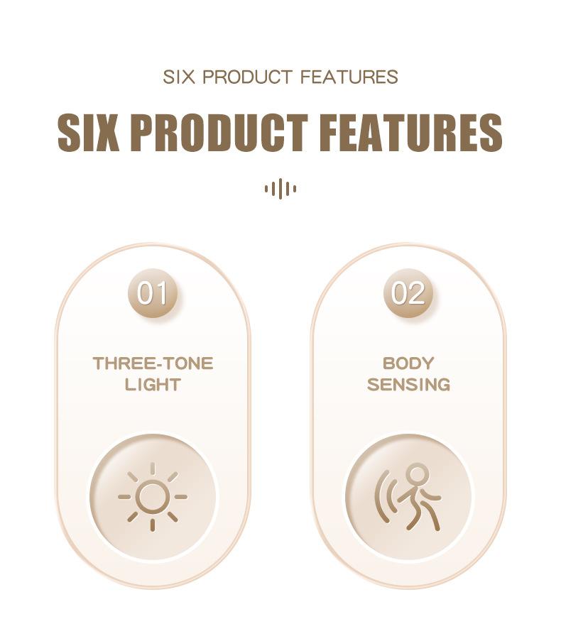 Función: Atenuación por botón de tres temperaturas de color (3000K/6000K/3000K+6000K), luz constante/detección del cuerpo humano; detección de luz (no se enciende durante el día, se enciende por la noche)
