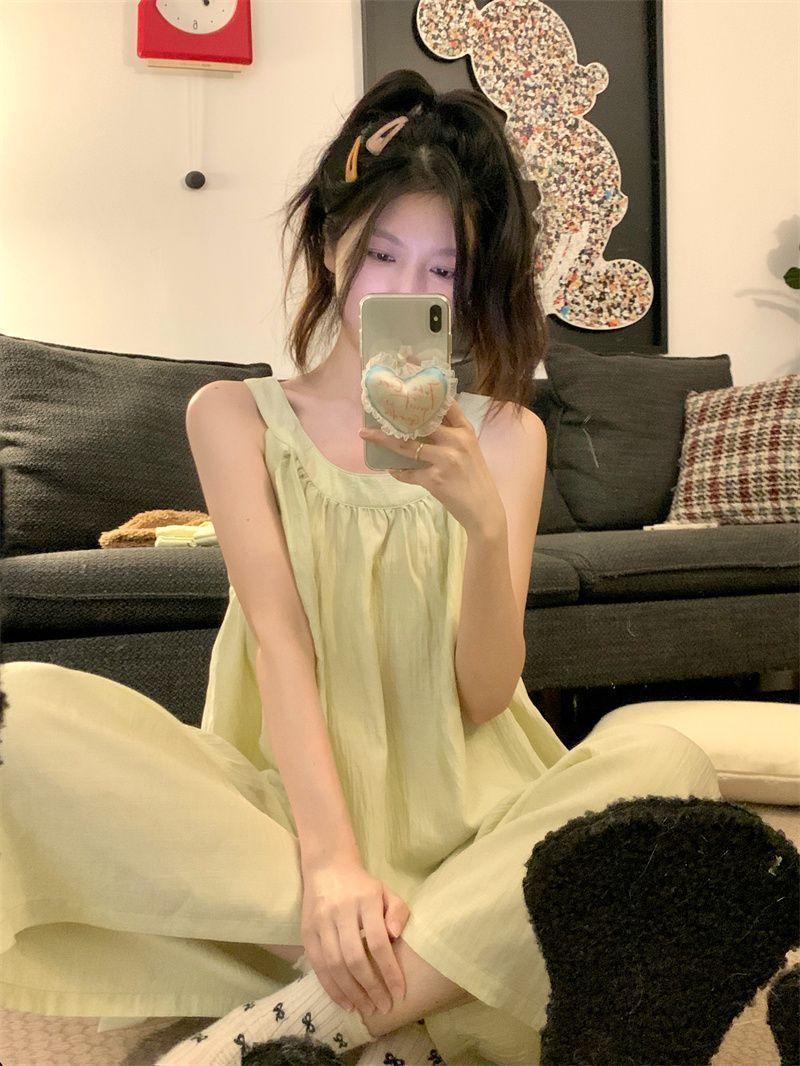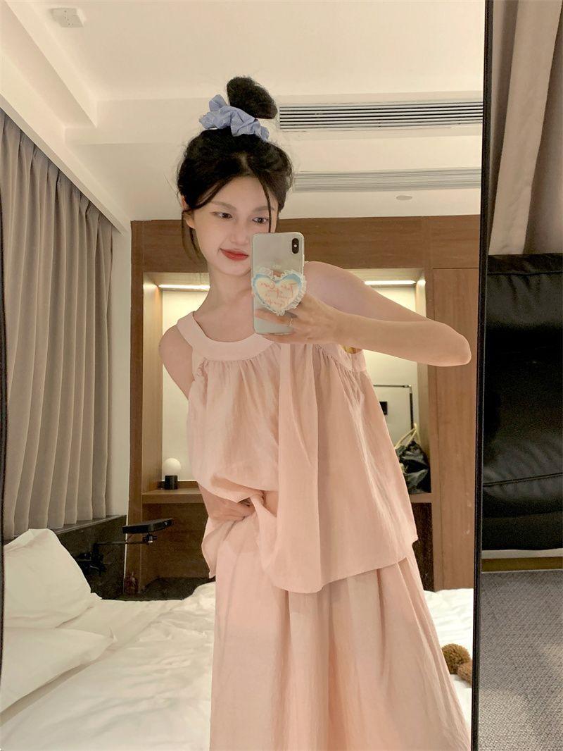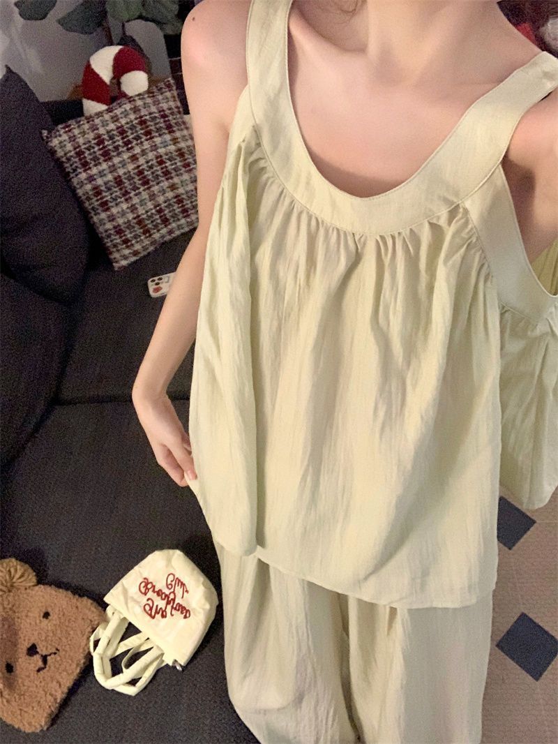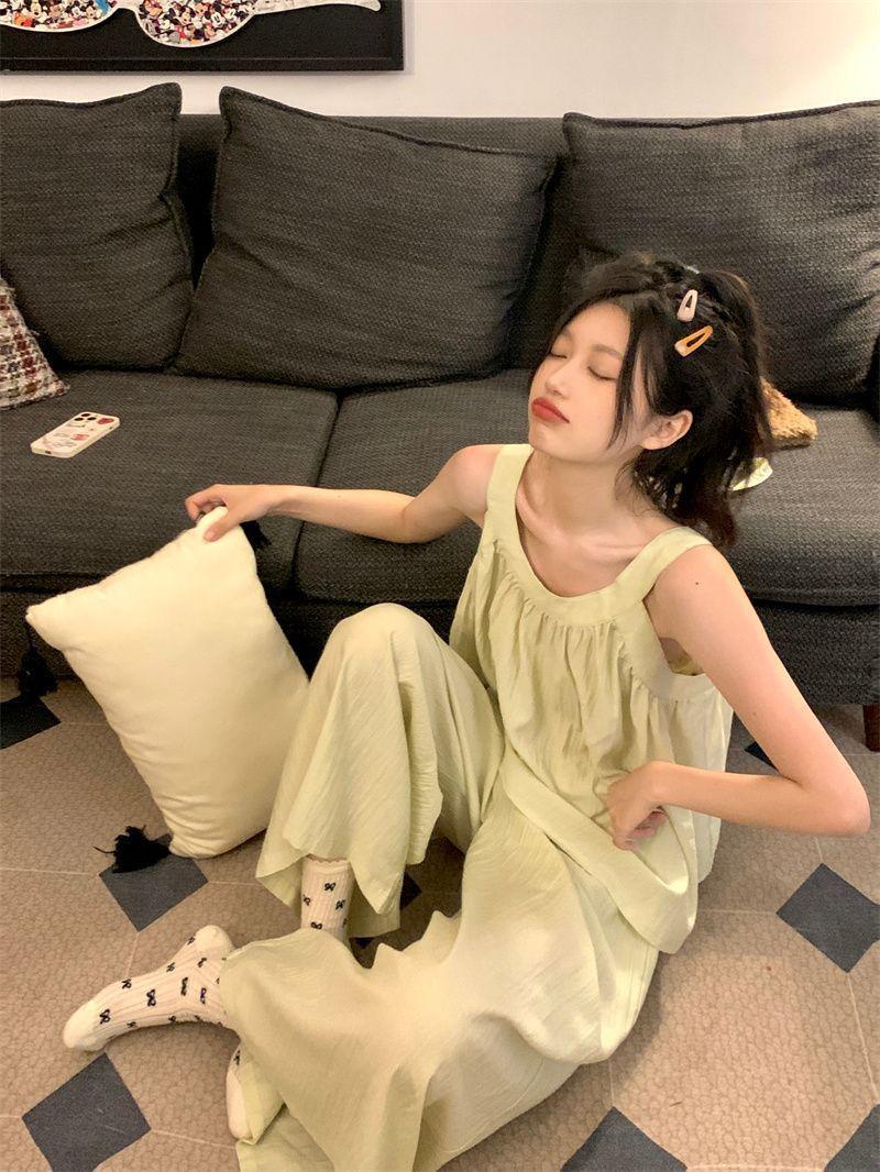 Pijama francés dulce con cuello colgante sin mangas para mujer, verano 2025, nuevo, holgado, para uso exterior, pantalones, ropa para el hogar, traje