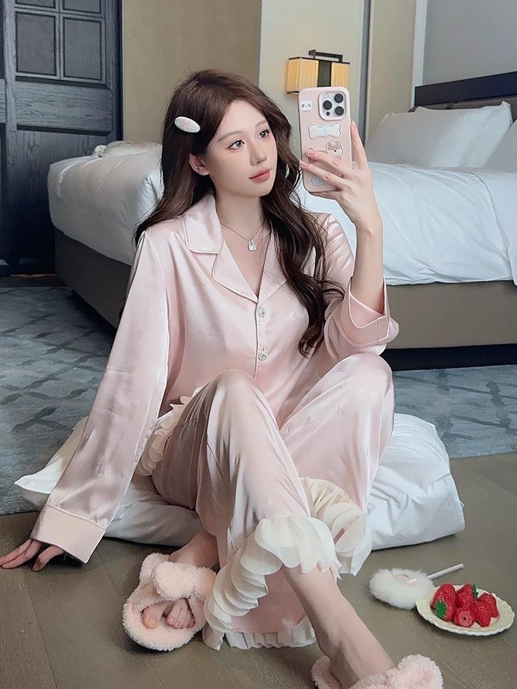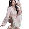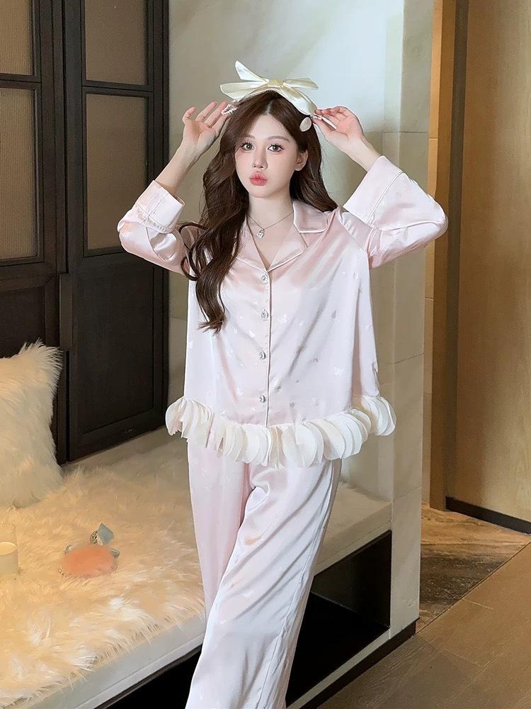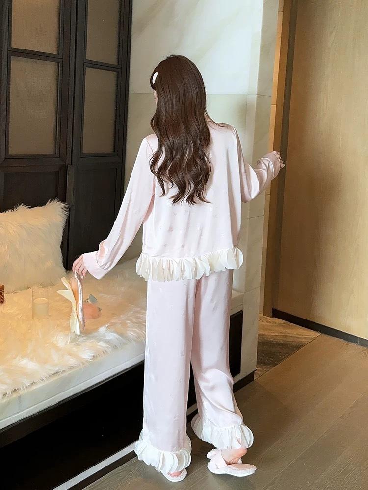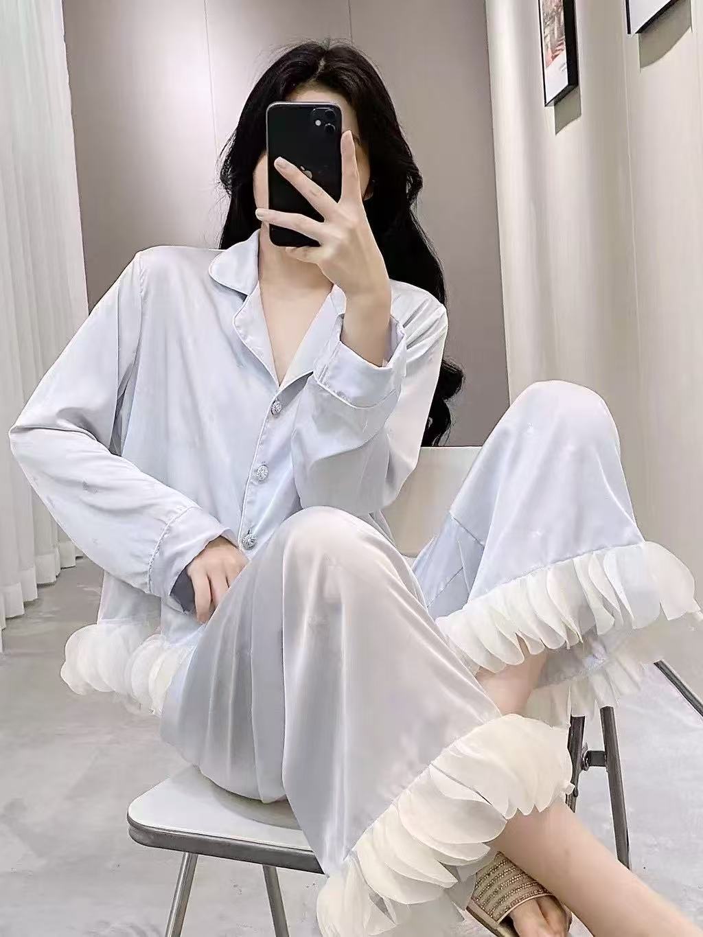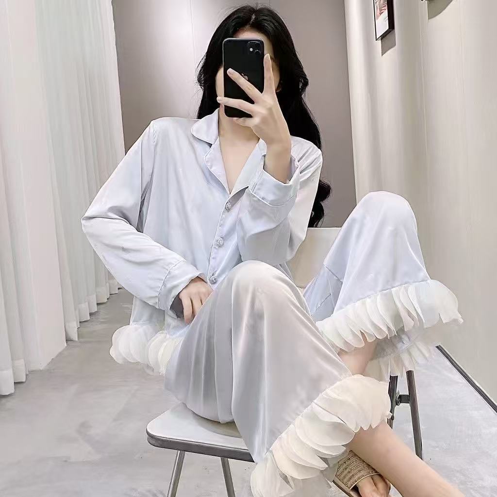 Pijama Francés Recién Llegado Primavera Seda de Hielo Estilo Princesa Dulce Manga Larga Pantalones Traje Delgado Conjunto para Mujer