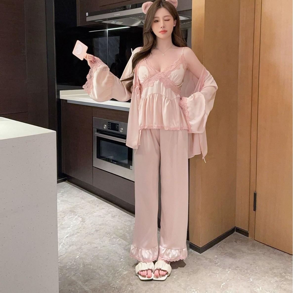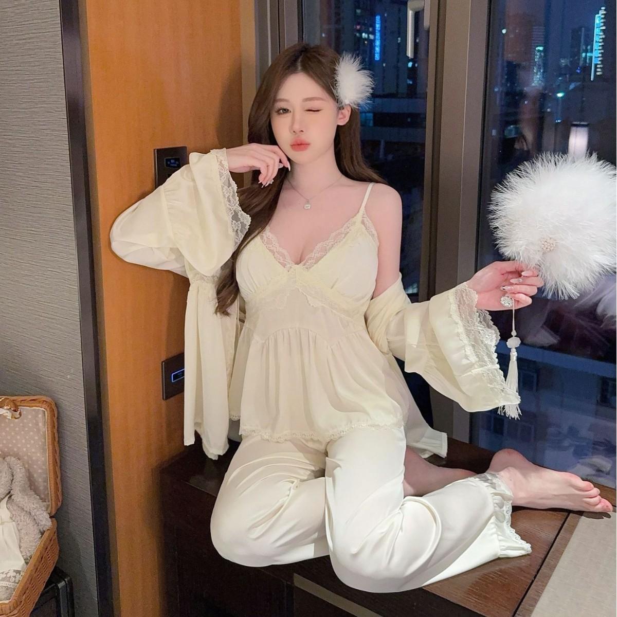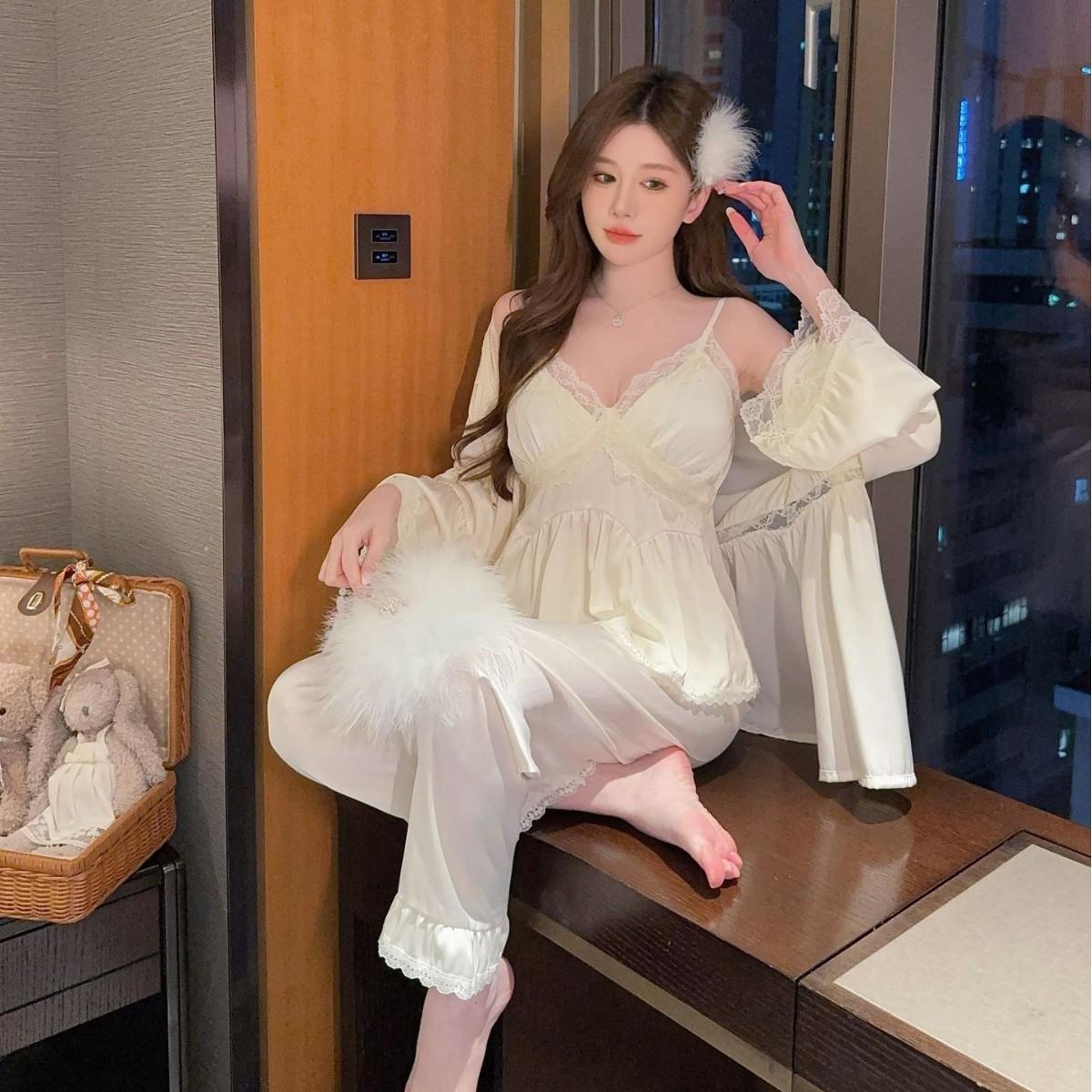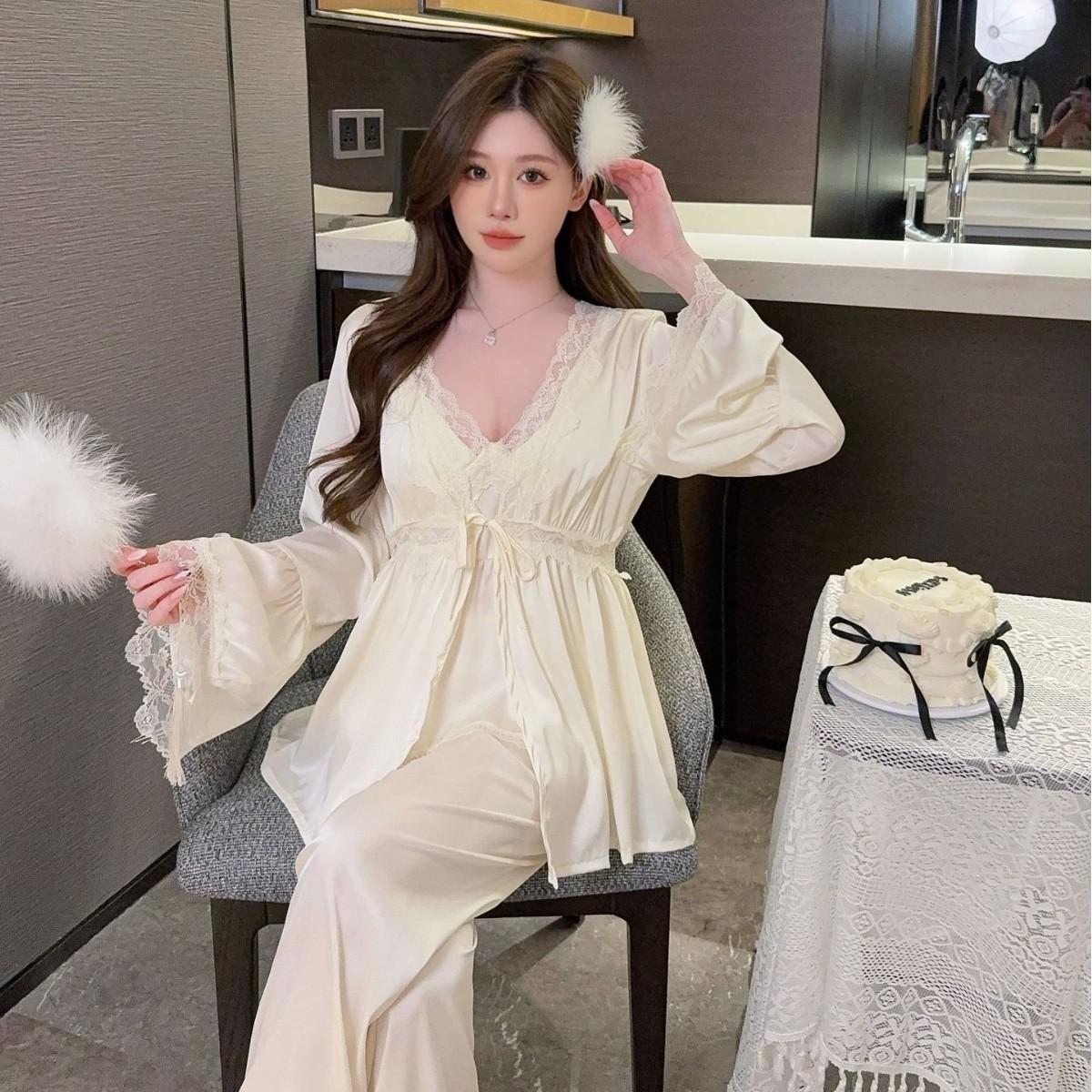 Pijama sexy de estilo francés para mujer, primavera y verano 2025, de alta gama, informal, sencillo, de tres piezas, para el hogar.