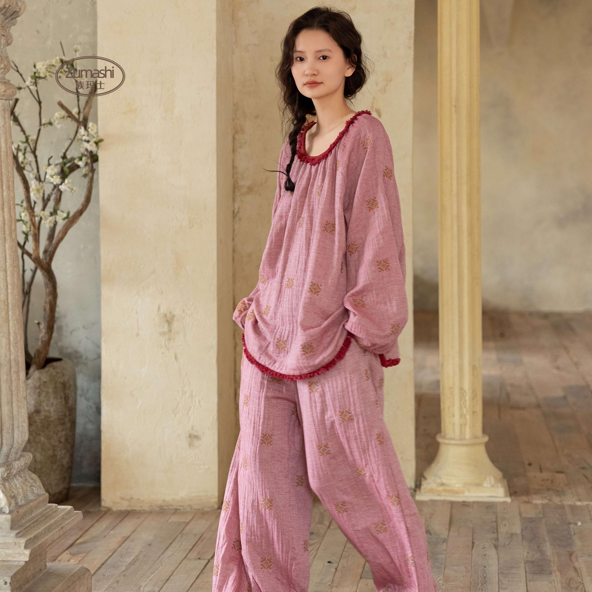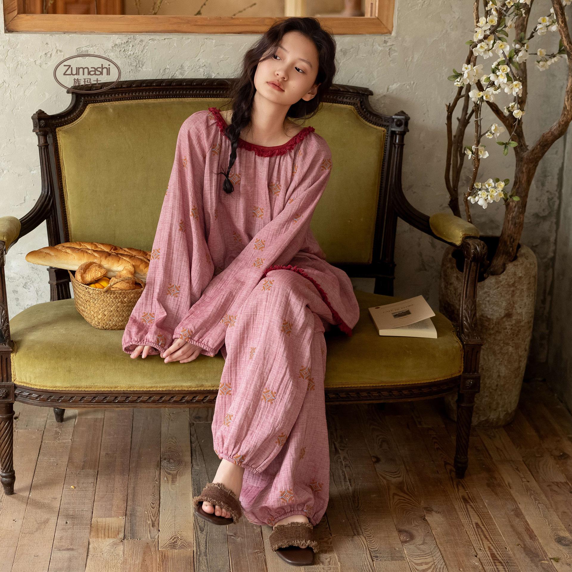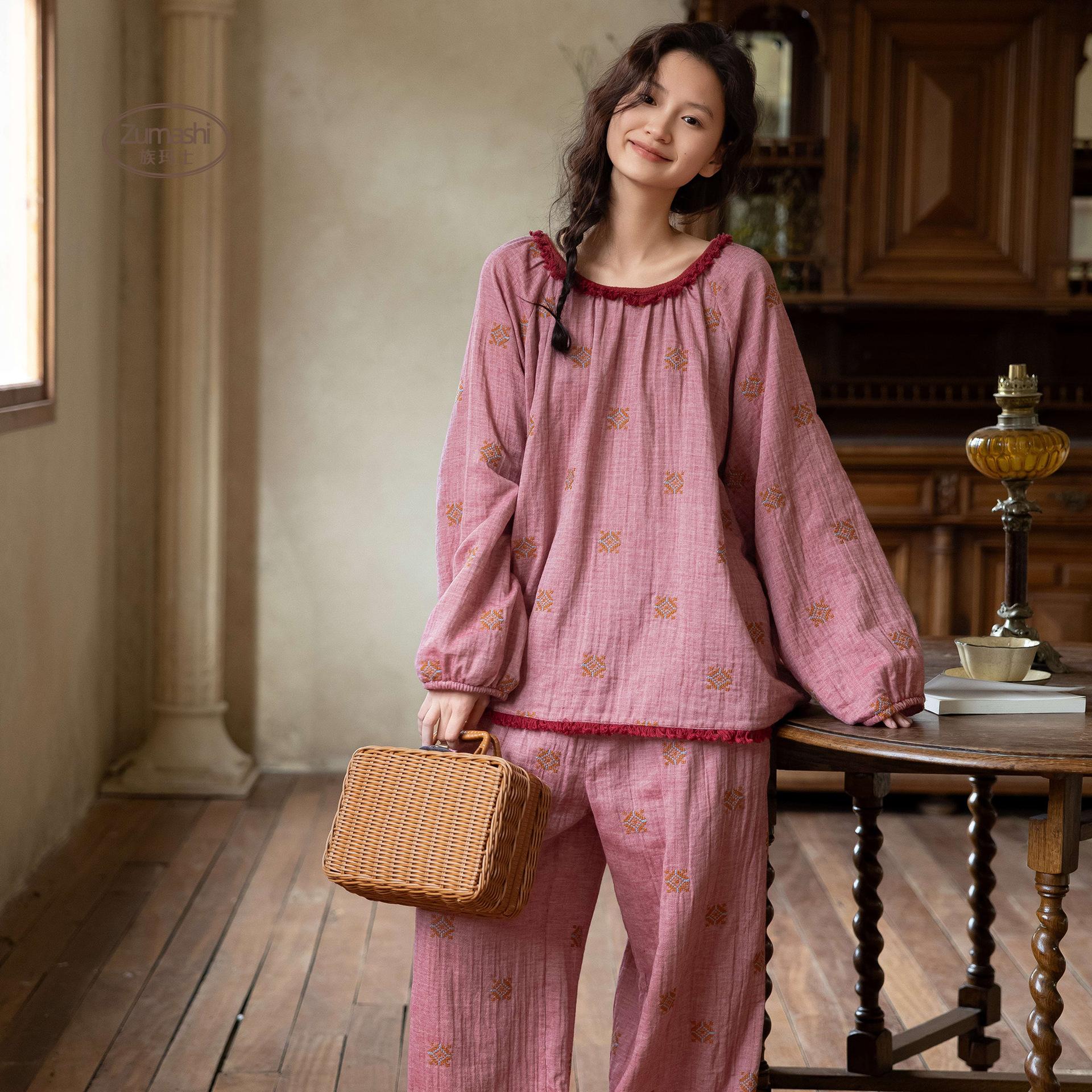 Compra Pijama de Gasa de Algodón Puro Zumashi Primavera y Otoño para Mujer, Nuevo Manga Larga Pantalón Largo, Conjunto de Ropa de Dormir Bordado Rosa 200 al por mayor en Joom.pro