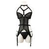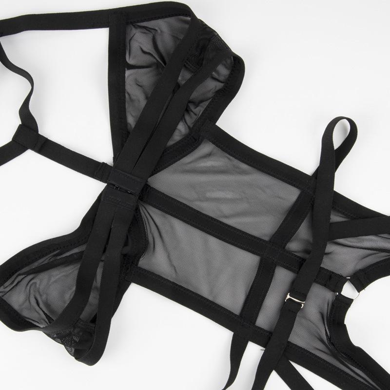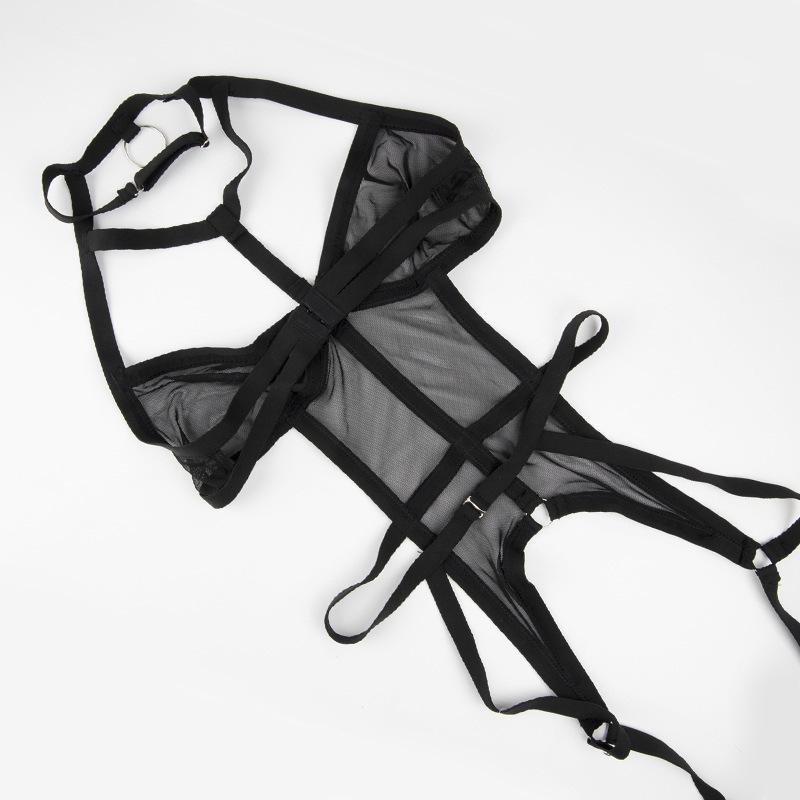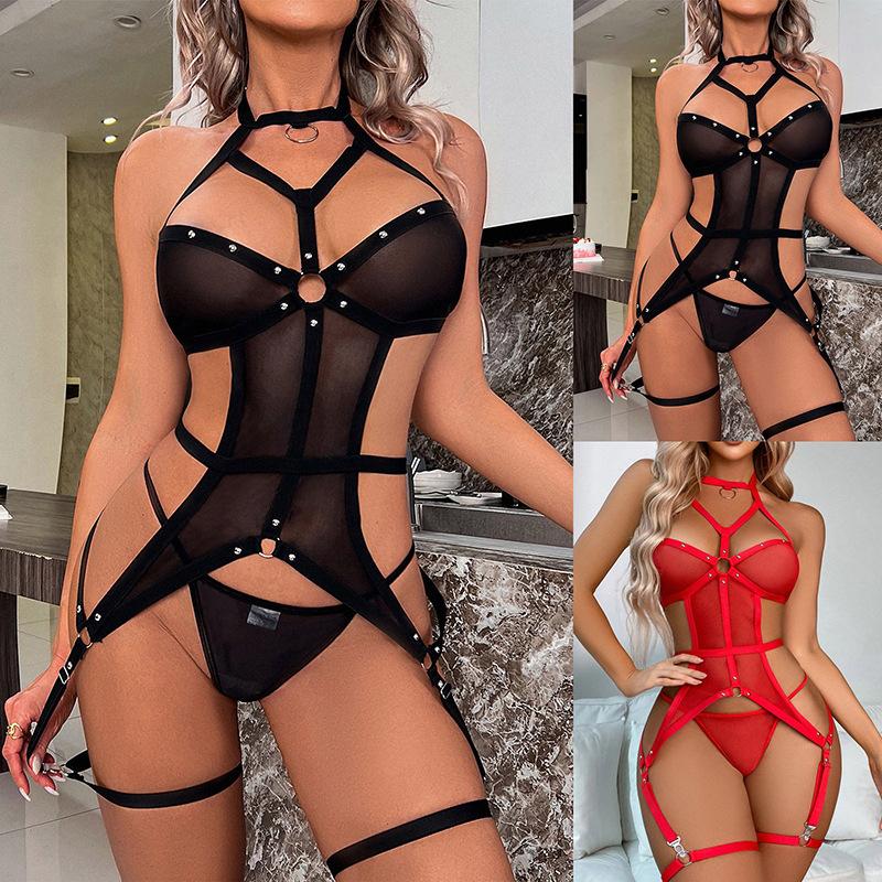 Comercio exterior transfronterizo Traje SM sexy de perspectiva hueca de malla con cinta de remaches para mujer, costuras de tiras huecas, cubierta divertida