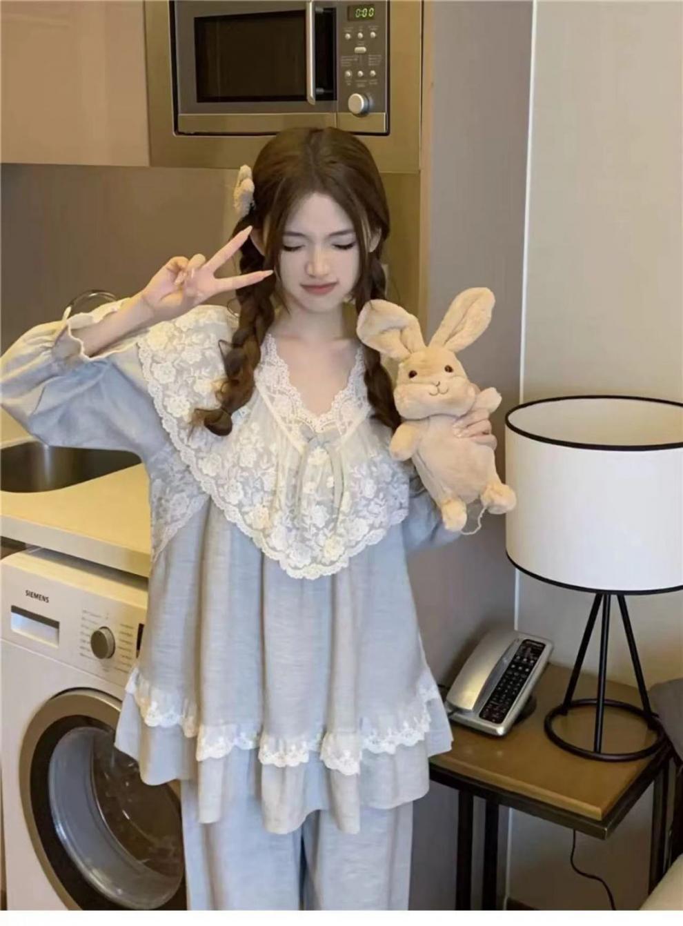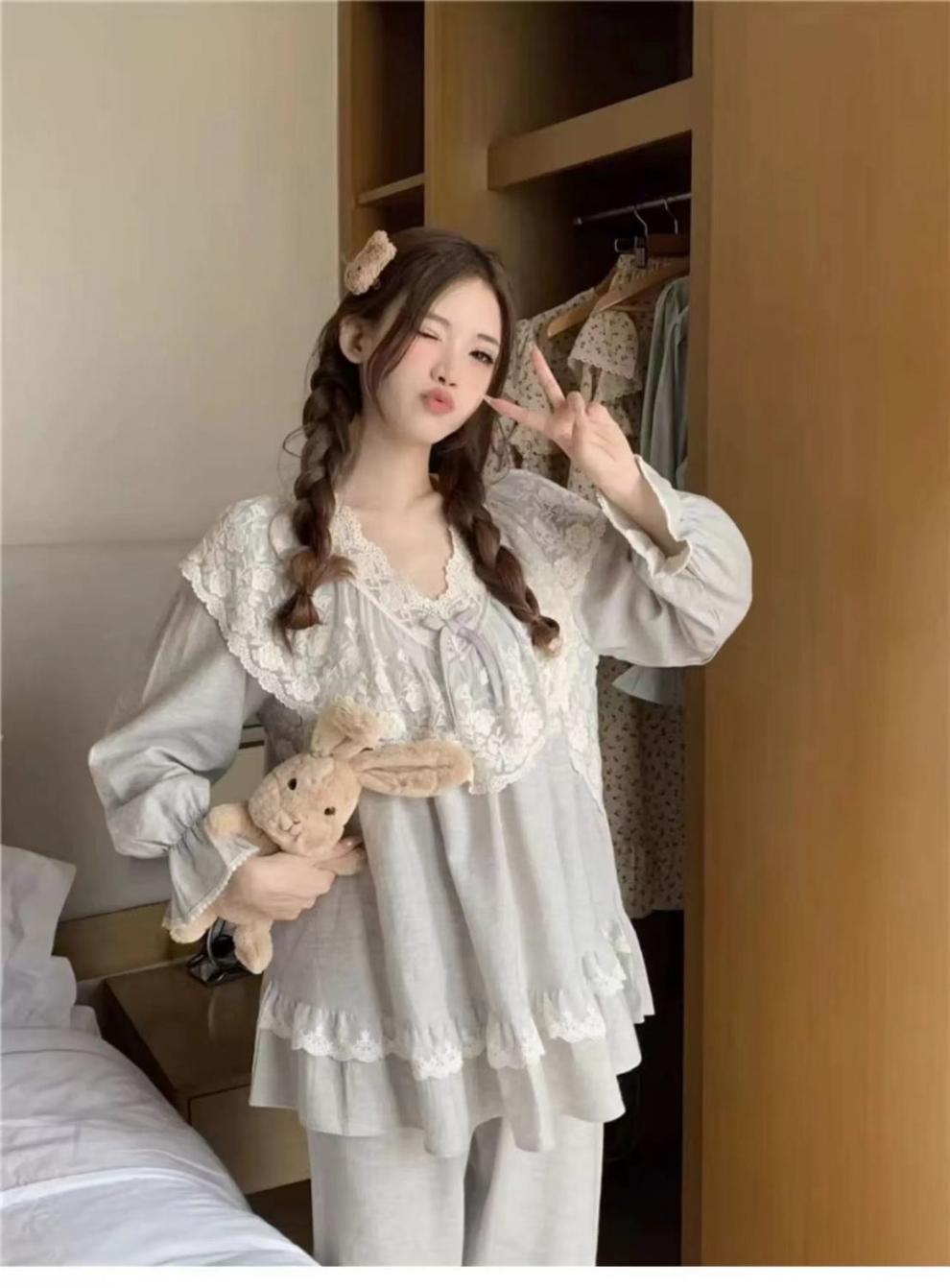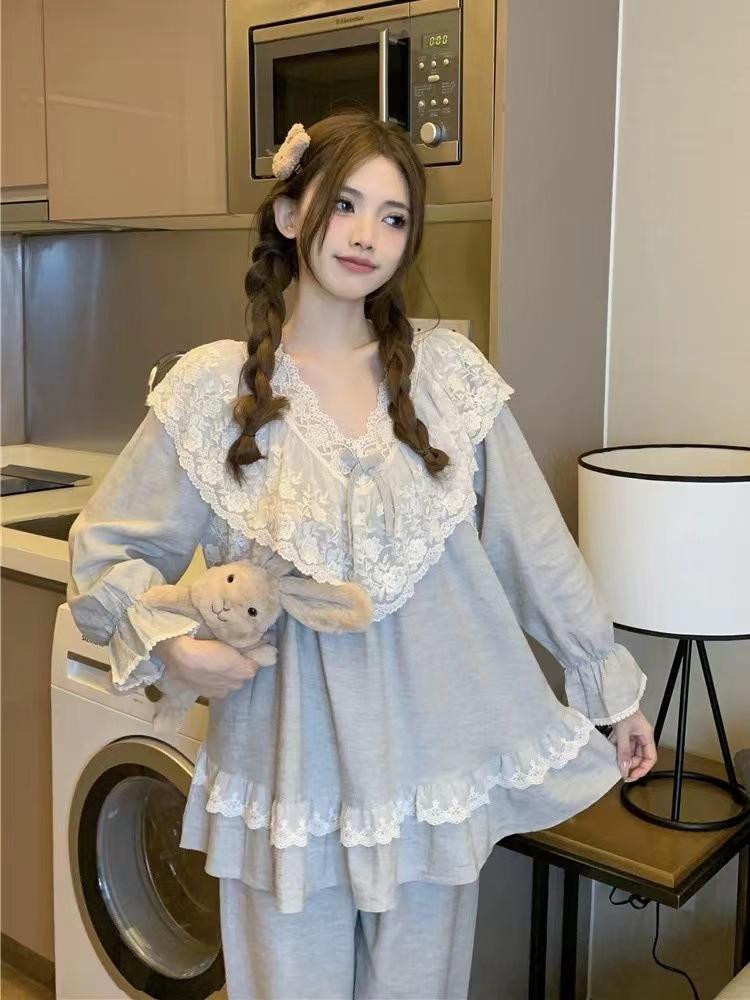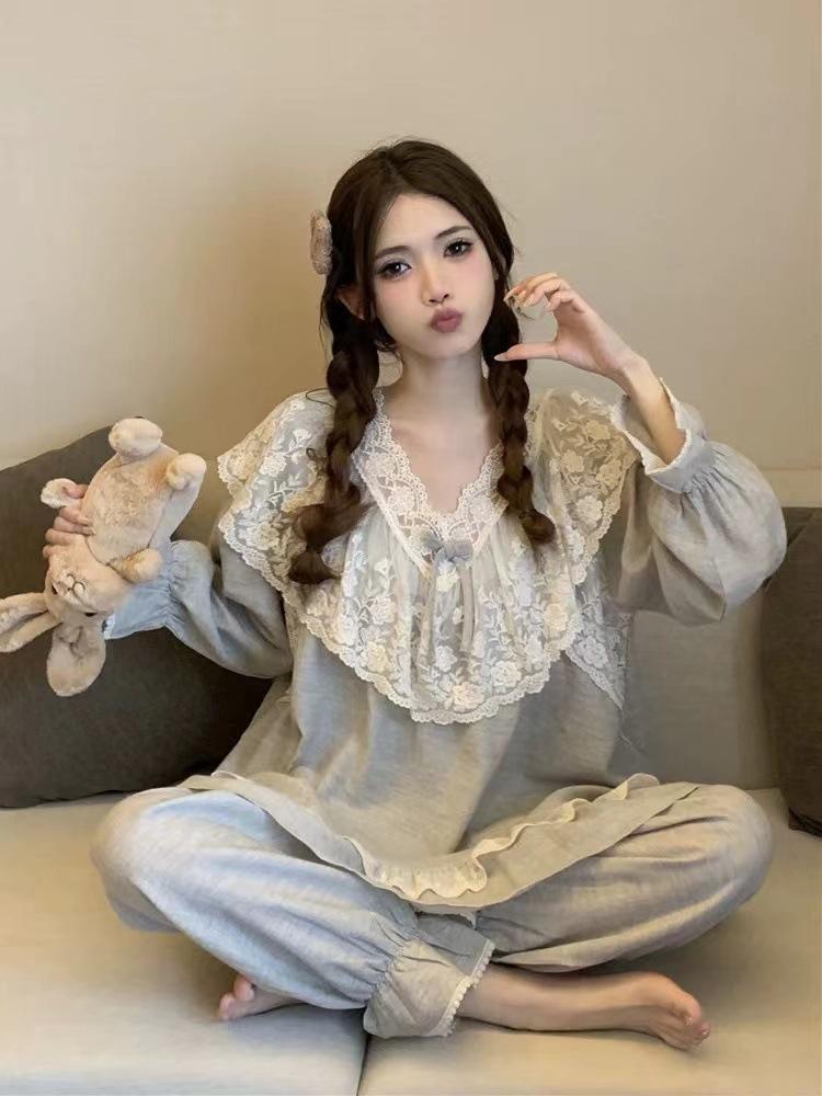 Pijamas de manga larga para mujer, primavera y otoño, estilo princesa, con encaje dulce, ropa de casa para traje, ropa exterior.