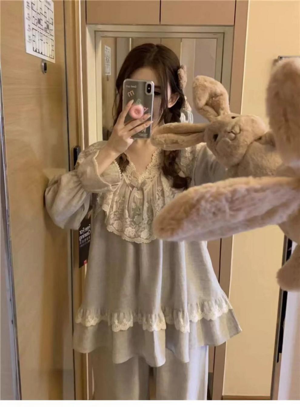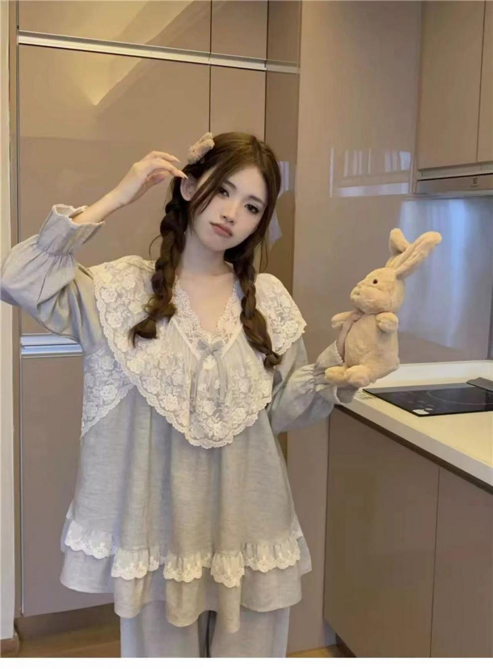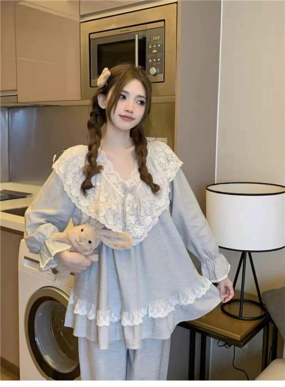 Pijamas de manga larga para mujer, primavera y otoño, estilo princesa, con encaje dulce, ropa de casa para traje, ropa exterior.