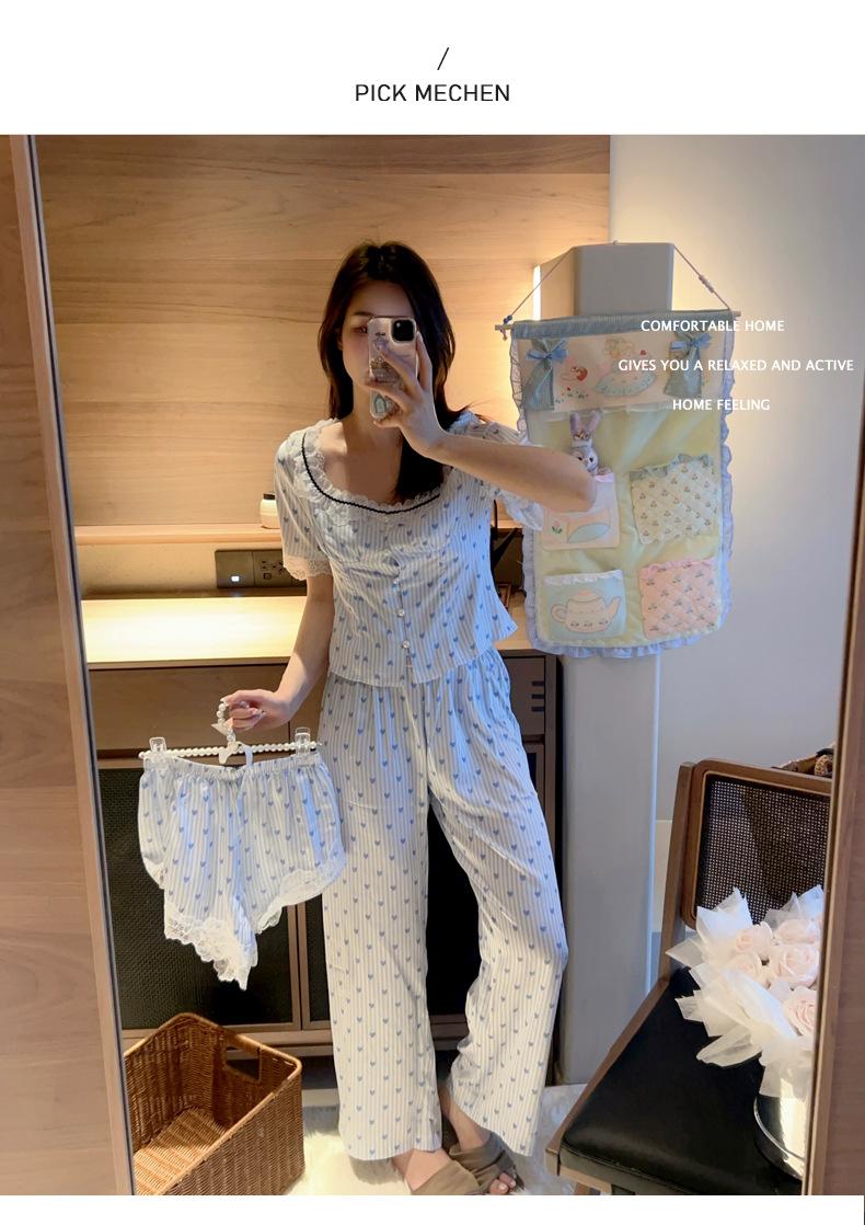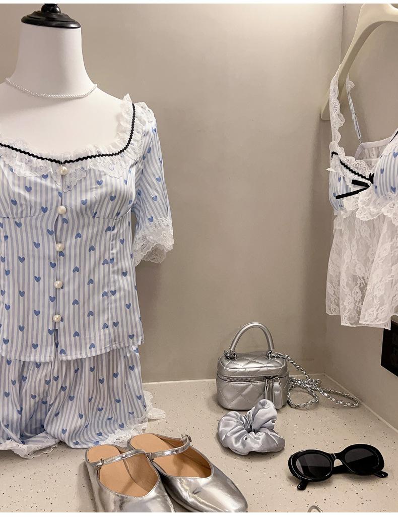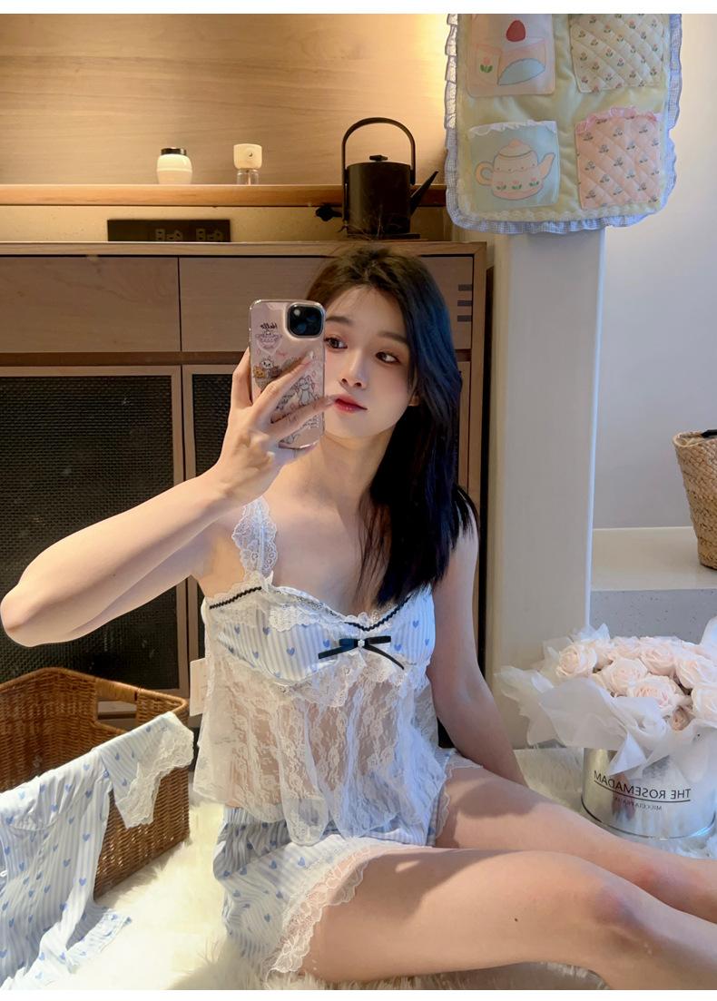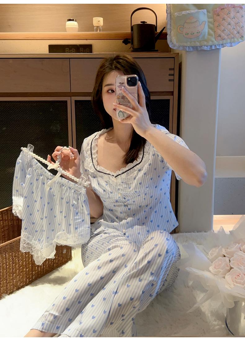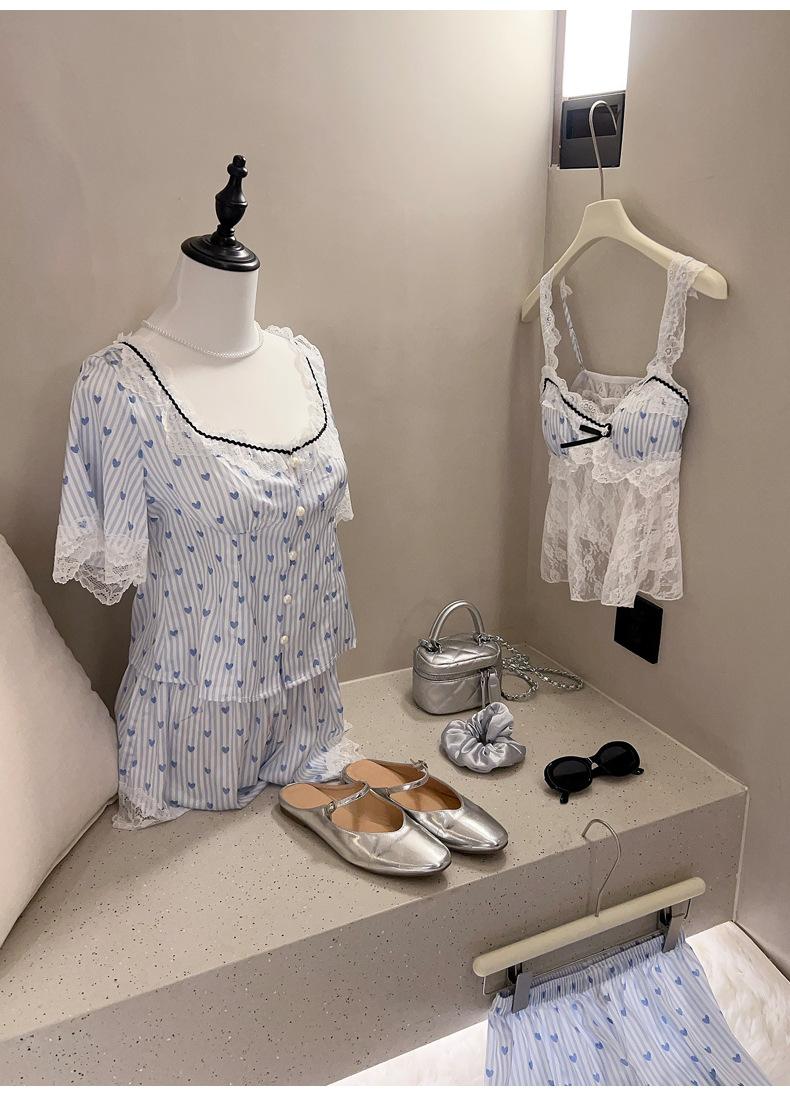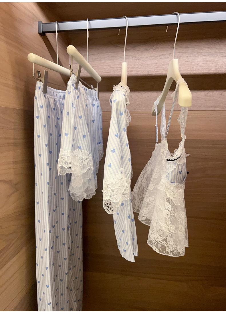 Pijama Estilo Sexy para Mujer Primavera y Verano Seda de Hielo Encaje de Amor Pantalón de Manga Corta Traje de Cuatro Piezas con Almohadilla para el Pecho Ropa para el Hogar