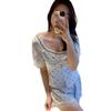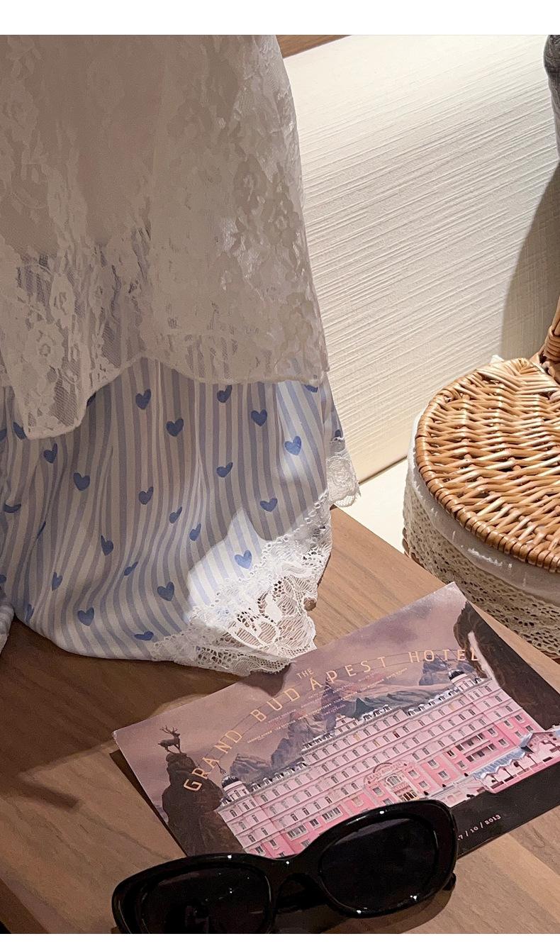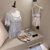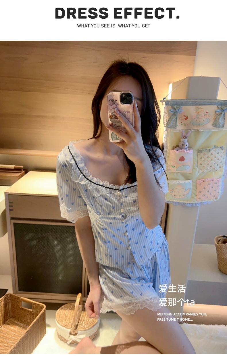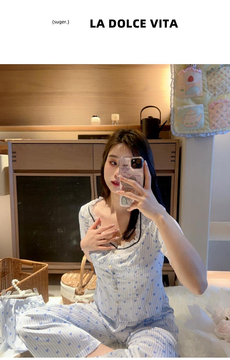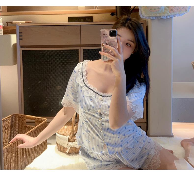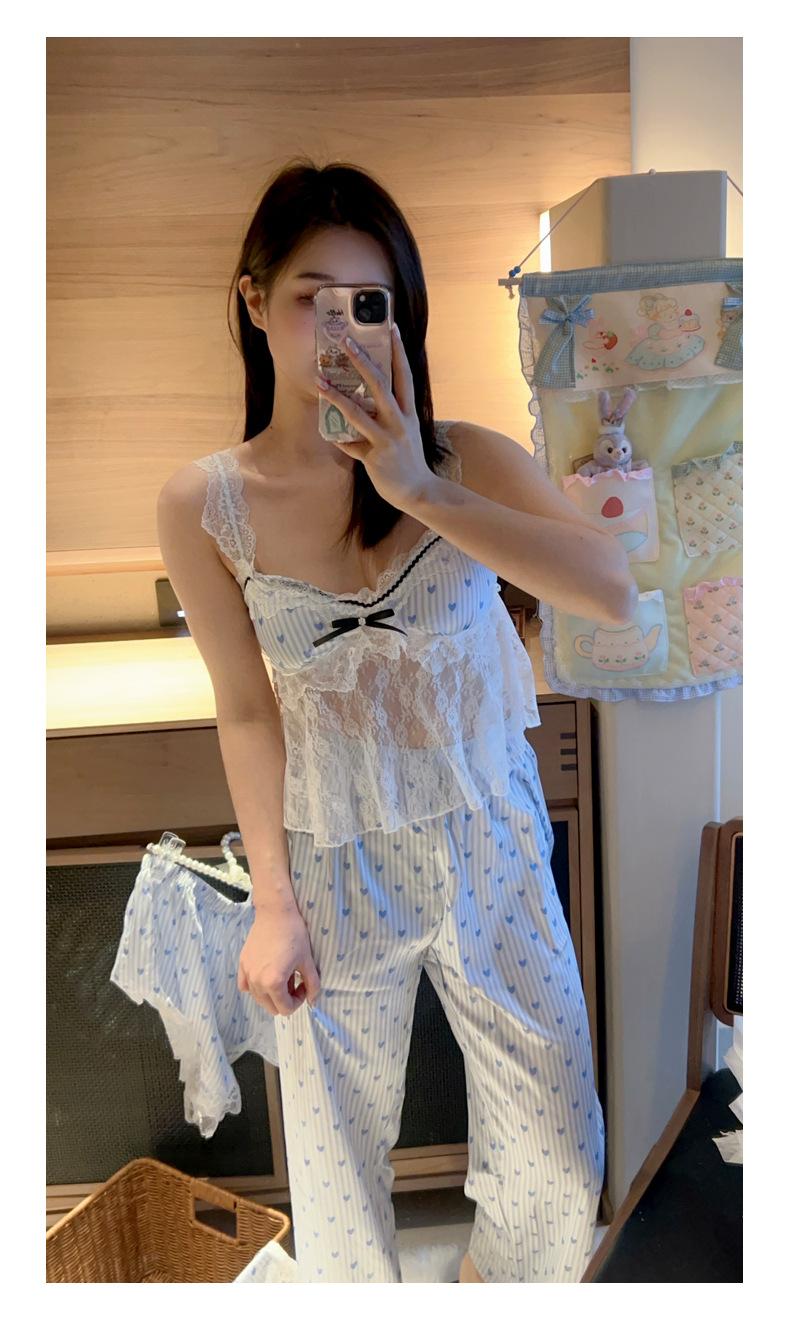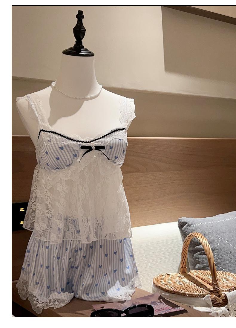Pijama Estilo Sexy para Mujer Primavera y Verano Seda de Hielo Encaje de Amor Pantalón de Manga Corta Traje de Cuatro Piezas con Almohadilla para el Pecho Ropa para el Hogar