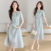 Cintura Eslendida Largo Medio 2025 Nuevo Verano Vestido de Manga Corta Moda Femenina Cintura Alta Cuello Redondo Falda Línea A
