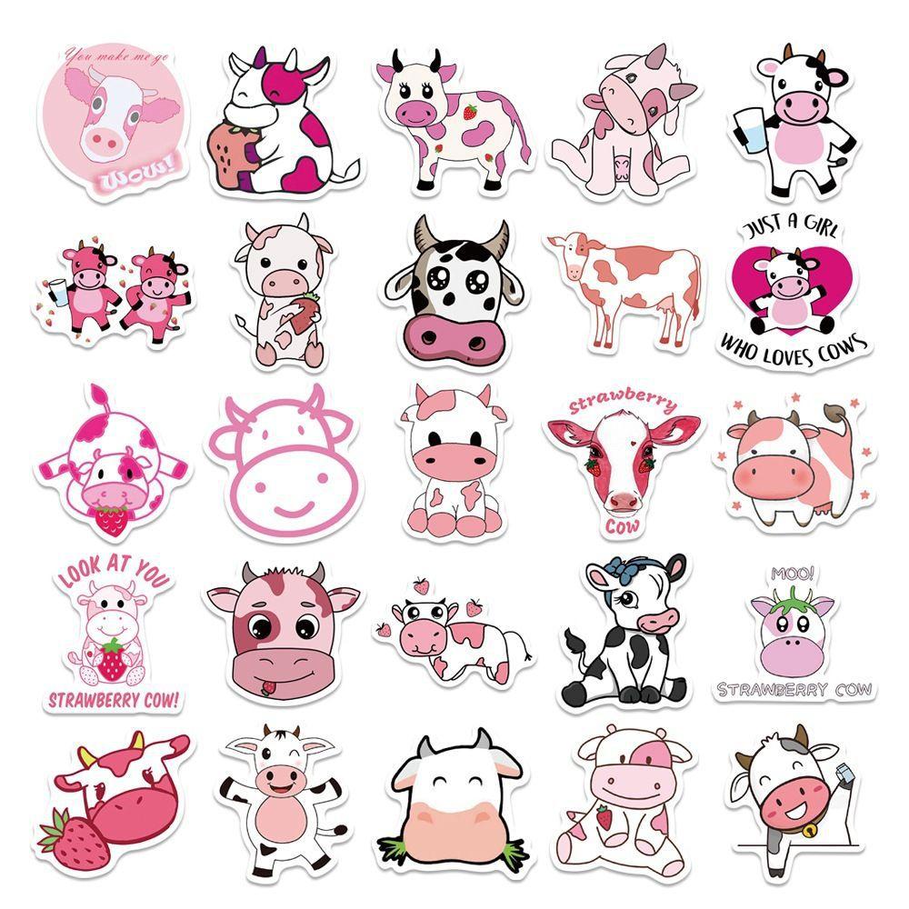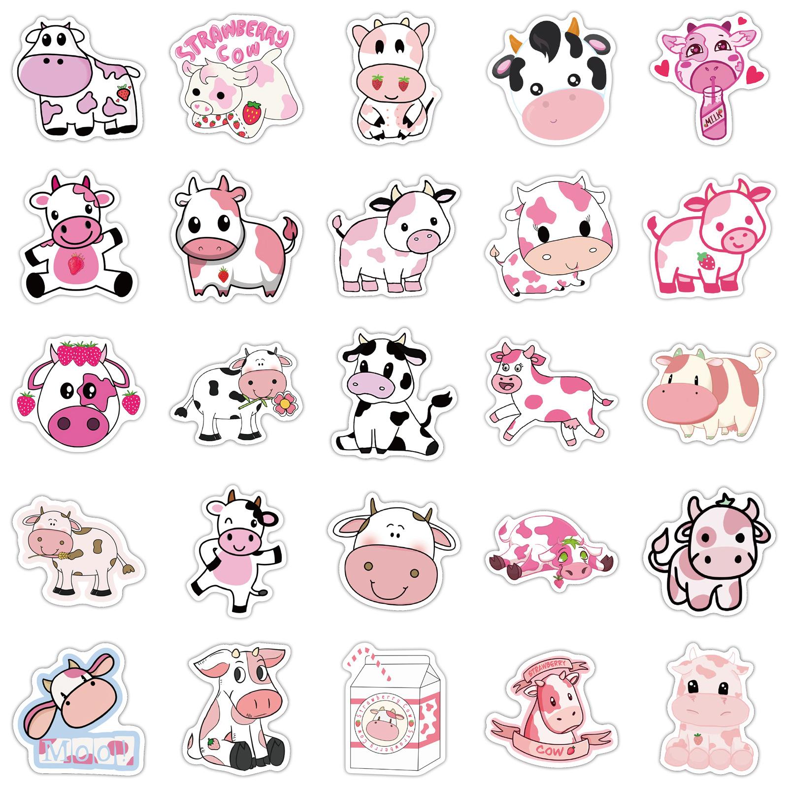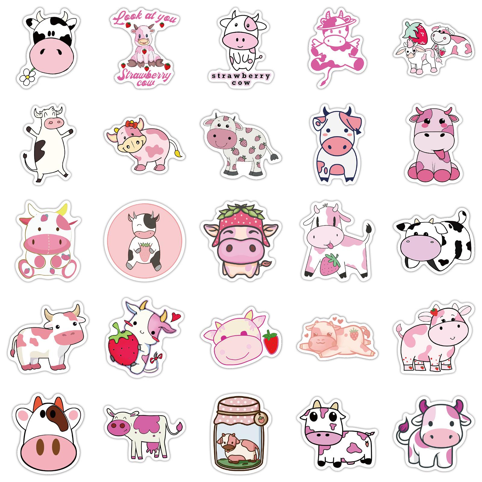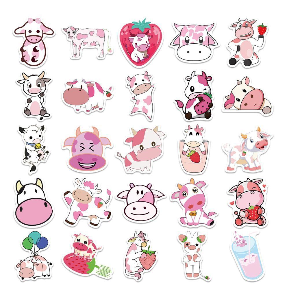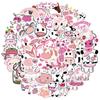 50 pegatinas de grafiti de vaca de dibujos animados de color rosa intenso con borde cruzado, para funda de teléfono, cuaderno, decorativas, impermeables y extraíbles.
