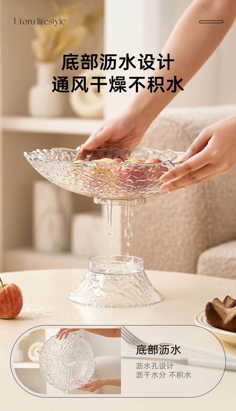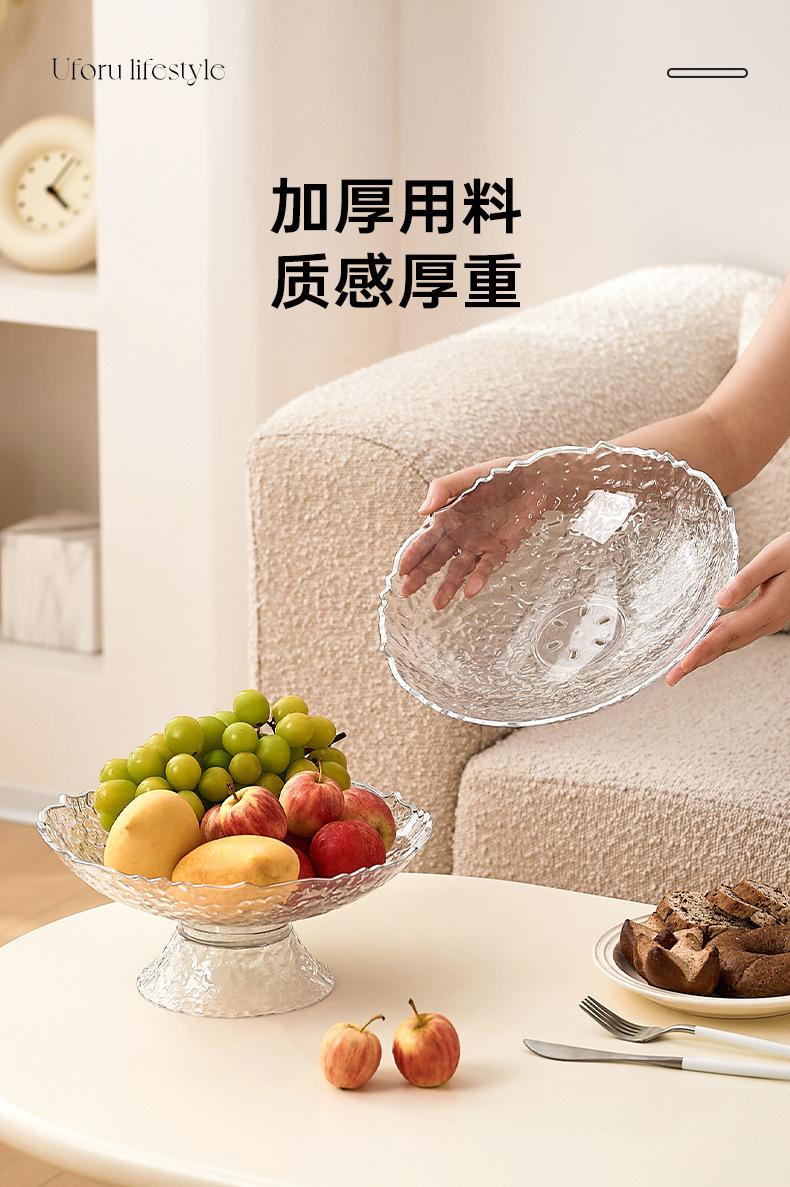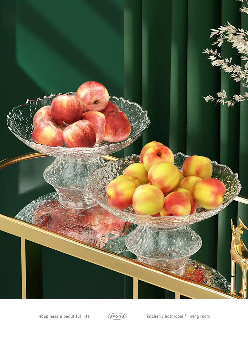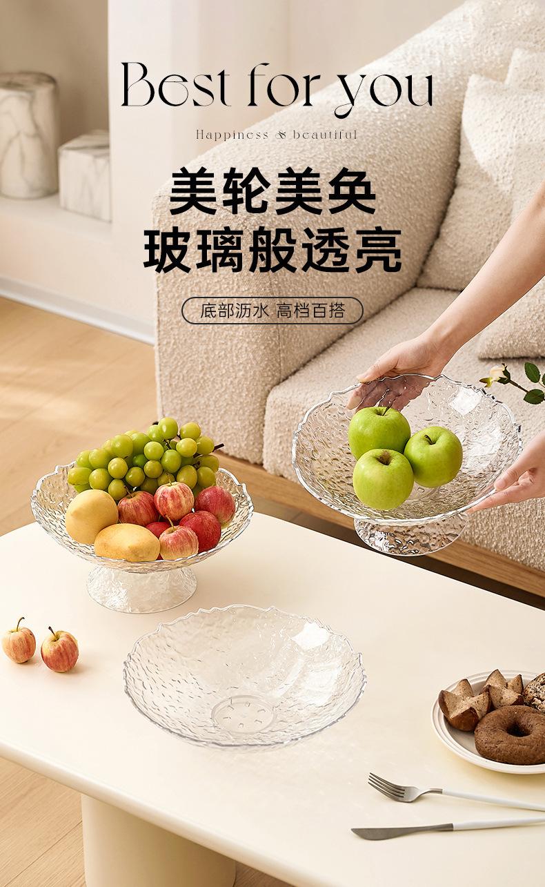 Plato de fruta de vidrio de nuevo estilo para el hogar, sala de estar, plato de fruta con drenaje, plato de fruta seca de lujo ligero y transparente de alta calidad, estilo japonés
