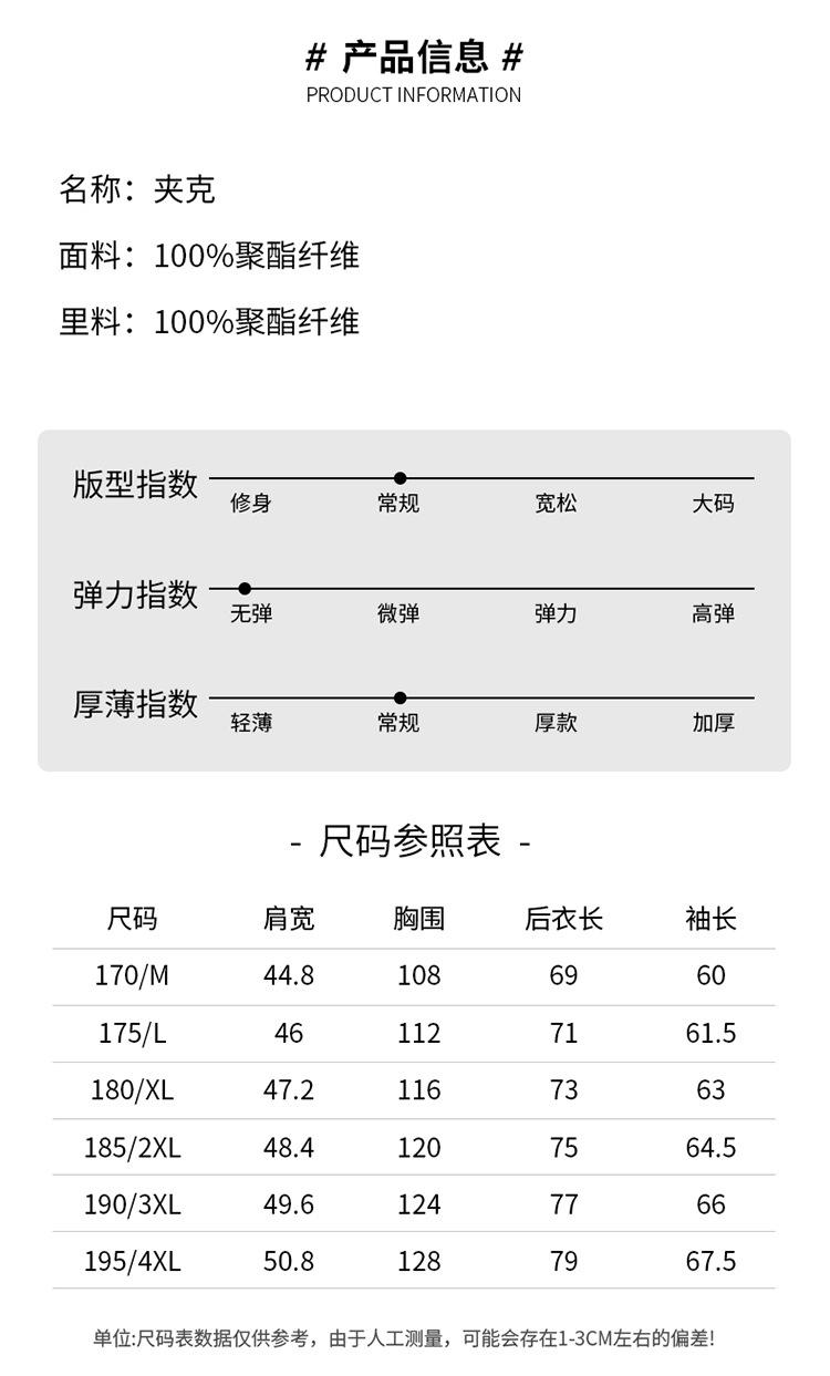170/M, 175/L, 180/XL, 185/2XL, 190/3XL, 195/4XL