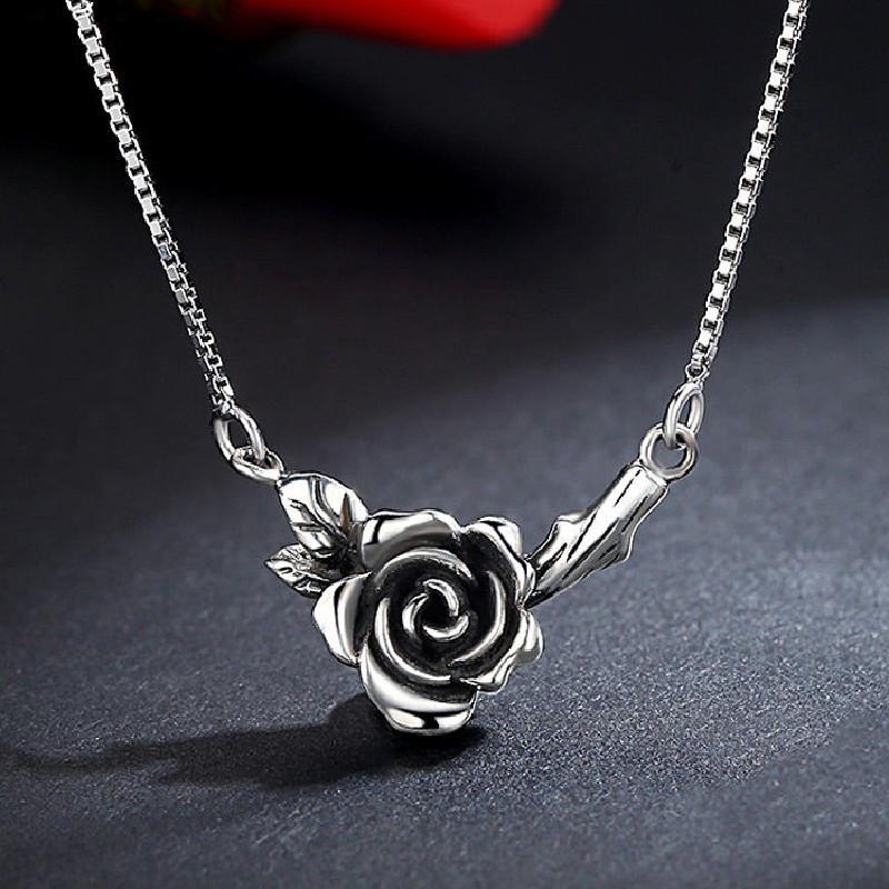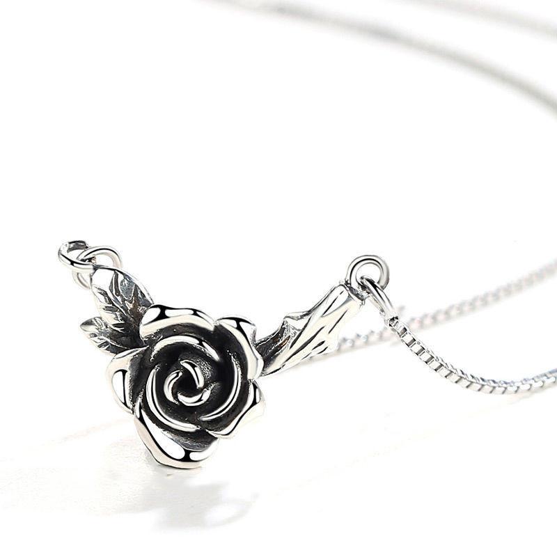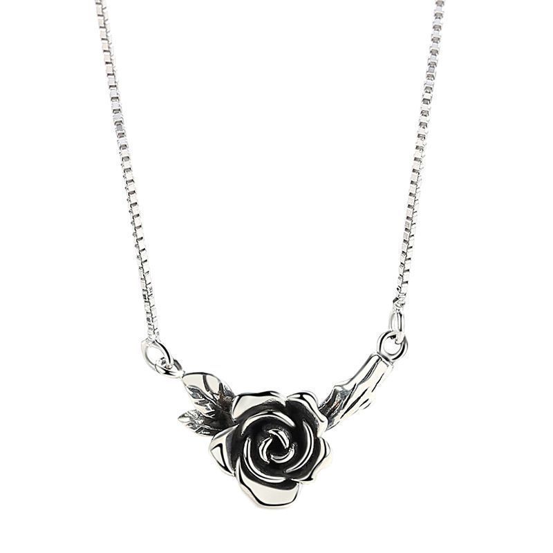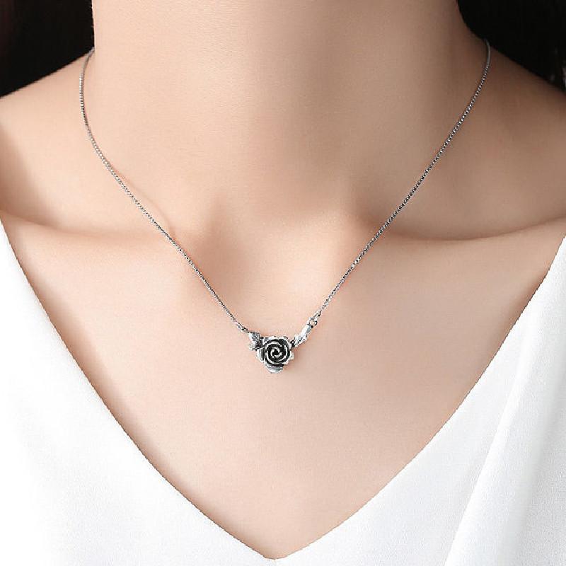 Nuevo collar de rosa negra de plata tailandesa retro de estilo japonés y coreano para mujer, collar personalizado con cadena de clavícula desgastada de temperamento simple a la moda