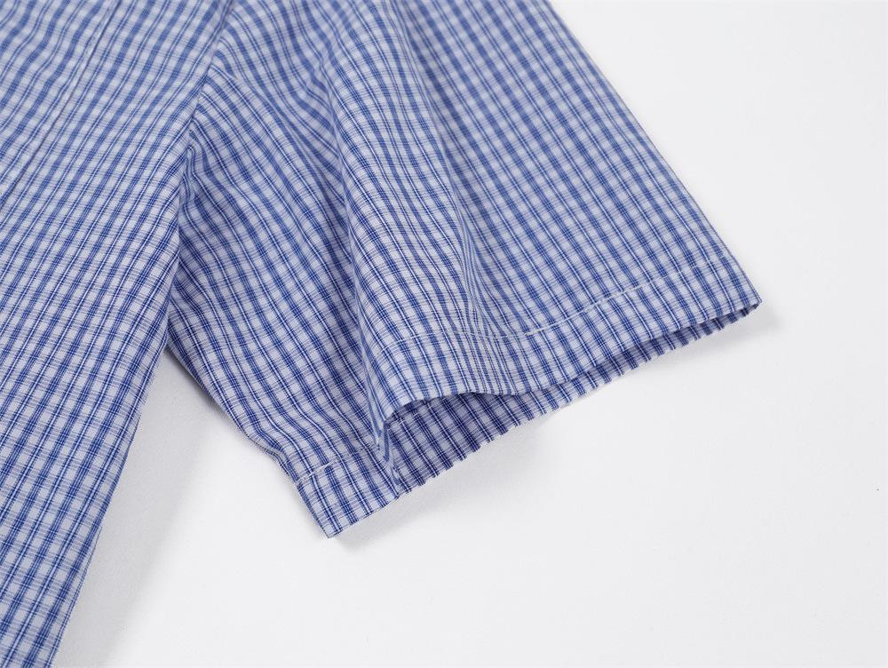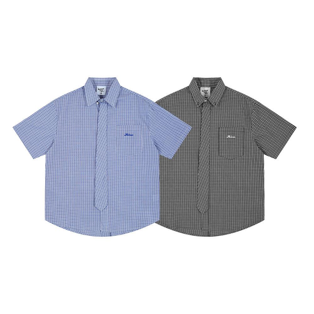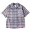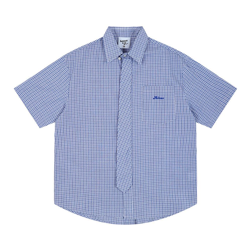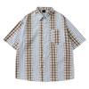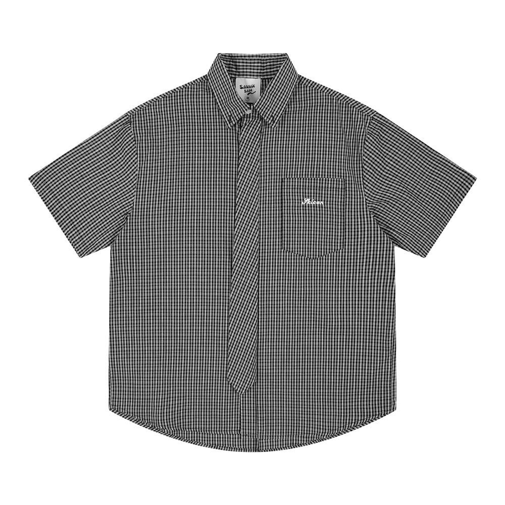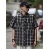Camisa de manga corta con lazo decorativo a cuadros finos para hombre, estilo retro de verano, holgada, informal, de media manga, con solapa, a la moda
