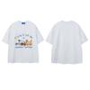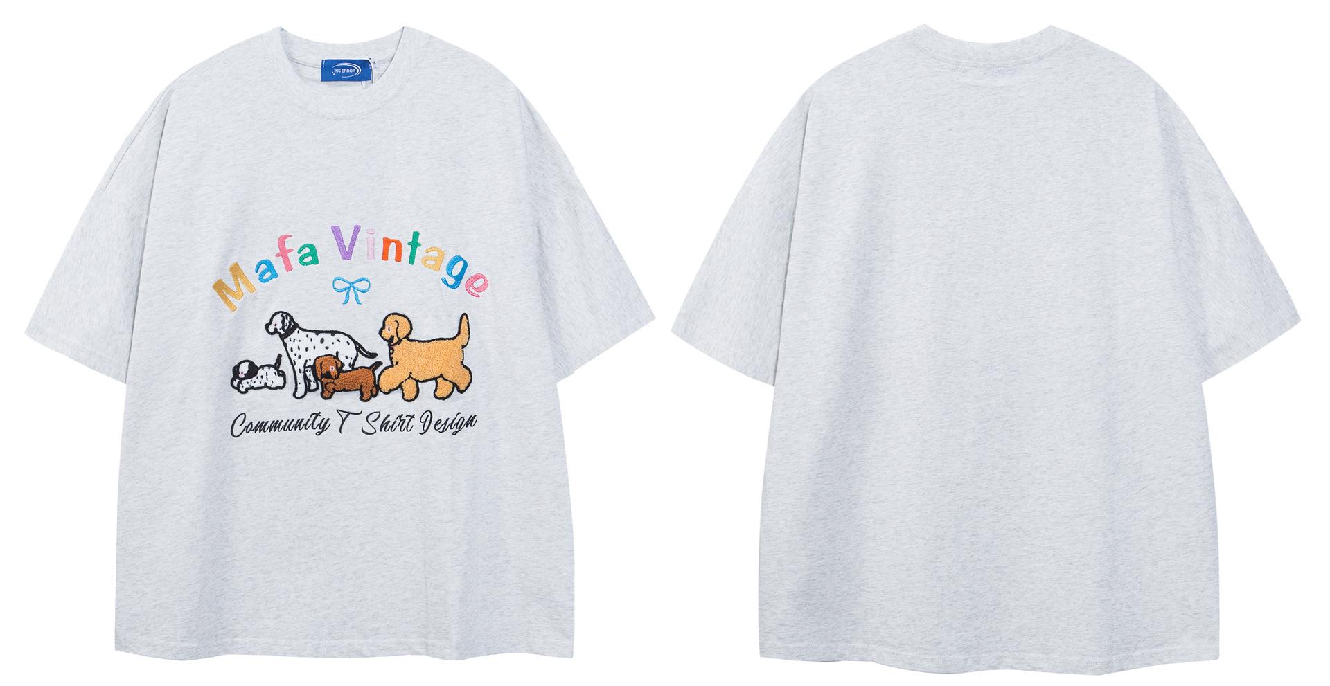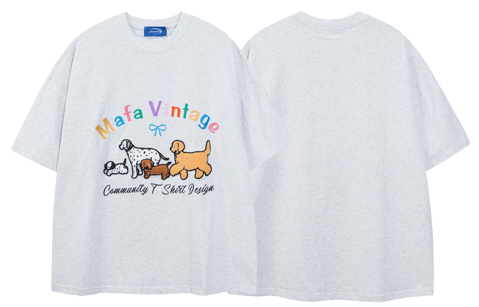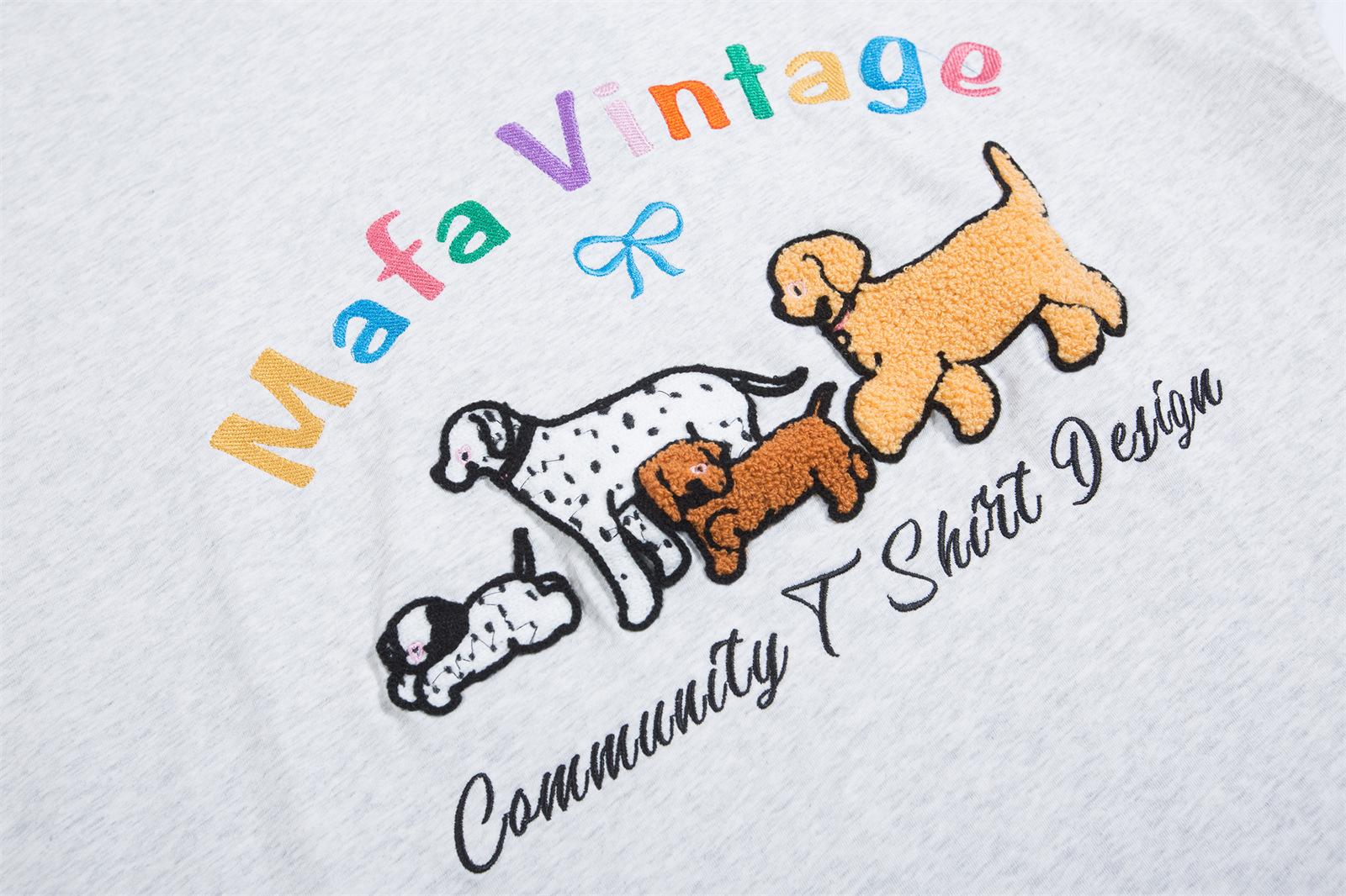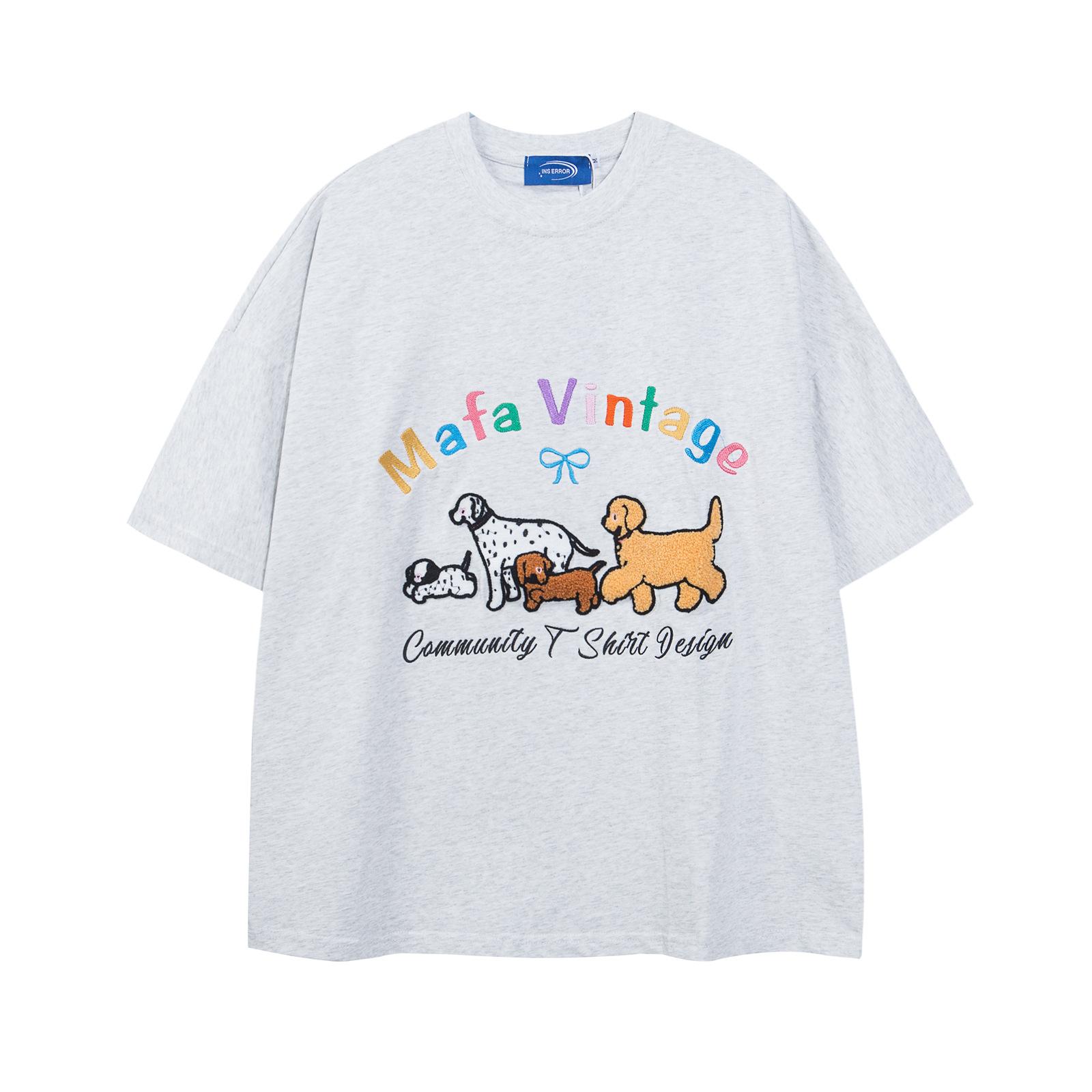 Camiseta de manga corta estilo americano retro con diseño bordado de letras de cachorro, holgada e informal de verano para hombre y mujer.