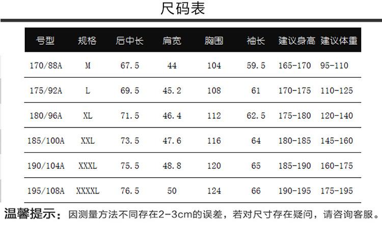 170/M, 175/L, 180/XL, 185/2XL, 190/3XL, 195/4XL