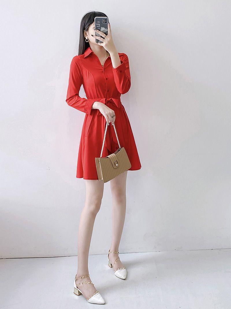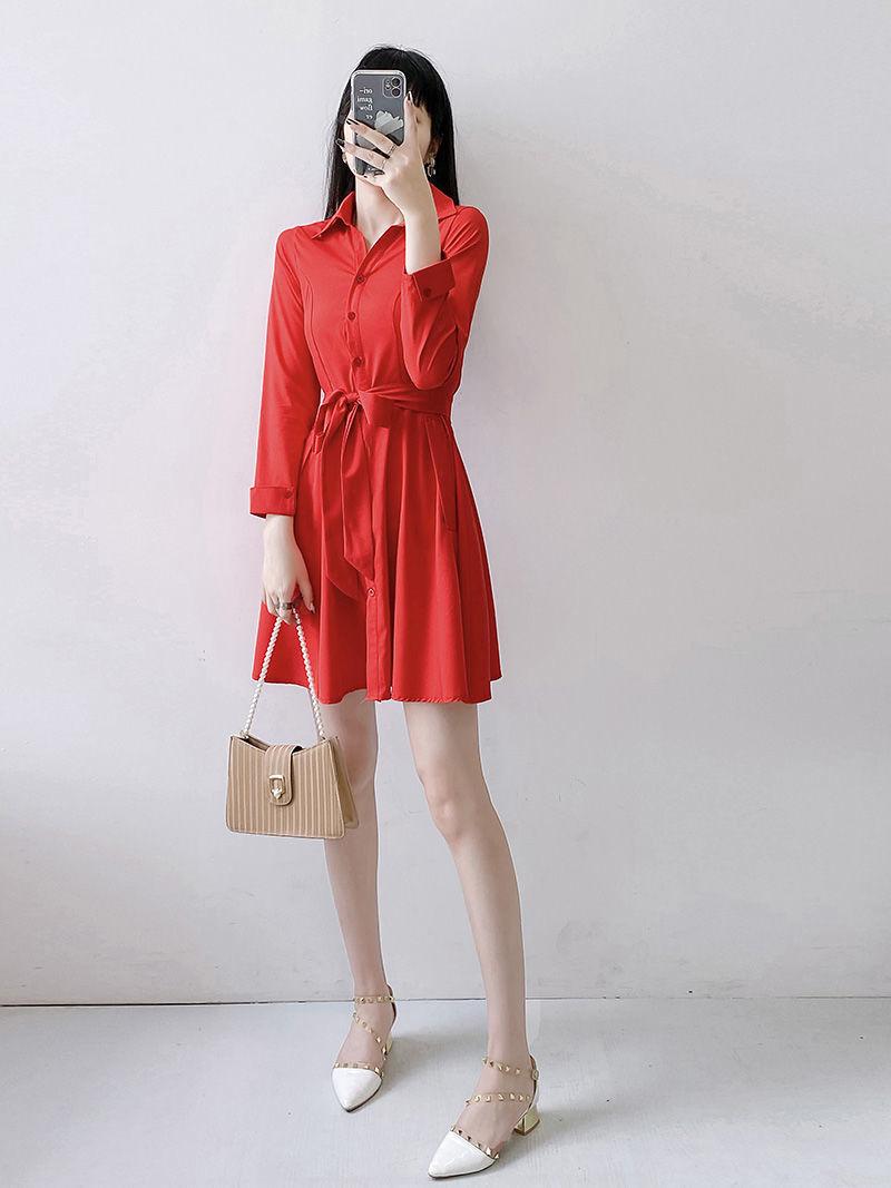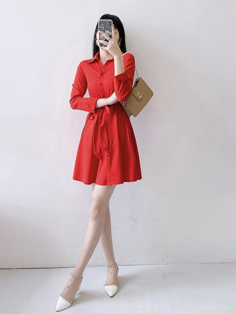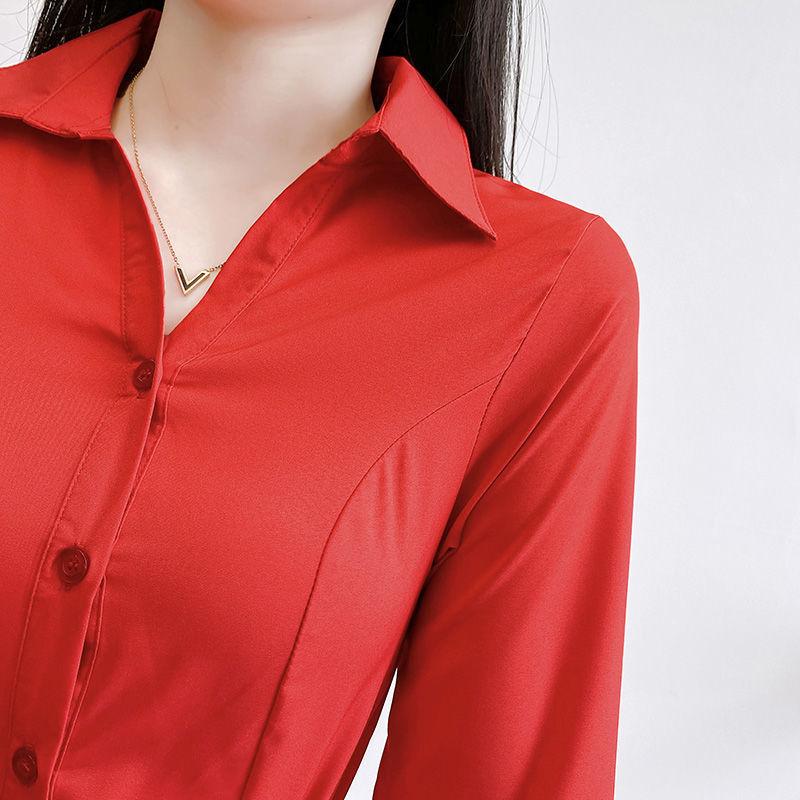Compra Vestido de cuello en V estilo coreano para primavera y verano, nuevo estilo coreano, corte entallado, largo medio, moda, manga larga, elegante camisa roja, envío gratis al por mayor en Joom.pro