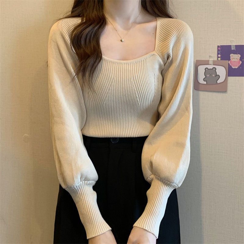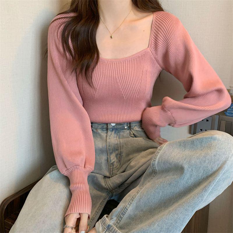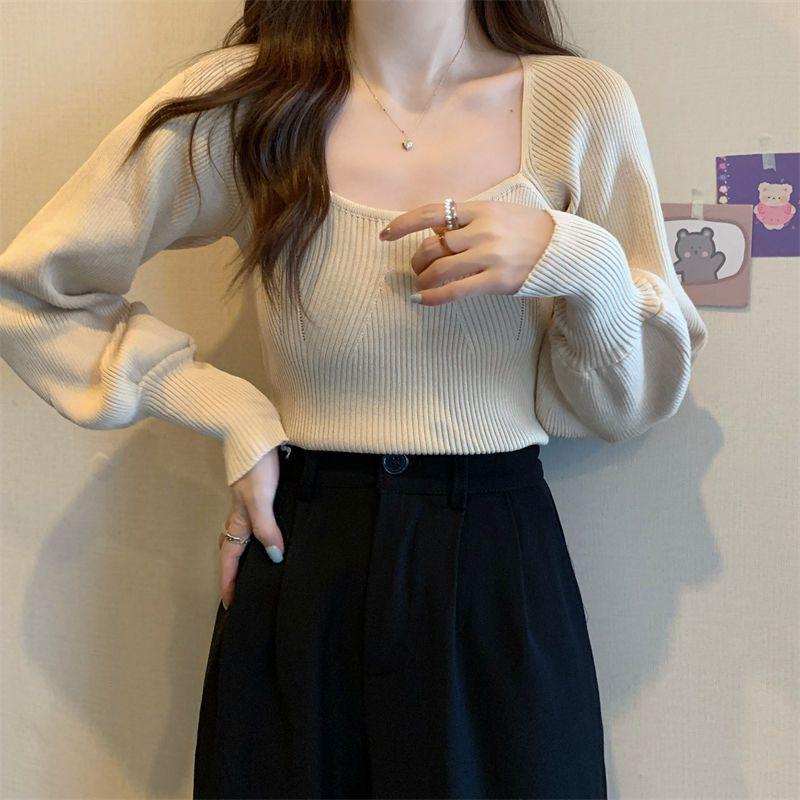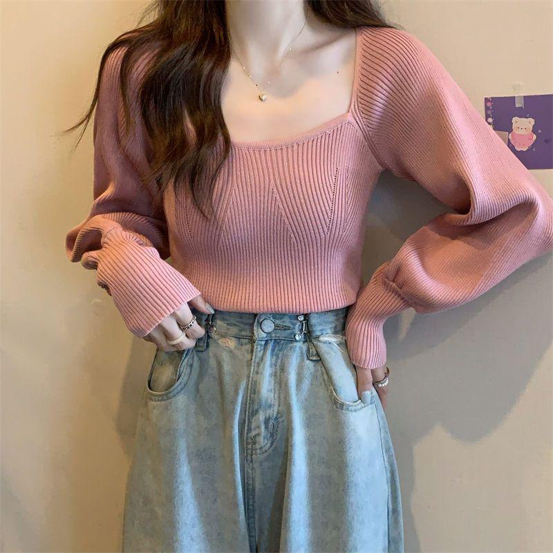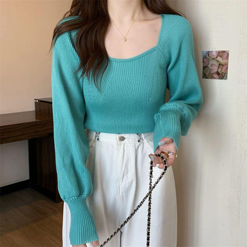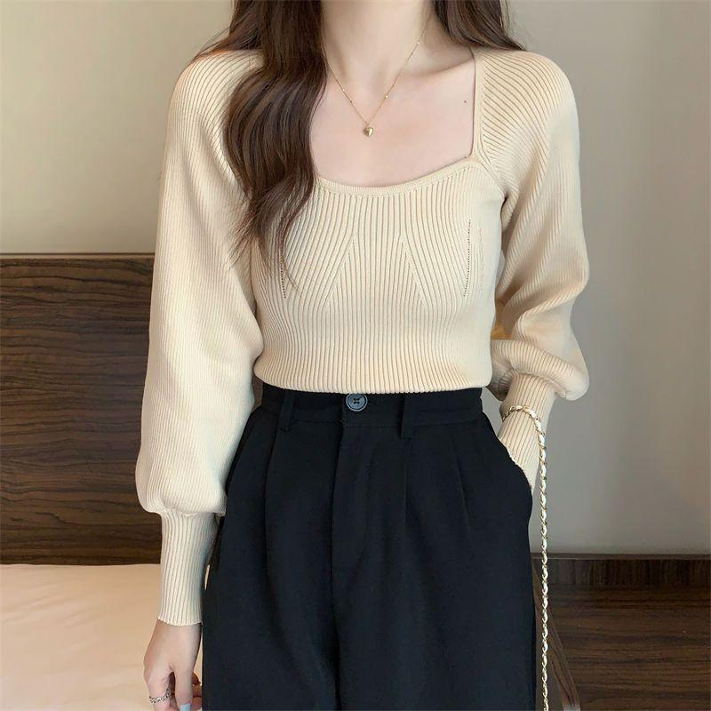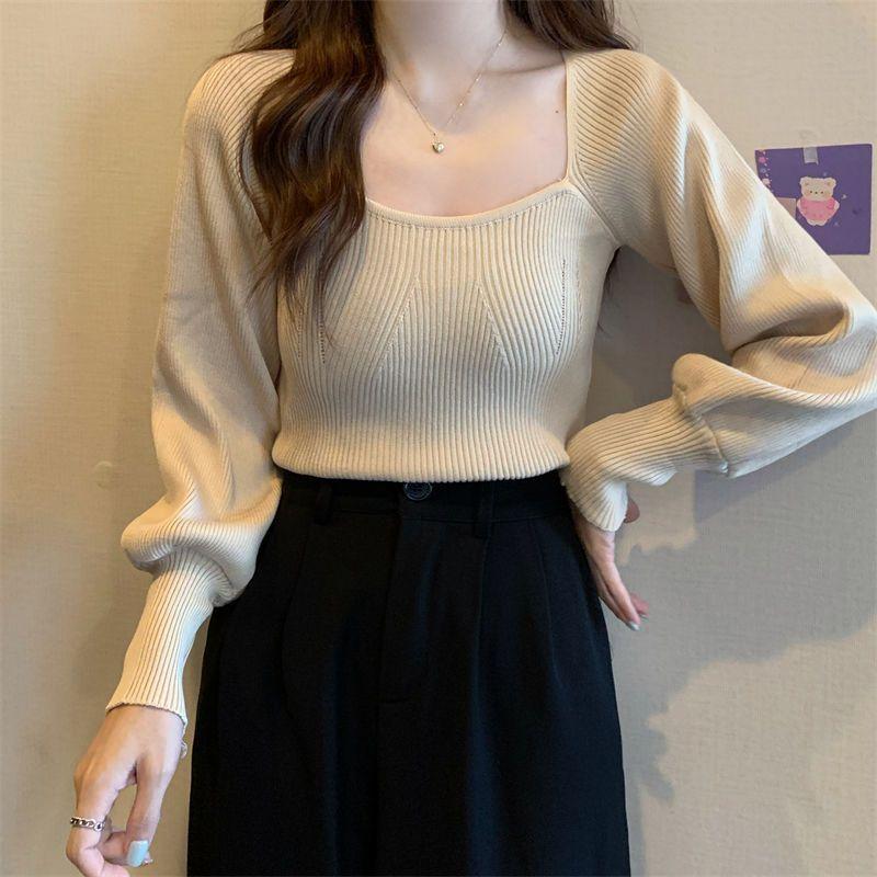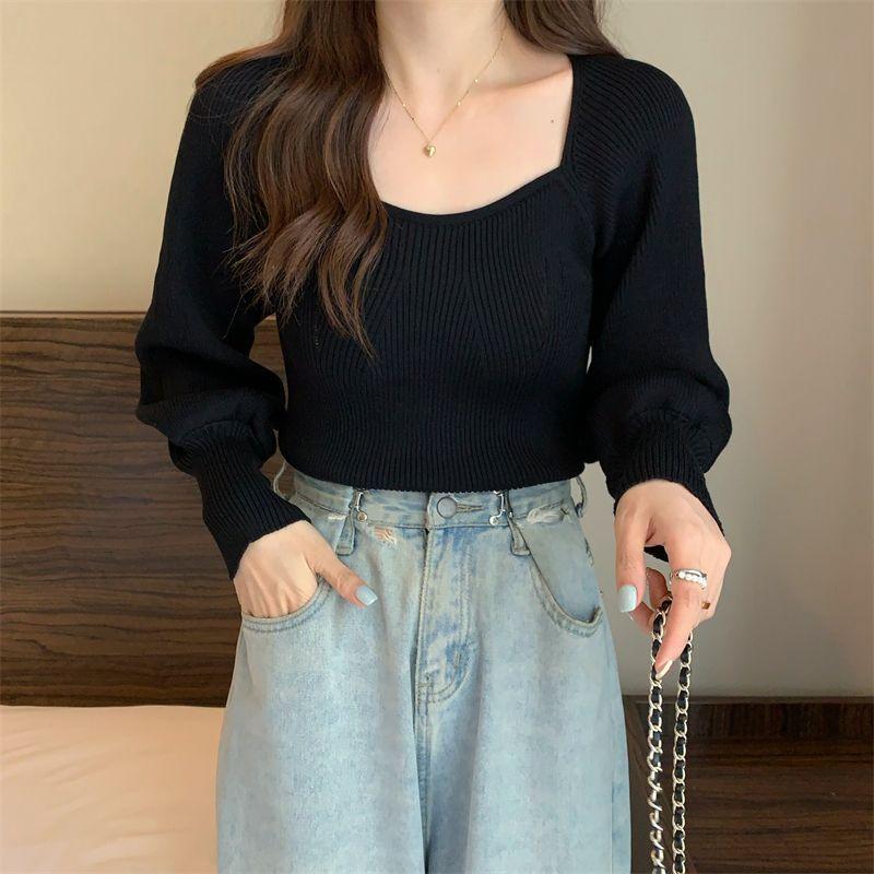 Suéter de cuello cuadrado Design Sense 2024 para mujer, suéter básico corto ajustado de primavera y otoño, moderno y versátil.