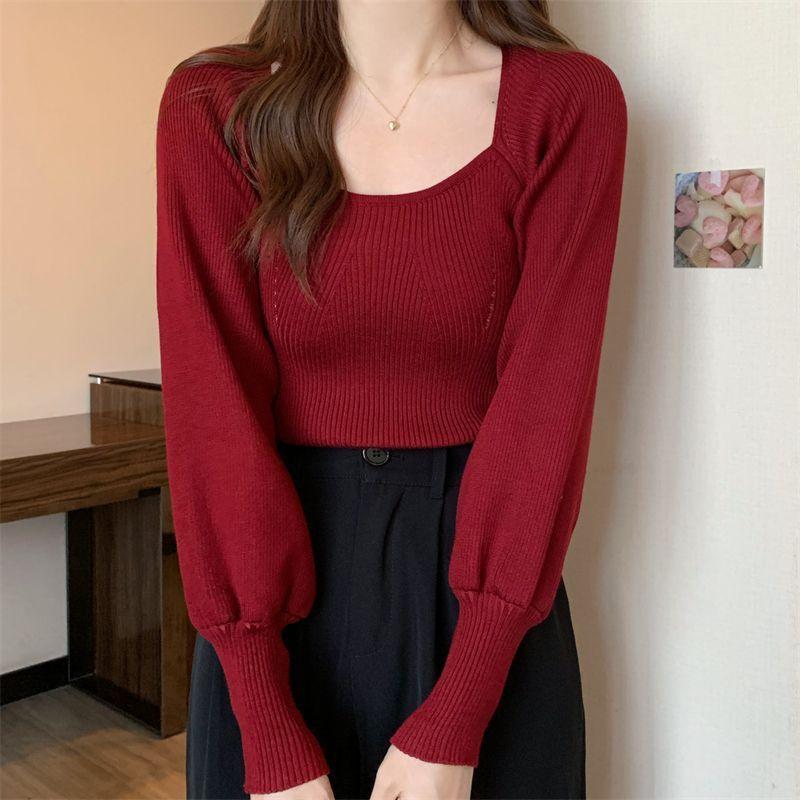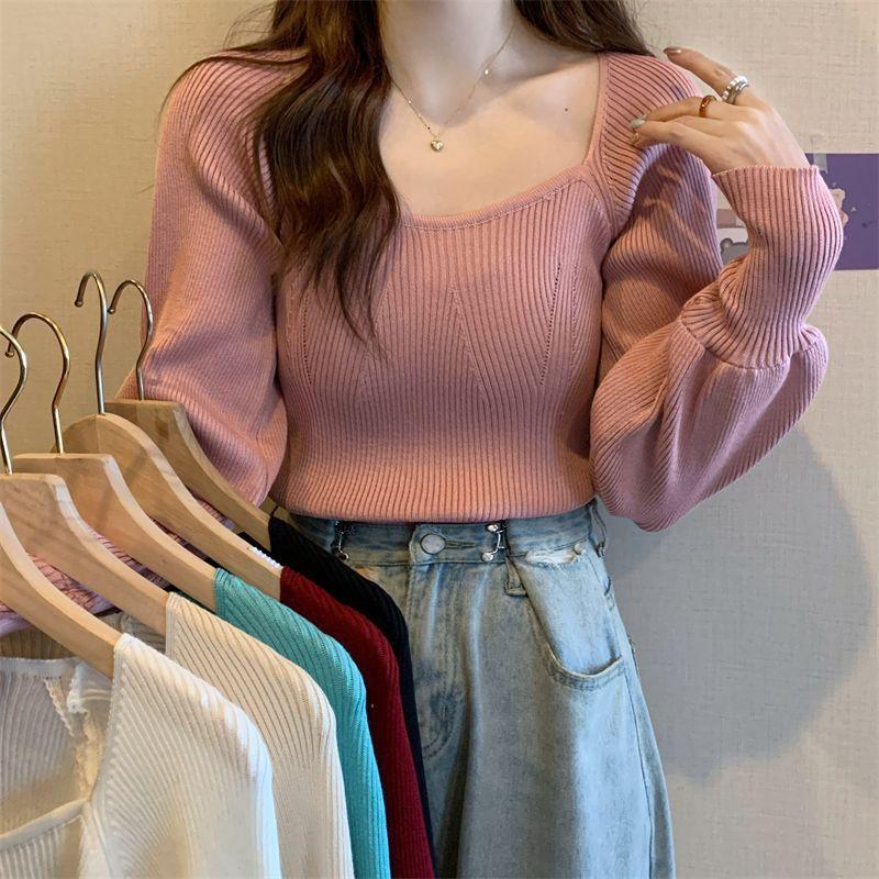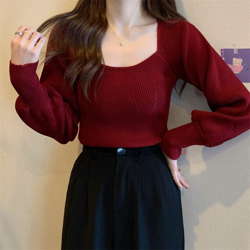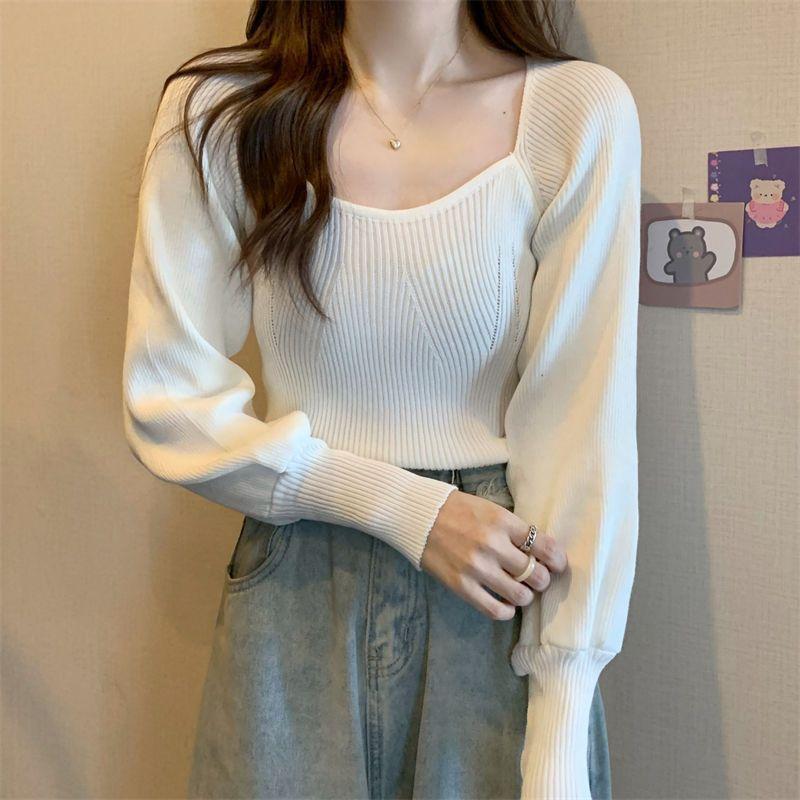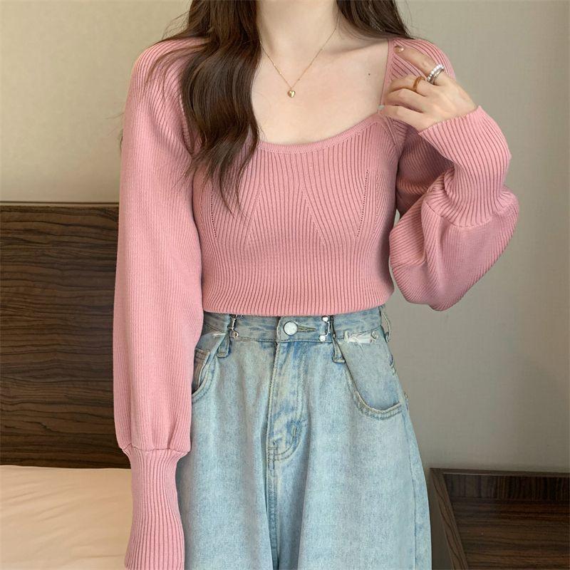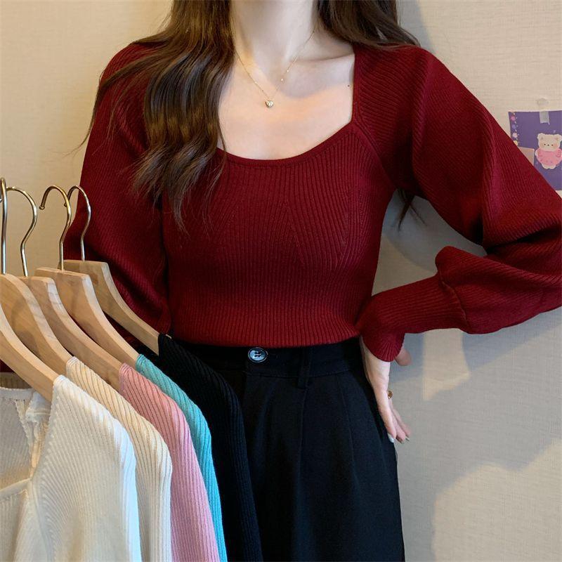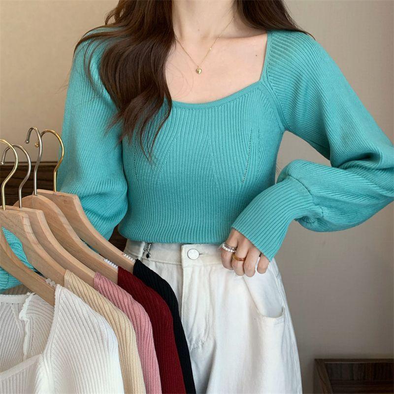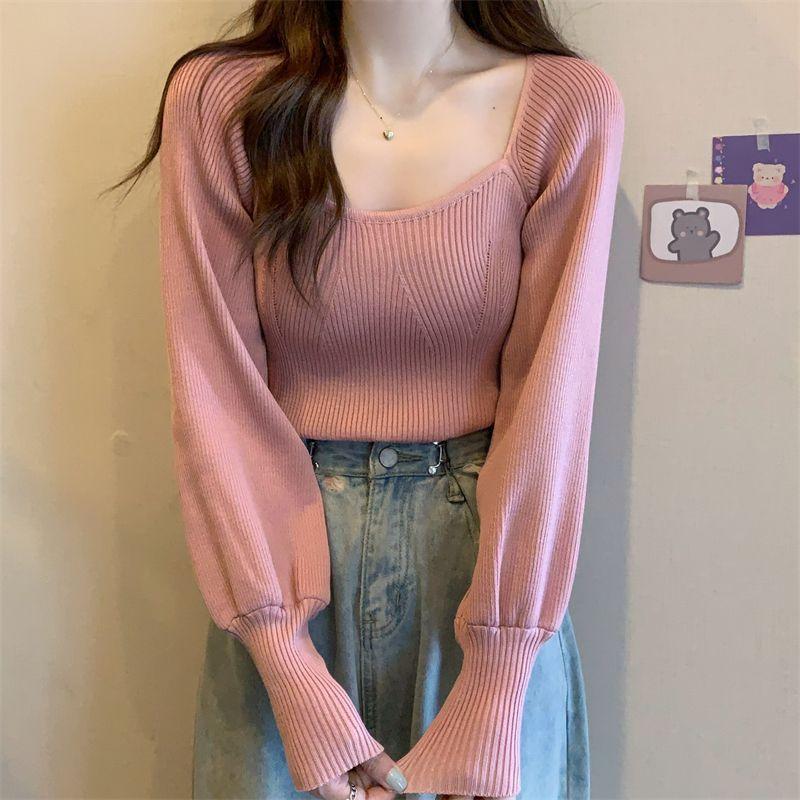 Suéter de cuello cuadrado Design Sense 2024 para mujer, suéter básico corto ajustado de primavera y otoño, moderno y versátil.